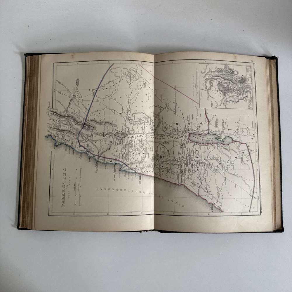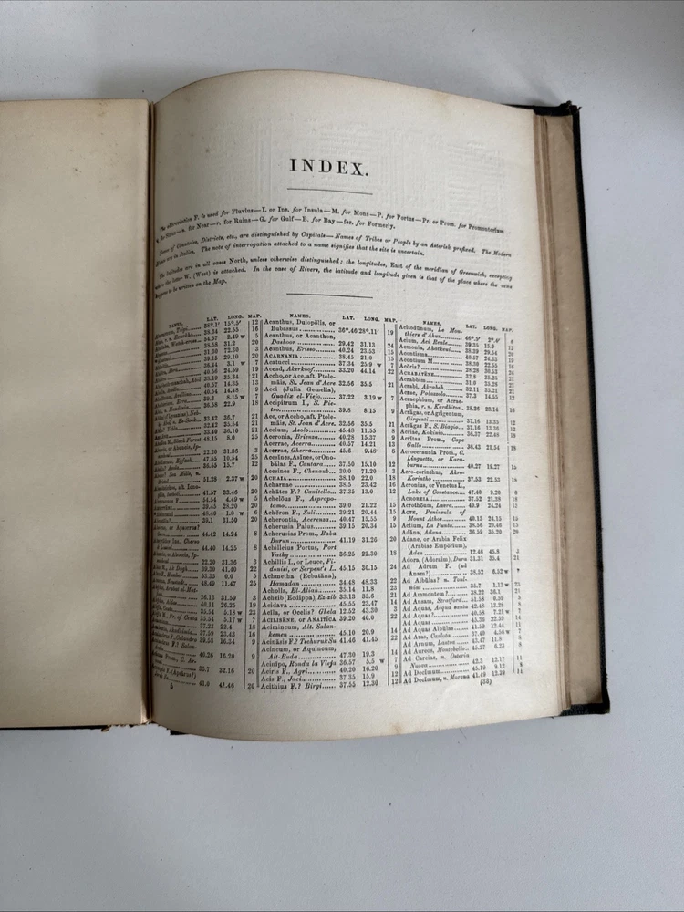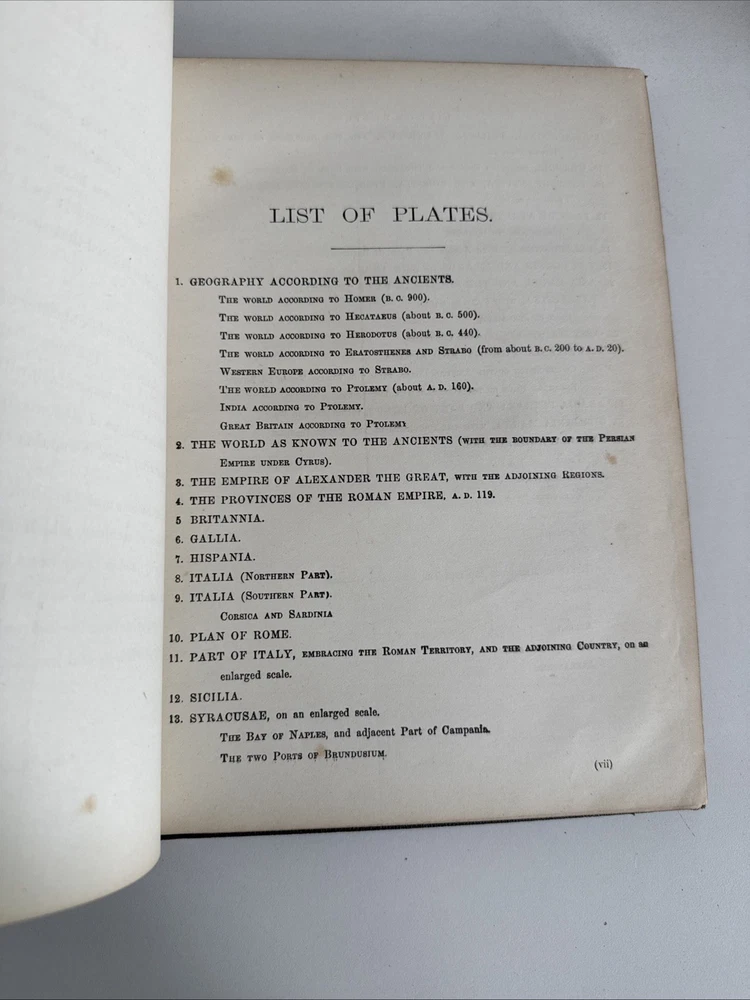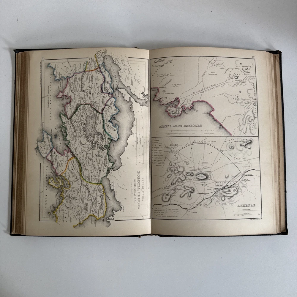 An Atlas of Classical Geography constructed by William Hughes, and Edited by George Long With a sketch of classical geography, and other additions, by the American editor Containing 52 maps and plans on 26 plates. Index in back. Published in 1856 by Sheldon & Company in New York. Hardcover. Leather spine. Condition: some wear to spine. Some general age and shelf wear to book. Name written inside. She tanning to pages, some dirt marks. Binding remains intact. Shipped for FREE!
