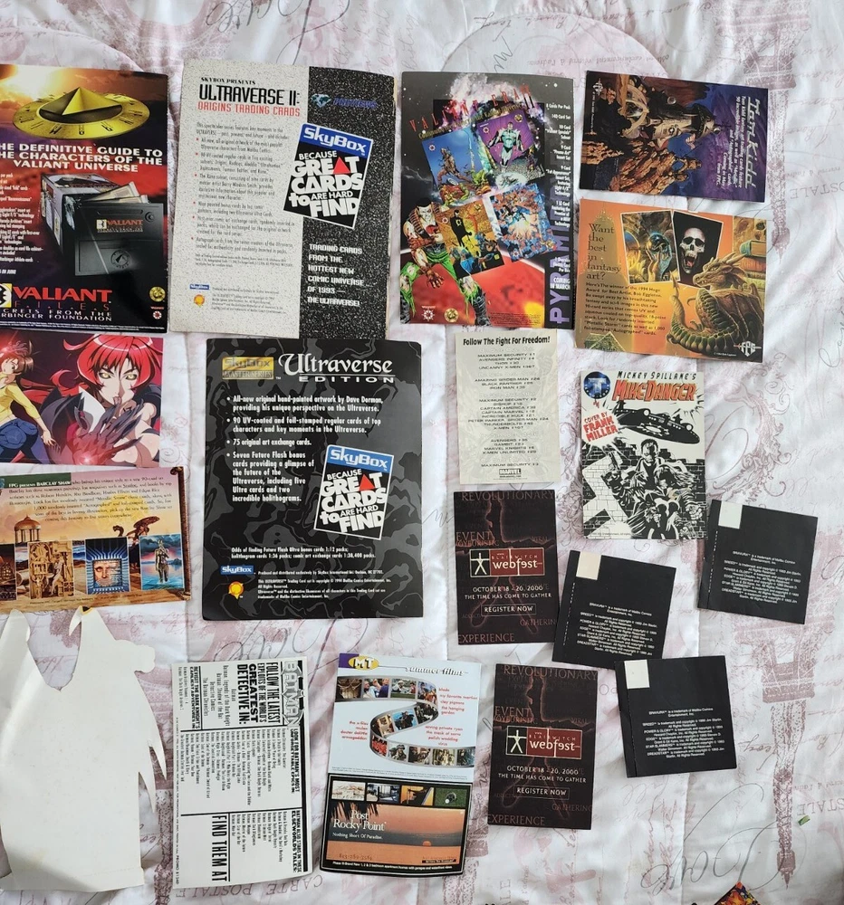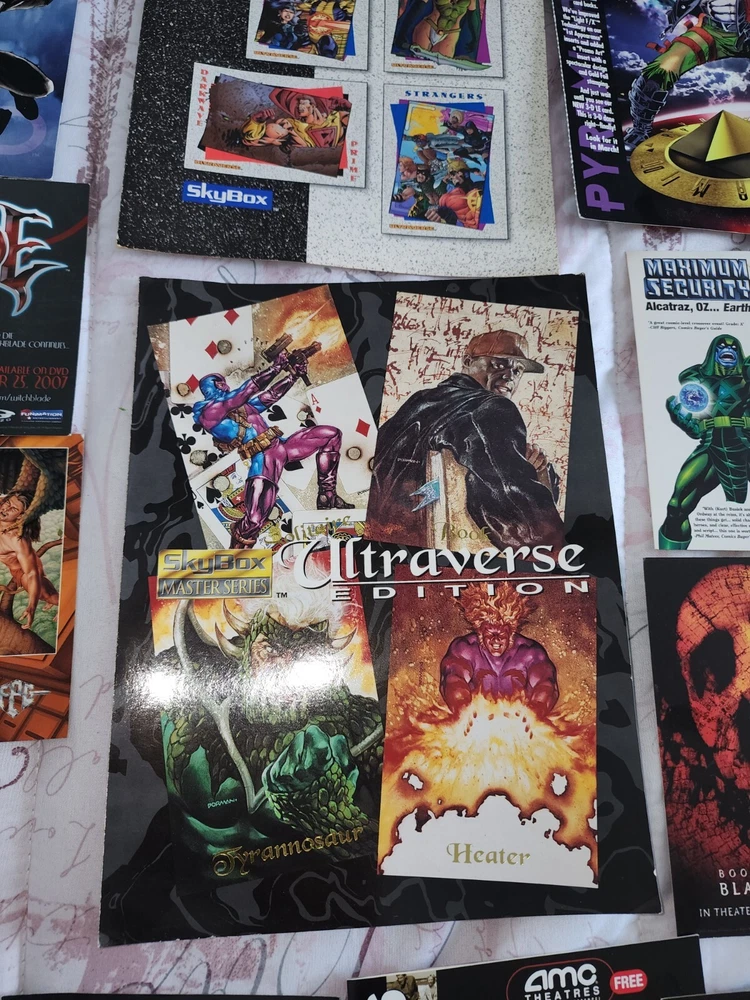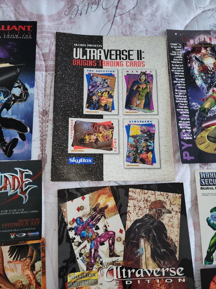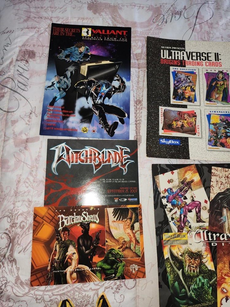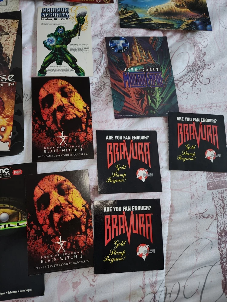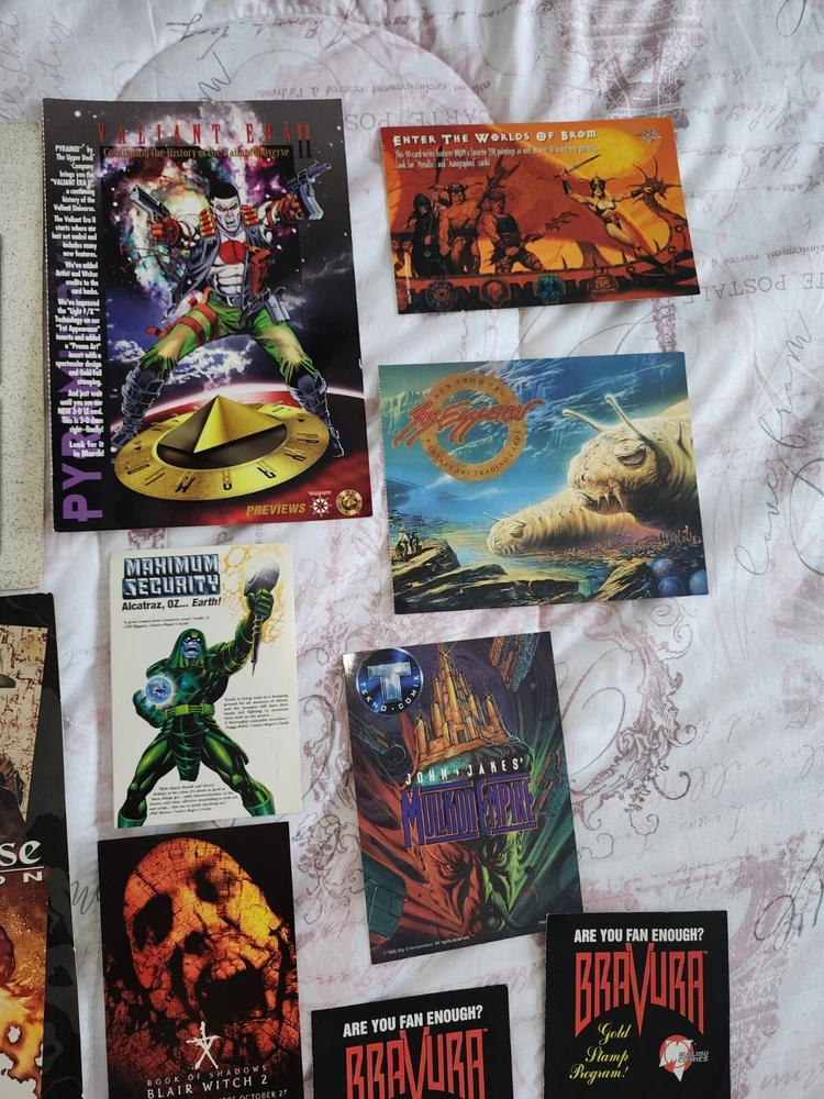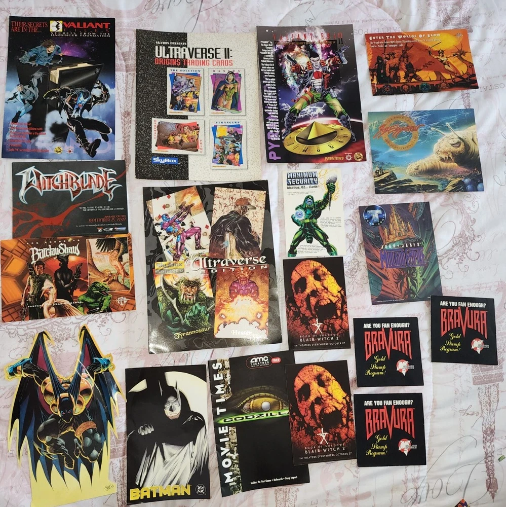 1988 Batman promo Bob eggleton fantasy art trading card Mullkon Empire Mikes danger Godzilla movie time Amc booklet 2 Blair witch 2 Tom Kidd, enter the worlds of brom Batman sticker has some bends Barclay Shaws Valiant files secrets from the harbinger foundation Witchblade Valiant Era II Marvel maximun security Alcatraz Oz... earth Ultraverse Ii Origing trading cards Ultraversw edition Bravura malibu comics (3)