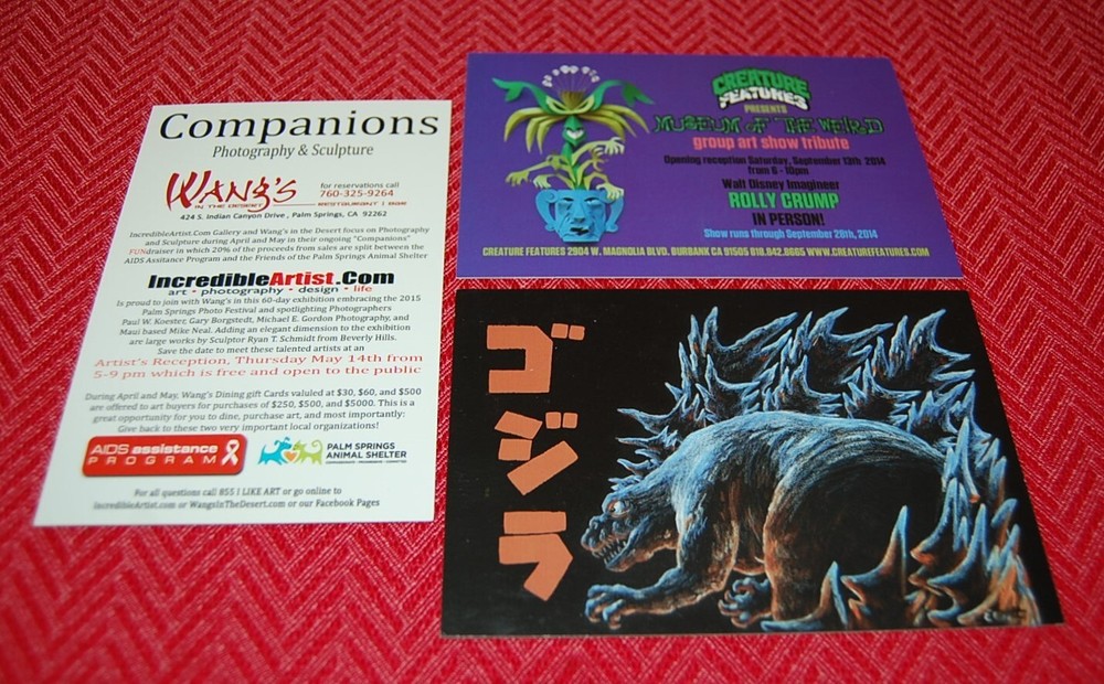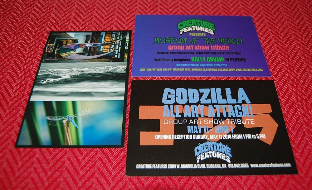 I TEM DESCRIPTION: This listing is for a very nice Lot of three (3) Vintage Ad Cards for Creature Features Presents Museum of the Weird, Creature Features Presents Godzilla All Art Attack!, Companions Photography & Sculpture at Wang's in the Desert Palm Springs . The cards measure about 6" x 4" in size. Cards are in Good Plus to Very Good Plus condition with few surface marks and lightly bumped and small bent corners . Please see the detailed photos for the actual condition of this item, as photos are always a very important part of the complete item description. 2024-03-13-MCFDCBK1PG49 U.S. Buyer pays the postage cost shown in the shipping calculator below. Many, but not all, Ad card listings will have two shipping options available. The more expensive option is for extra secure and protective thick, rigid, rain and moisture resistant USPS Ground Advantage Shipping, which allows tracking both on the USPS website and in your eBay purchase history. The second less expensive option is for eBay Standard Envelope shipping with the card(s) placed in a protective semi-rigid plastic top loader sleeve, when possible, and then placed into a standard envelope (if you do not see this least expensive service on another of my card listings, just ask and I will be happy to add that shipping service, if possible). This second service level allows up to three cards with a maximum combined value of no more than $20 shipped together, and these letters can be tracked through your eBay purchase history, but NOT through the USPS website. With either service it is then just $1.00 additional shipping cost for a second Ad card purchased, and then only $.50 more for each additional Ad card shipped with this one to the same address. To qualify for this combined shipping offer, all items should close on the same day and all MUST be paid for together in the same single payment through eBay, so be sure to request a new total from seller before remitting payment if you win more than one item! Please see my other listings for more collectible Advertising cards and many other great items! HELLO! EACH EBAY SELLER HAS THEIR OWN UNIQUE TERMS OF SALE, SO PLEASE TAKE JUST A MOMENT TO READ THIS LISTING PAGE. REMEMBER, BY PURCHASING OR PLACING A BID YOU ARE AGREEING TO THESE TERMS IN ADVANCE. THANK YOU! GENERAL INFORMATION : Please note that my thousands of listed items come from many different sources. While ours is a smoke, furred and feathered pet-free home, some items may have come from homes or businesses with smokers and/or pets. If you are very sensitive to these issues, please contact me before bidding on an item. All items are guaranteed to be as described and to arrive in that same condition. However, because I offer many different kinds of items, many in used and/or vintage condition, including vintage photographic, electrical and electronic components and equipment, all items are sold without additional or extended warranty of any kind. BEST OFFERS: Although my asking prices are already very fair, and in almost every case are based upon the sale price of the same or very similar items that have previously sold on eBay, I do allow "Best Offers" on most of my fixed price listings. This is to make buying even more fun and to allow buyers to feel that they got a really good deal when their offer is accepted! Please do not abuse this option and send "Low-Ball" offers that are only a fraction of my asking price, they will never be accepted. Try reasonable offers like 10%, 15%, or on some items maybe even as much as 20% under my asking price, and your offer may likely be accepted. Just be reasonable and we can both have fun with this option! I do try to respond to every offer received, but remember that eBay has all offers expire after just one day, so if I am away from my office for just a day or two, I may never get a chance to respond to your offer, so if you do not receive a reply from me, be sure to resend your offer if it has expired before I could respond. SHIPPING CHARGES & SCHEDULE : Sellers are ONLY allowed to ship items to the address provided to us by eBay with your payment. Be certain to have the correct address listed BEFORE you remit payment. Please do NOT ask me to ship to a different address. The auction winner or purchaser will pay the shipping charges as shown in the eBay shipping calculator on the listing page. All items shipped through the USPS now include Package Tracking for your convenience. I ship at least twice each week, normally on Wednesday and Friday (subject to change for occasional holidays, vacations, family obligations, etc.). Your payment must be received and processed before 9AM Pacific Time on a shipping day to ship that same day. Because of this twice weekly shipping schedule, I am not normally able to offer rush next day or expedited shipping, but you may certainly ask to upgrade your shipping to a faster shipping method at additional cost if you need to receive an item quickly. USPS SHIPPING TIMES : PLEASE NOTE THAT ALL CARRIERS SOMETIMES EXPERIENCE DELAYS IN SHIPPING TIMES. PLEASE BE EXTRA PATIENT DURING THIS DIFFICULT TIME FOR BOTH BUYERS AND SELLERS, ESPECIALLY WITH USPS MEDIA MAIL AND USPS GROUND ADVANTAGE SHIPPING, WHICH IS SOMETIMES TAKING FOUR WEEKS OR MORE IN TRANSIT . Please understand that no seller has any control over carrier shipping times, and that the Expected Delivery date provided by eBay is just their estimate based on normal average shipping times, it is NOT a guaranteed delivery by date. Allow the following shipping times depending upon your distance from CA 92025 and the shipping method for which you selected and/or paid: USPS First Class Package Mail averages 1-5 business days, but can sometimes take up to four weeks. USPS Priority Mail averages 1-3 business-days, but can take up to two weeks. USPS Media Mail averages 3-10 business-days, but can sometimes take over one month. Seasonally, especially during the Holiday Season, the mails can take even longer. Ple