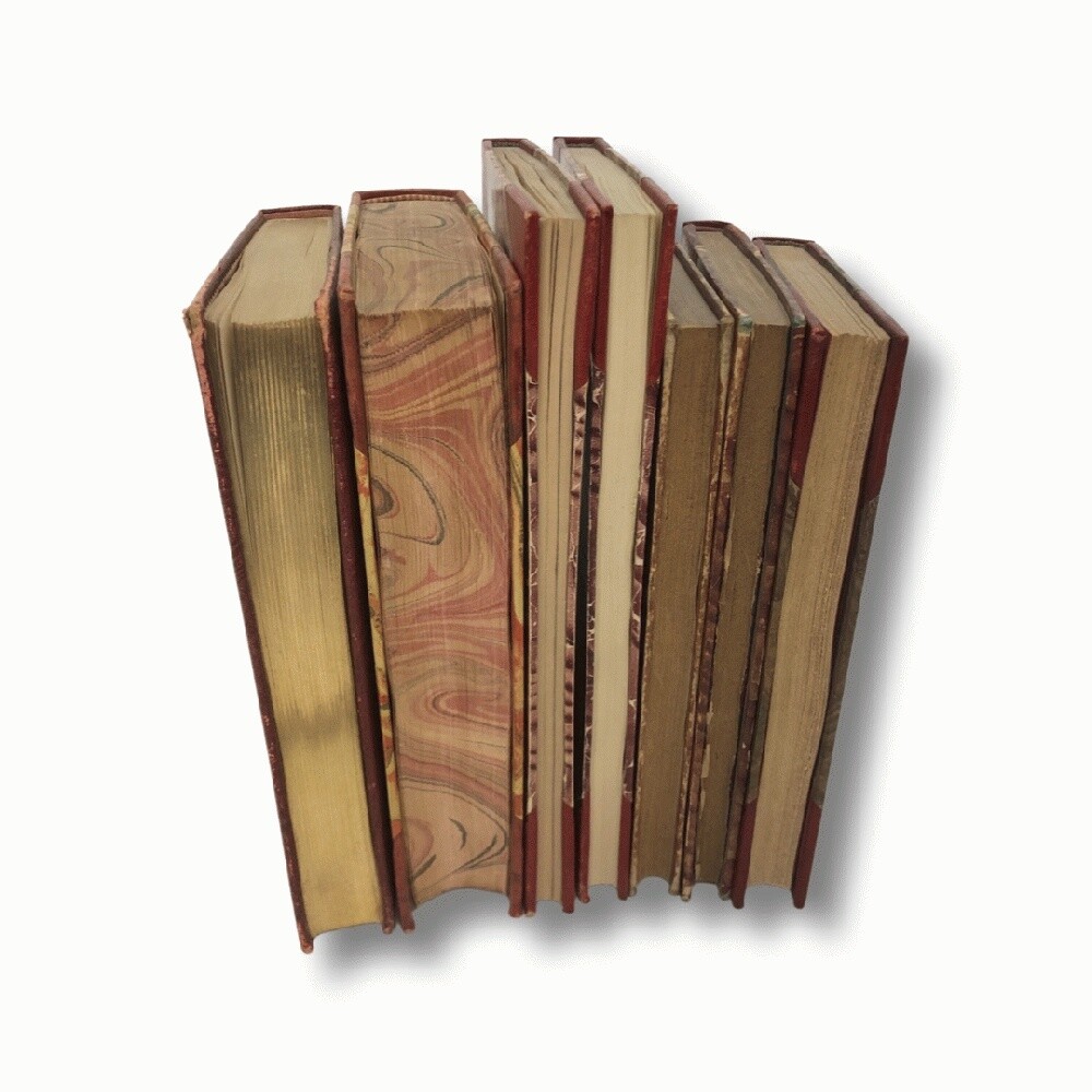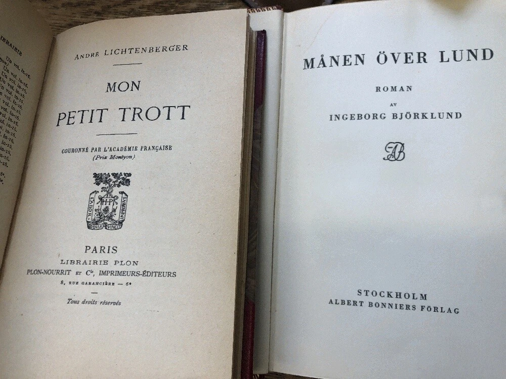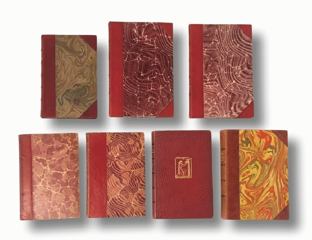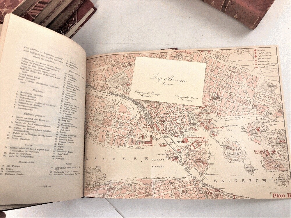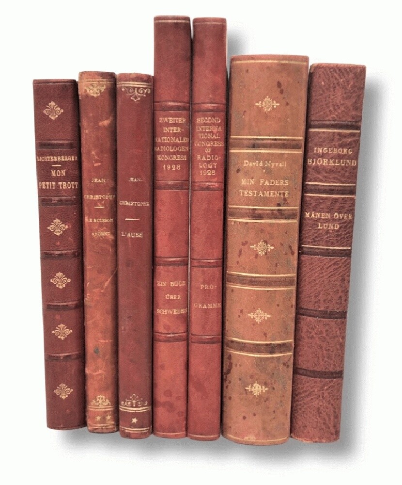 Lot of 7 Leather Decorataor in Swedish French English +2 Maps~Marbled Author: David Nyvall; Romain Rolland; Andre Lichtenberger; Ingeborg Bjorklund Publisher: Various Publication Date: 1920s-1930s Qty Available: 1 Condition: Used: Very Good Sku: 045094 Notes: Lot of 7 (six are three-quarter leather and one is full leather) 1920s-1930s hardcovers in FINE BINDING with marbled boards and endsheets, raised ribs to the spine and bright gilt title and decorations. Three are in Swedish, One is in English and three are in French. The tallest are 8.75" tall. Shortest is 7" and together they take up 6.5" of linear space on the shelf. No scent. Two fold-out Maps of sections of Stockholm with English legend. Your purchase benefits literacy and summer reading programs in Cincinnati and Hamilton County, Ohio. We ship every business day. All books ship in cardboard bookfolds with delivery confirmation. Sets or unusually heavy items ship in a box. Please contact us for more information.