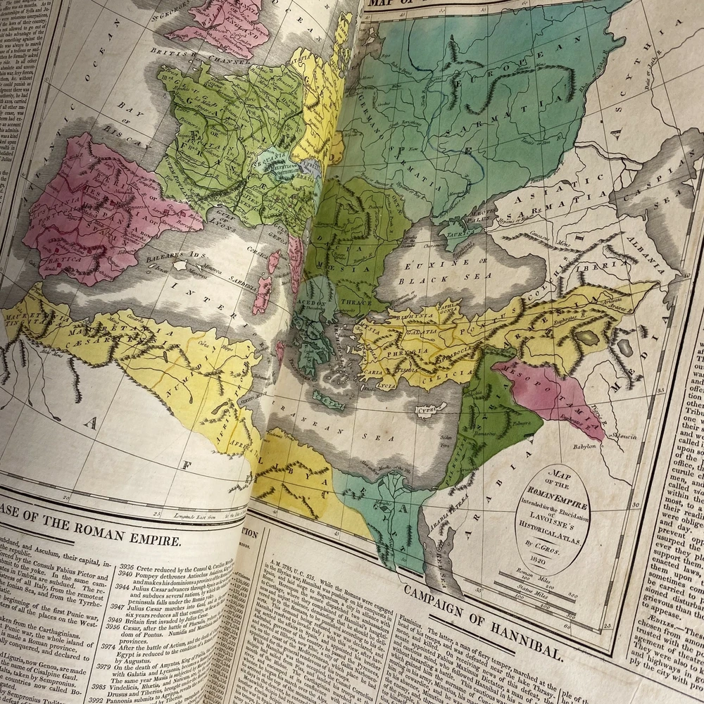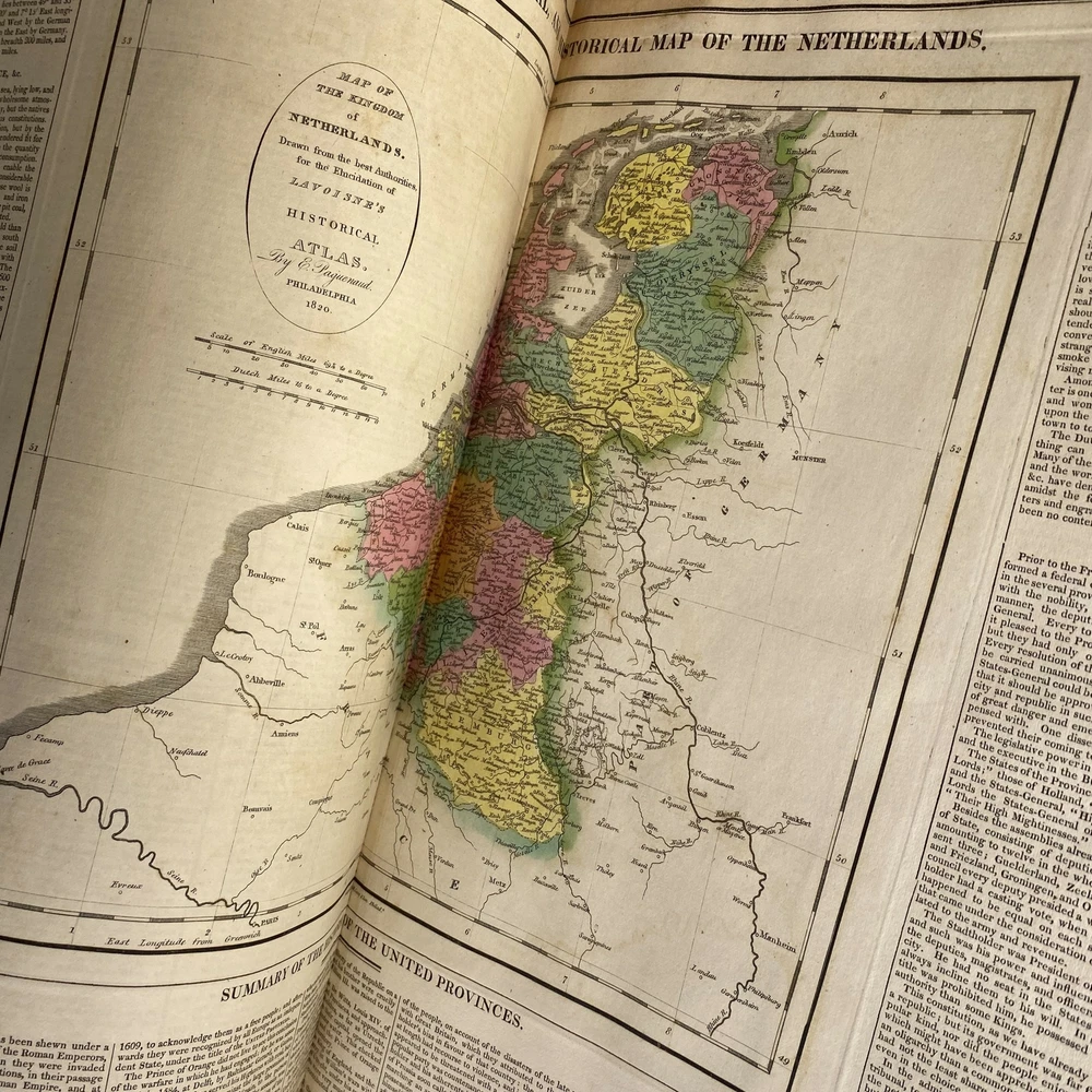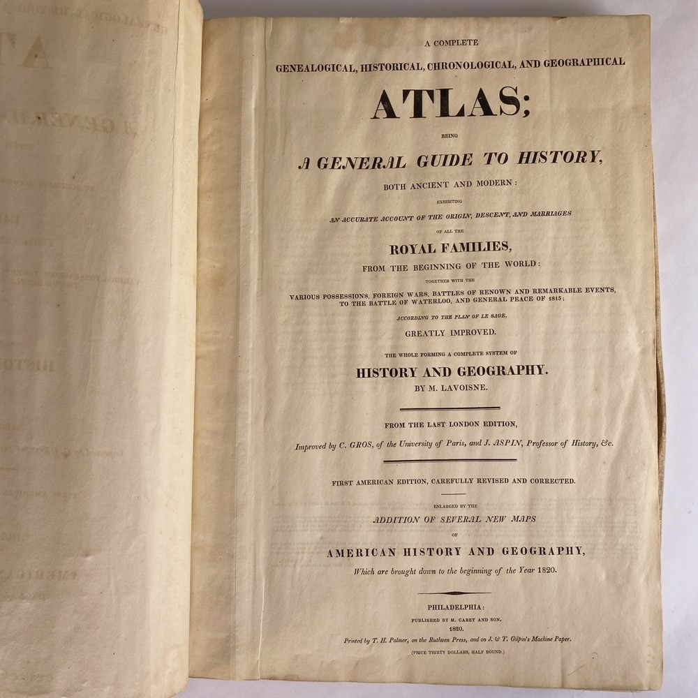 [ATLASES AND MAPS] A COMPLETE GENEALOGICAL, HISTORICAL, CHRONOLOGICAL, AND GEOGRAPHICAL ATLAS; BEING A GENERAL GUIDE TO HISTORY, BOTH ANCIENT AND MODERN: EXHIBITING AN ACCURATE ACCOUNT OF THE ORIGIN, DESCENT, AND MARRIAGES OF ALL THE ROYAL FAMILIES FROM THE BEGINNING OF THE WORLD: TOGETHER WITH THE VARIOUS POSSESSIONS, FOREIGN WARS, BATTLES OF RENOWN AND REMARKABLE EVENTS, TO THE BATTLE OF WATERLOO ... THE WHOLE FORMING A COMPLETE SYSTEM OF HISTORY AND GEOGRAPHY Author: M. Lavoisne Title: [ATLASES AND MAPS] A COMPLETE GENEALOGICAL, HISTORICAL, CHRONOLOGICAL, AND GEOGRAPHICAL ATLAS; BEING A GENERAL GUIDE TO HISTORY, BOTH ANCIENT AND MODERN: EXHIBITING AN ACCURATE ACCOUNT OF THE ORIGIN, DESCENT, AND MARRIAGES OF ALL THE ROYAL FAMILIES FROM THE BEGINNING OF THE WORLD: TOGETHER WITH THE VARIOUS POSSESSIONS, FOREIGN WARS, BATTLES OF RENOWN AND REMARKABLE EVENTS, TO THE BATTLE OF WATERLOO ... THE WHOLE FORMING A COMPLETE SYSTEM OF HISTORY AND GEOGRAPHY Publication: Philadelphia: M. Carey & Sons, 1820 Edition: First American Edition Description: Half Leather. First American Edition. The First American Edition of A Complete Genealogical, Historical, Chronological, and Geographical Atlas, executed by Matthew Carey in 1820. Complete with all maps and charts of 71 double-page plates -- including the important maps of the "United States of America" by John Melish, a 2-page maps showing Texas as a separate country and most of the Louisiana Purchase as Missouri Territory The copy with a hand made buckram cover, stitched to hold it in place, which has on it the signature of Thos. Picton, and the stamp of one Joseph Malcomsom Lurgan. Several of the maps have some dampstain, including the Melish map of the United States. The color throughout is strong and attractive. Very Good binding. Seller ID: 292352 Subject: History & Military Black Swan Books Richmond VA We specialize in antiquarian books, classic literature, the Civil War, Viriginiana, travel, art, children's books, and other subject areas, including religion and philosophy . Terms Payment via PayPal is preferred. All orders ship within two [2] business days, Monday through Friday by standard mail, USPS Media Mail. Combined orders and expedited shipping is available. Please contact us for a shipping quote before ordering. All items are guaranteed as listed and described. Any item may be returned within 30 days for any reason in the condition is which they were sent. This listing was created by Bibliopolis.