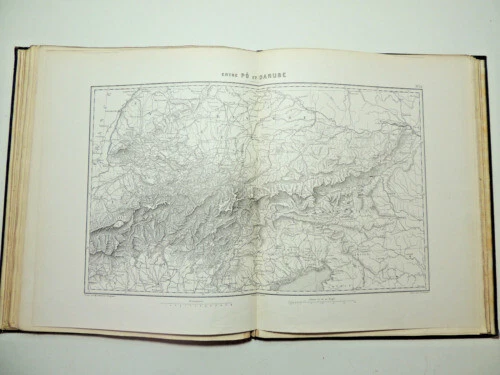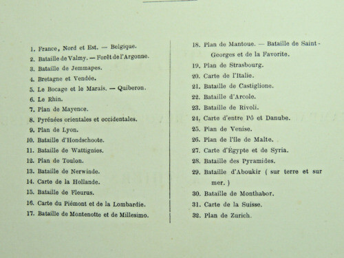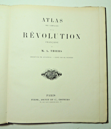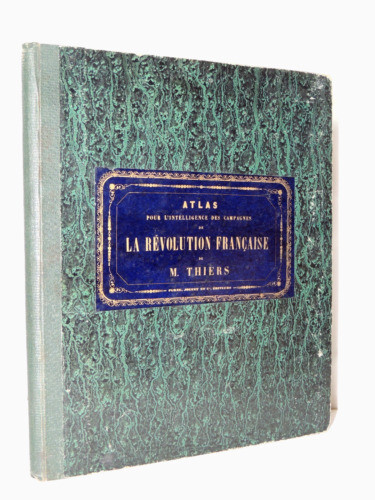 M.A Thiers. Atlas des campagnes de la Révolution Française complet de ses 32 planches sur onglet dressées par Th. Duvotenay - gravées par Ch. Dyonnet. Table: 1. France, Nord et Est - Belgique. 2. Bataille de Valmy - Forêt de lArgonne. 3. Bataille de Jemmapes. 4. Bretagne et Vendée. 5. Le Bocage et le Marais - Quiberon. 6. Le Rhin. 7. Plan de Mayence. 8. Pyrénées orientales et occidentales. 9. Plan de Lyon. 10. Bataille dHondschoote. 11. Bataille de Wattignies. 12. Plan de Toulon. 13. Bataille de Nerwinde. 14. Carte de la Hollande. 15. Bataille de Fleurus. 16. Carte du Piémont et de la Lombardie. 17. Bataille de Montenotte et de Millesimo. 18. Plan de Mantoue - Bataille de Saint-Georges et de La Favorite. 19. Plan de Strasbourg. 20. Carte de lItalie. 21. Bataille de Castiglione. 22. Bataille dArcole. 23. Bataille de Rivoli. 24. Entre Pô et Danube. 25. Plan de Venise. 26. Plan de lîle de Malte. 27. Carte dEgypte et de Syrie. 28. Bataille des pyramides. 29. Bataille dAboukir (sur terre et sur mer). 30. Bataille du Monthabor. 31. Carte de la Suisse. 32. Plan de Zürich volume in-4, 245x295, cartonnage éditeur Paris Furnes sans date , vers 1840/1860.