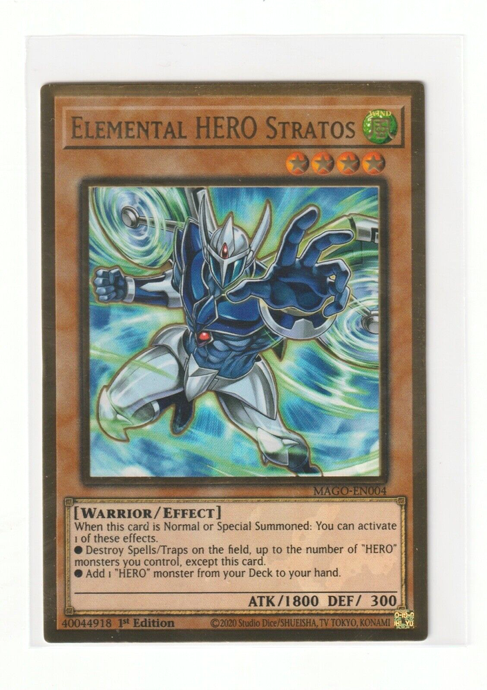 The product is a "Elemental HERO Stratos" card from the Premium Gold set of Yu-Gi-Oh! TCG. It is a Gold Rare 1st Edition card in Near Mint condition. This Monster card is identified by the code MAGO-EN004.