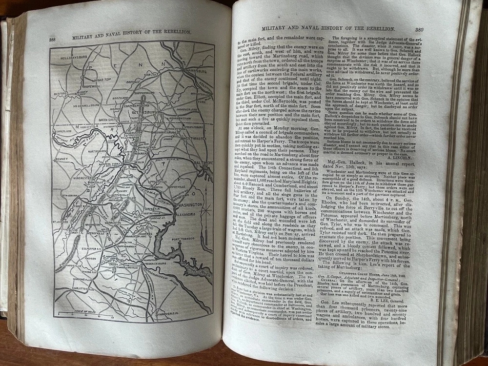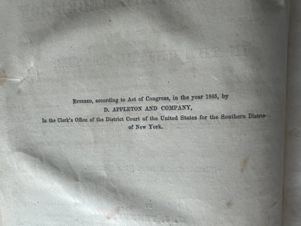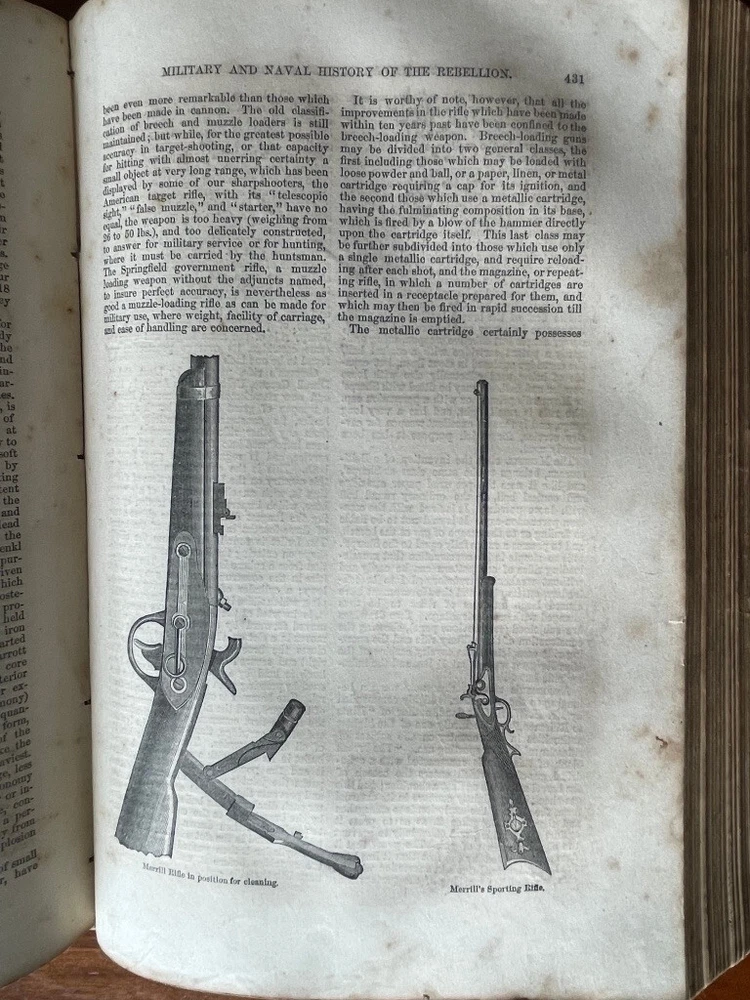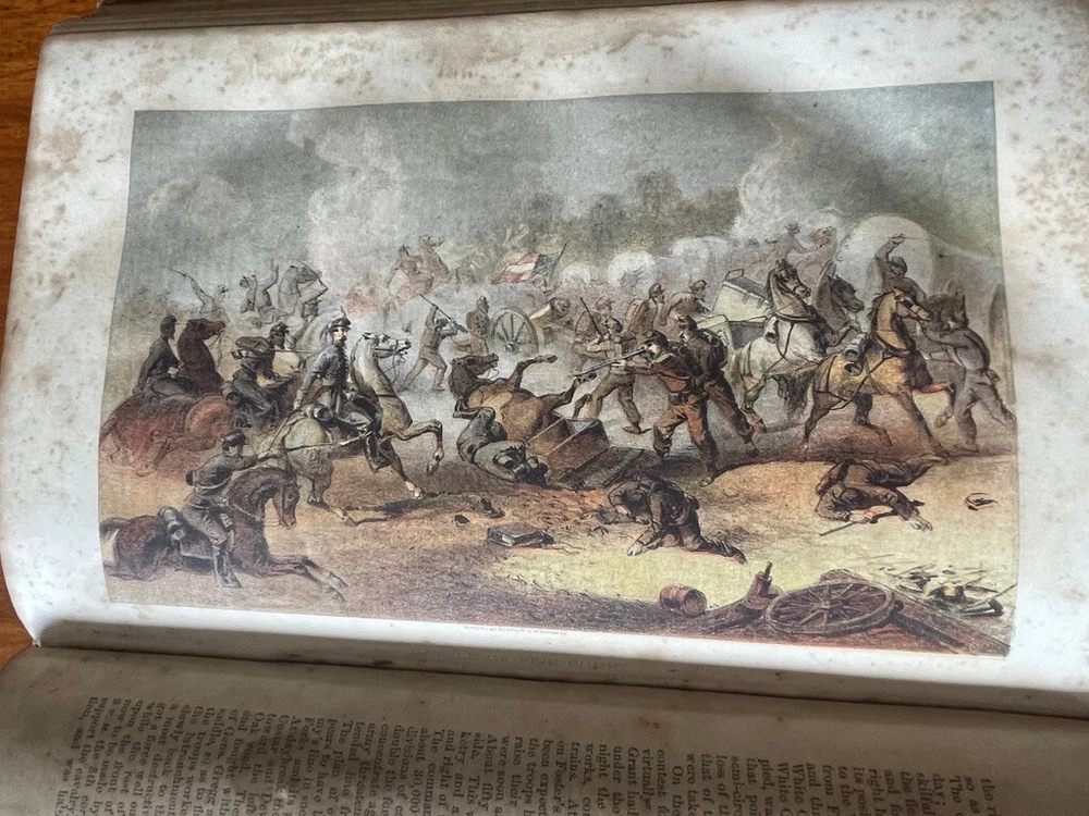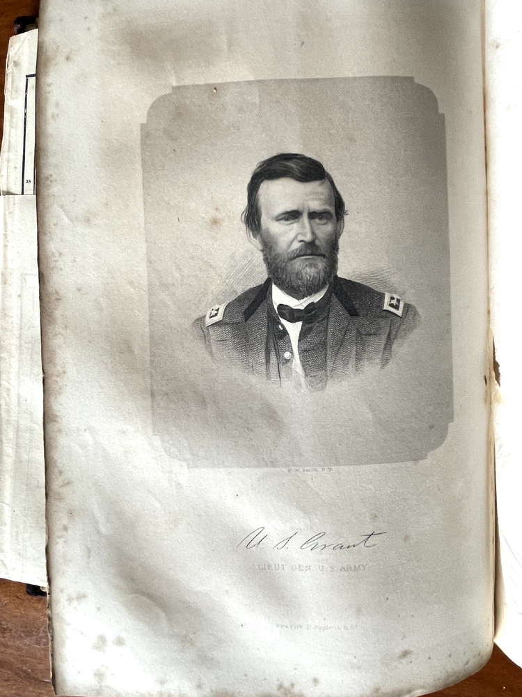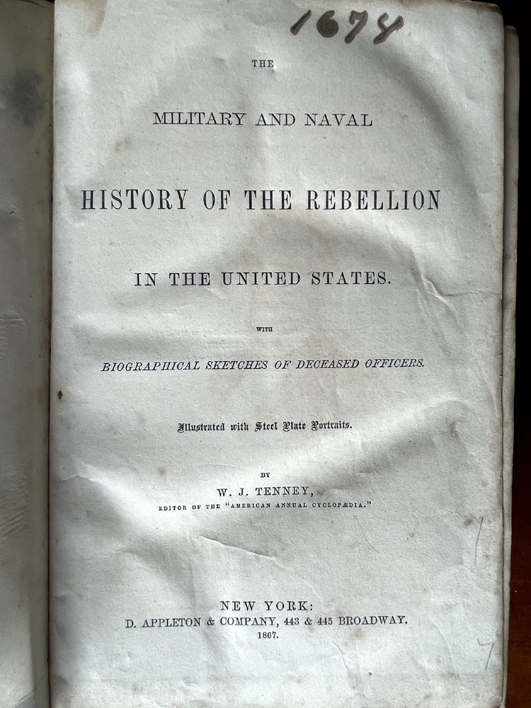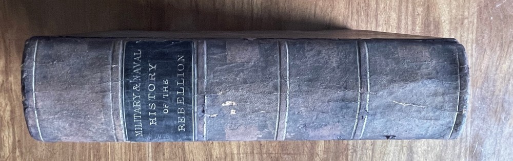 Up for sale is a full leather bound book titled "The Military And Naval History of the Rebellion in the United States" by W. J. Tenney. Contains Biographical Sketches of Deceased Officers, Illustrate with Steel Plate Portraits. Filled with illustrations throughout, some of which are in color. Contains one large fold out map of the Railways of the Southern States. The map is 15" by 23" in size. Published by D. Appleton, New York, 1867 printing. 843 pages, 7" by 10 1/4" in size. The leather bound book is in good condition, with wear to the covers and spine. Some cracking to the leather spine, The covers hinges are cracked, but binding is firm. Ink number marks on the top of the title page, no other markings. There is mild foxing throughout. The map is in good condition, with repairs to the back side of the map. Buyer to pay $8.00 for shipping. International buyers must use ebay global shipping. Box 3