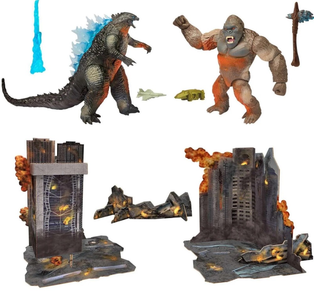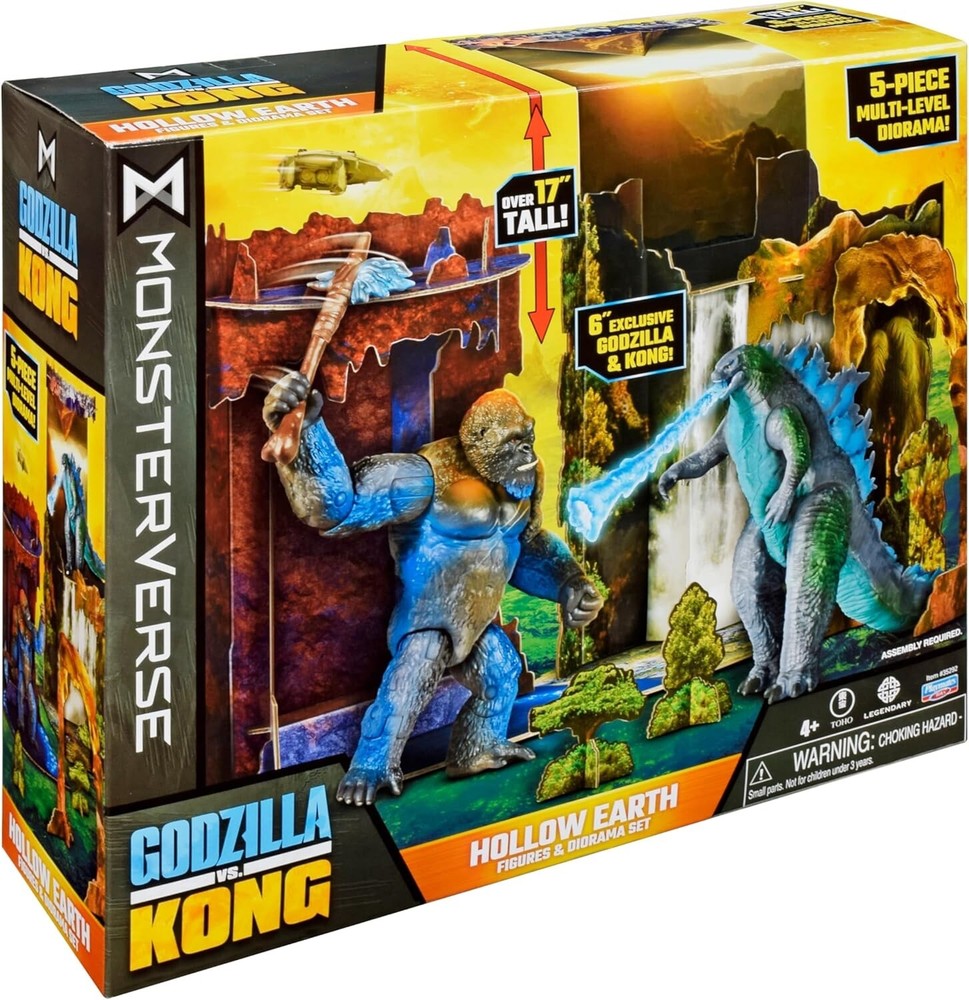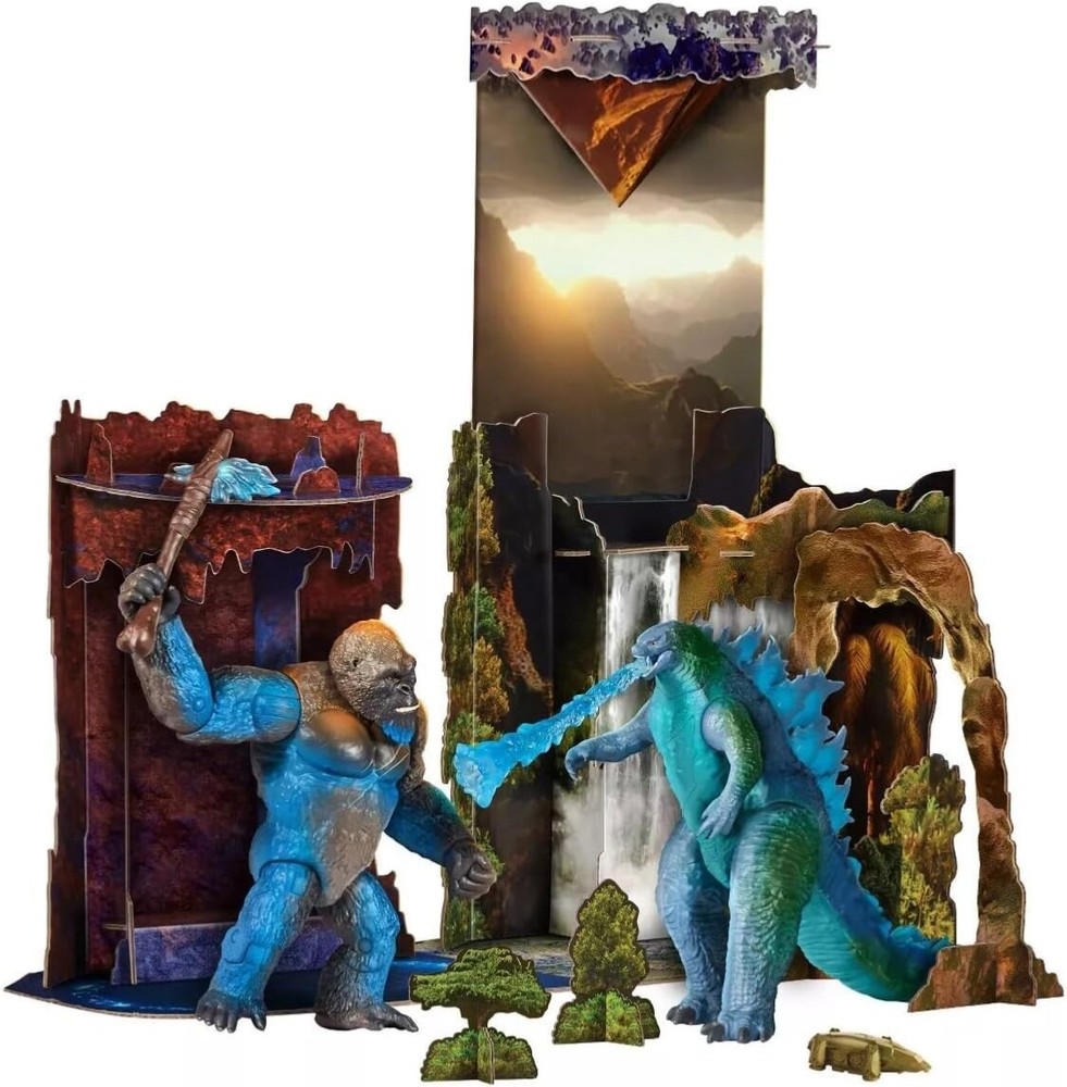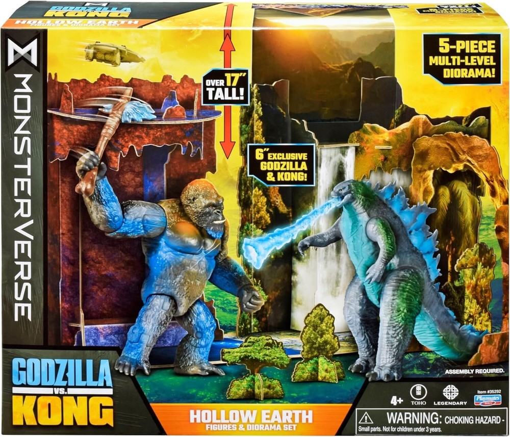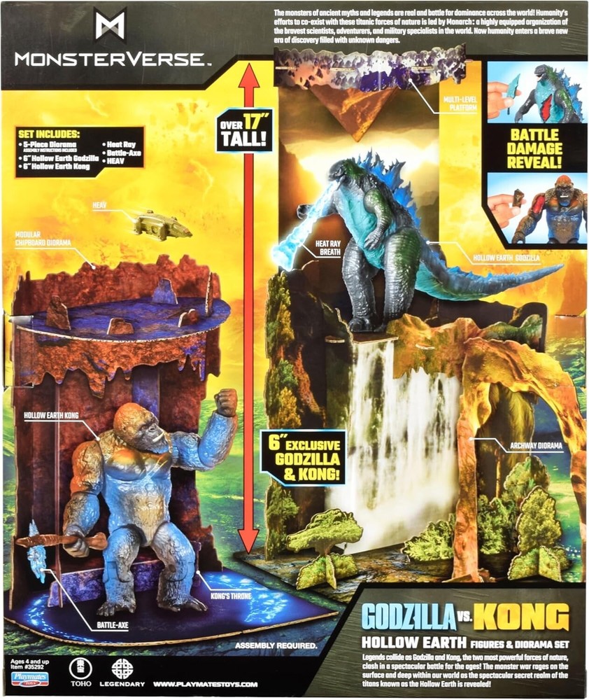 MONSTERVERSE HOLLOW EARTH GODZILLA vs KONG FIGURE & DIORAMA SET PLAYMATES Legends collide as Godzilla and Kong, the two most powerful forces of nature, clash in a spectacular battle for the ages. The monster war rages on the surface and deep within our world as the spectacular secret realm of the titans hidden world known as the hollow earth is revealed. This set features an over 17” tall 5-piece diorama and 6” tall Godzilla and Kong action figures. The action figures include the battle-damage feature. Also included with this set: Heat ray, battle axe and HEAV. Please see photos for details and full appreciation. All our items are carefully stored in a climate-controlled, smoke-free environment. We gratefully thank you for your consideration.