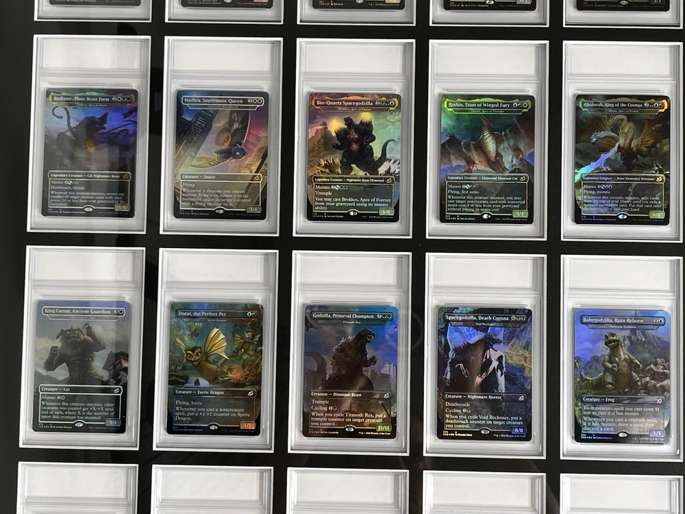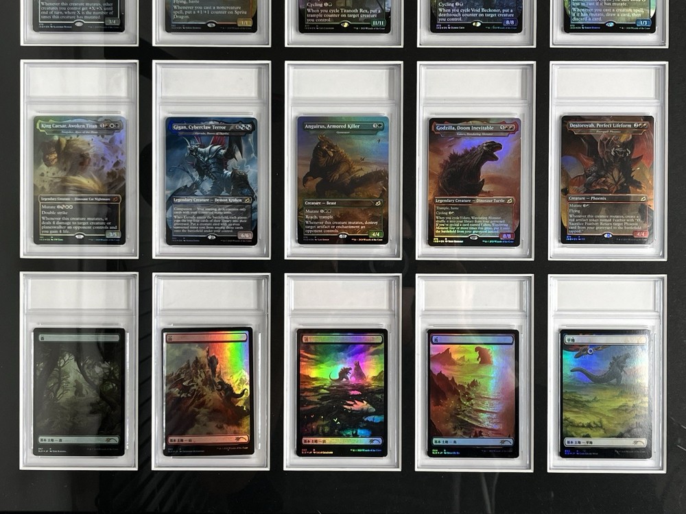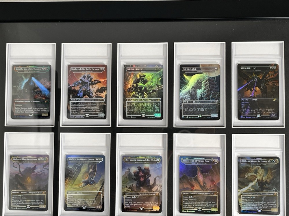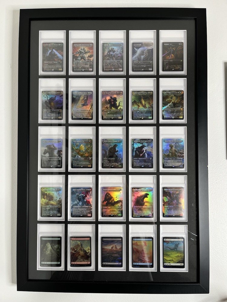 This is the full set of foil MTG Godzilla cards! All cards are in NM condition! They have all been placed in slabs and set in the display frame. These are NOT PSA graded cards. The display frame will fit PSA sized slabs. This item will be shipped as it is in the pictures. If you have any questions about it, please feel free to ask! If you need more pictures or anything else related to this item, I am always available for questions. Shipping & Returns: Item will be securely packaged and shipped promptly. Returns accepted within 60 days if the item is unused and in original condition. Important Buyer Information: Please carefully review all photos, item details, and description before purchasing. All items are sold as-is, exactly as described and shown. If you have any questions or need additional information, please ask before purchasing. I’m happy to help! Buyer is responsible for ensuring the item meets their expectations prior to purchase. Returns or cancellations due to buyer’s remorse (e.g., changing mind, size/color expectations, etc.) may not be accepted. Your purchase indicates agreement to these terms. Thank you!