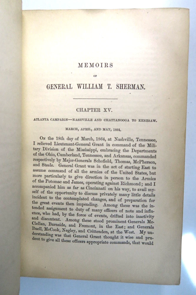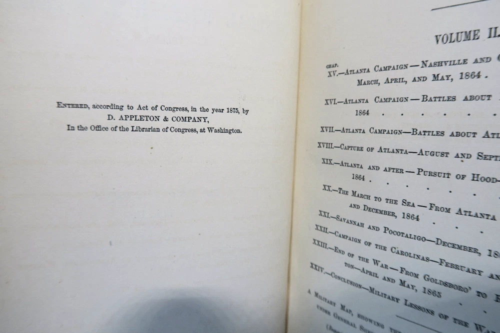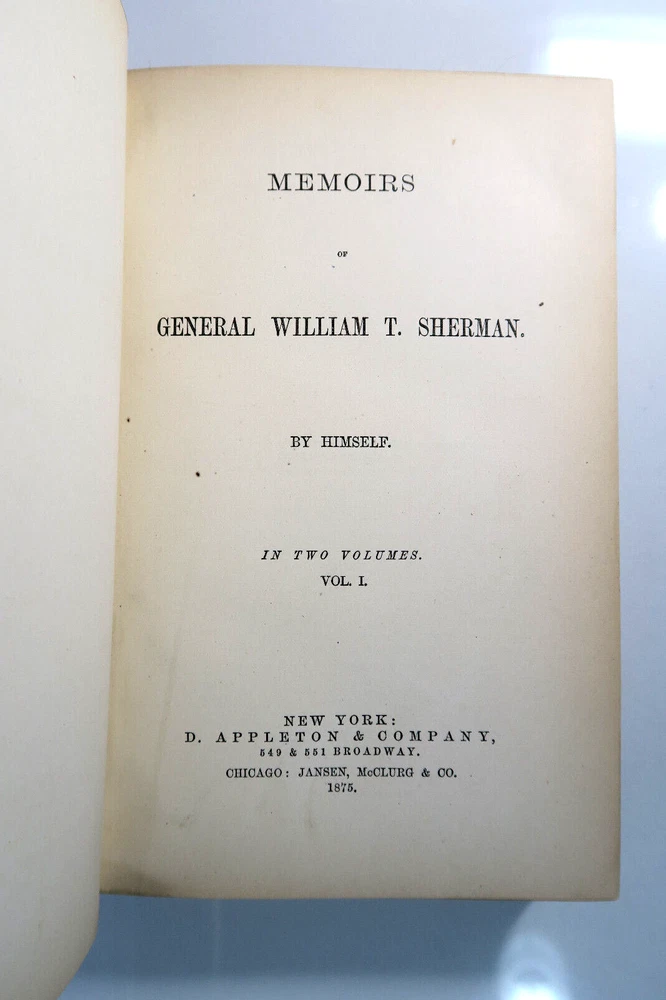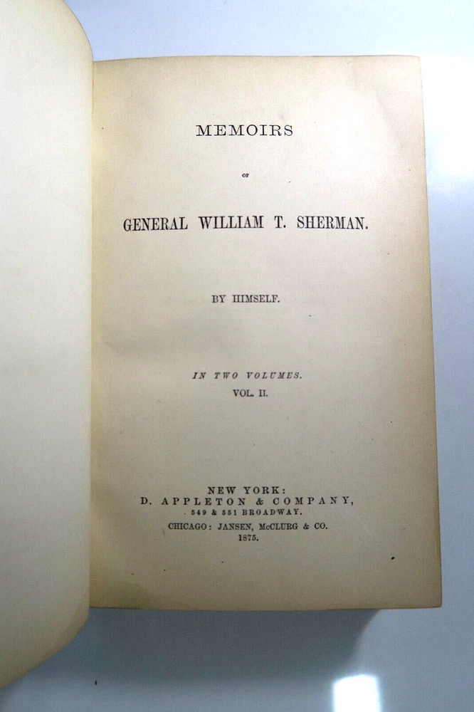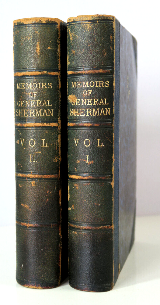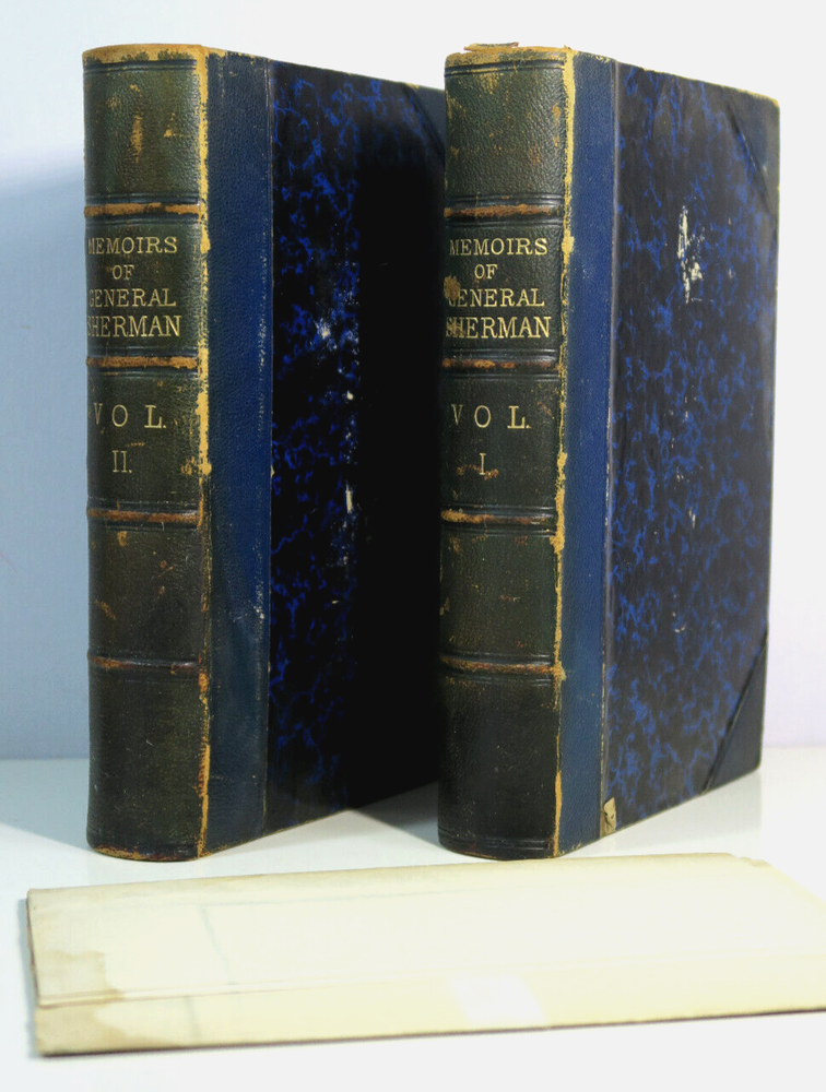 Memoirs of General Willian T Sherman 1875 1st Edition 2V Set w/Military Map Handwritten inscriptions on 1st pages 'Geo W Lay March 1888' (George William Lay 1860-1932) Vintage 2 Volume set leather bound hardcover books in good condition with firm spines and bindings, wear to leather corners and edges, board faces. Map has some splits at folds, water stains. Please inspect photos before purchasing and do not hesitate to contact us with any questions. Packed carefully and shipped quickly via USPS Media Mail. Please check our eBay store for many other Books. Shipping costs would be reduced for multiple items purchases.