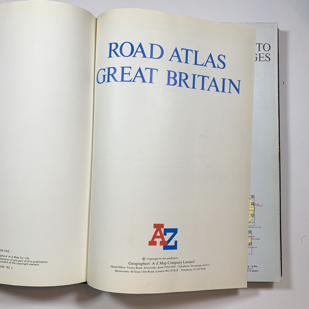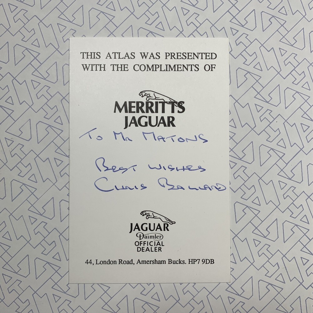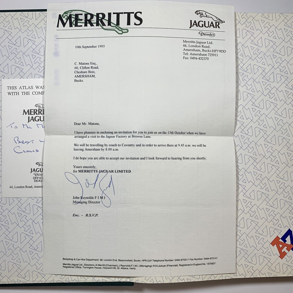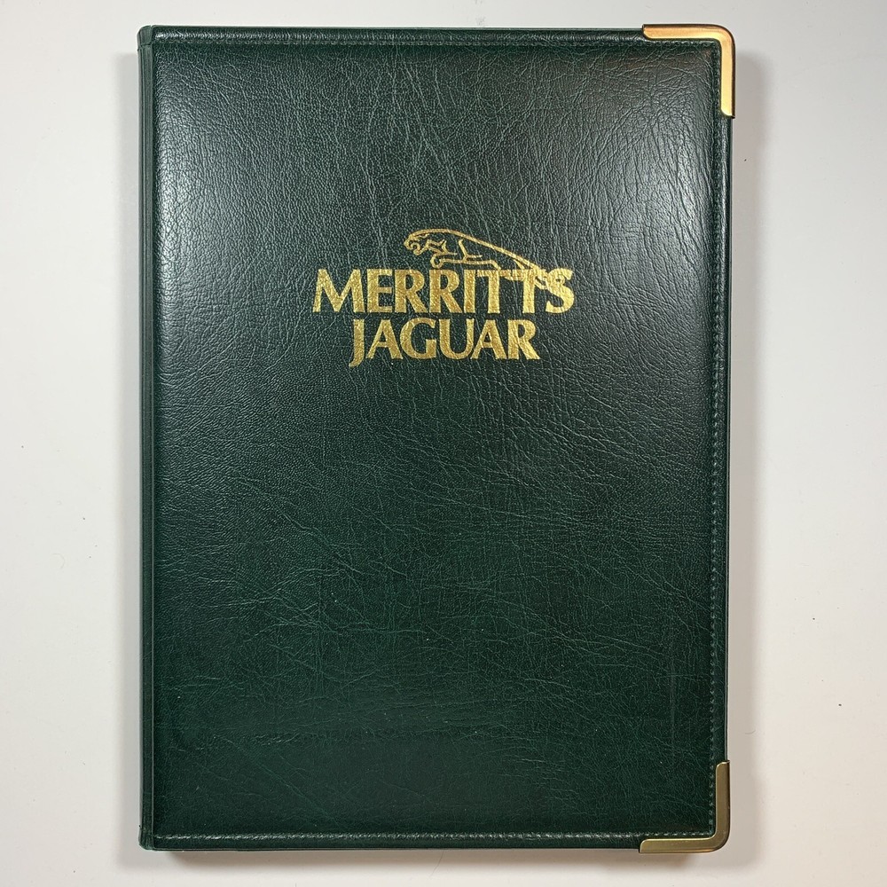 Merritts Jaguar portfolio in which is contained a 1993 A-Z Road Atlas of Great Britain. The 253 page road atlas is in near mint condition. It has a green faux leather binder with Merritts Jaguar logo in gold lettering on the front. Also inside is a letter from Merritts with an invitation to the owner to visit the Jaguar factory in 1993. The invitation is on Merritts letterhead. No flaws to note.
