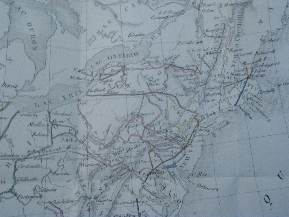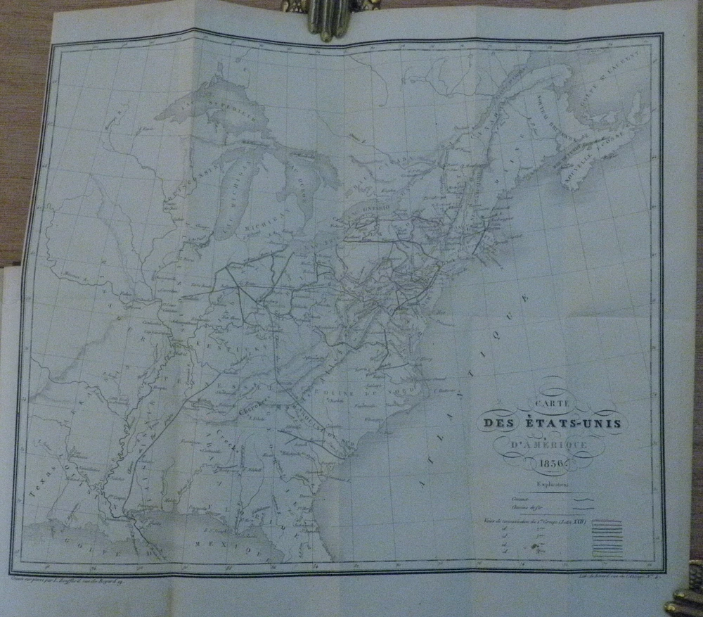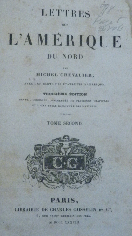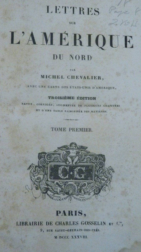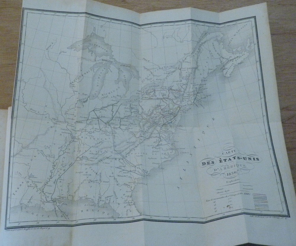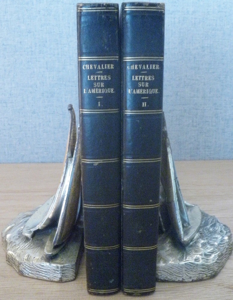 Michel Chevalier LETTRES sur L'Amerique du Nord - 1838 Color USA Folding Map Michel Chevalier LETTRES sur L'Amerique du Nord - 1838 Color USA Folding Map TITLE: Lettres sur l'Amerique du Nord : par Michel Chevalier, avec une carte des Etats-Unis d'Amerique. Troisieme edition revue, corrigee, augmentee de plusieurs chapitres et d'une table raisonnee des matieres. AUTHOR: Michel Chevalier PUBLISHER : C. Gosselin et cie, Paris DATE: 1838 Third Edition DESCRIPTION: 2 v. 22 cm. 2 vol. xvi, 439 p., [1] Folding map, ; 535-[1] p. CONDITION NOTES: VERY GOOD Corners bumped and some rubbing to the marbled boards. Dampstaining with a corner tideline up to page 30, vol.1 only. Scattered spotting elsewhere. Full caps, excellent page and cover attachment. Map is bright and properly folded. BINDING: Period black polished calf over marbled boards. Michel Chevalier (13 January 1806 – 18 November 1879) was a French engineer, statesman, economist and free market liberal. . In 1830, after the July Revolution, he became a Saint-Simonian, and edited their paper Le Globe. The paper was banned in 1832, when the "Simonian sect" was found to be prejudicial to the social order, and Chevalier, as its editor, was sentenced to six months imprisonment. . After his release, Minister of the Interior Adolphe Thiers sent him on a mission to the United States and Mexico, to observe the state of industrial and financial affairs in the Americas. In Mexico he exchanged ideas with the mineralogist and politician Andrés Manuel del Río. It was during this trip that he also developed the idea that the Spanish-speaking and Portuguese-speaking parts of the Americas shared a cultural or racial affinity with all the European peoples with a Romance culture. Chevalier postulated that this part of the Americas were inhabited by people of a "Latin race," which could be a natural ally of "Latin Europe" in its struggle with "Teutonic Europe," "Anglo-Saxon America" and "Slavic Europe."[1] The idea was later taken up by French and Latin American intellectuals and political leaders of the mid and late nineteenth century, who no longer looked to Spain or Portugal as cultural models, but rather to France, and who coined the term "Latin America." The present volume Lettres sur l'Amerique du Nord is the third edition his popular travels. The map is worthy of note as it shows the extent of canals and roads built to facilitate trade throughout the United States of 1830. About the same time as this edition, Des intérèts matériels en France (1837), after which his career took off. At age 35, he was appointed professor of political economy at the Collège de France. He was elected a député for the département of Aveyron in 1845, an appointment of Senator followed in 1860. In 1859, he was elected a foreign member of the Royal Swedish Academy of Sciences. Together with Richard Cobden and John Bright he prepared the free trade agreement of 1860 between the United Kingdom and France, which is still called Cobden-Chevalier Treaty. Listing and template services provided by inkFrog