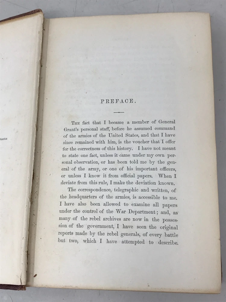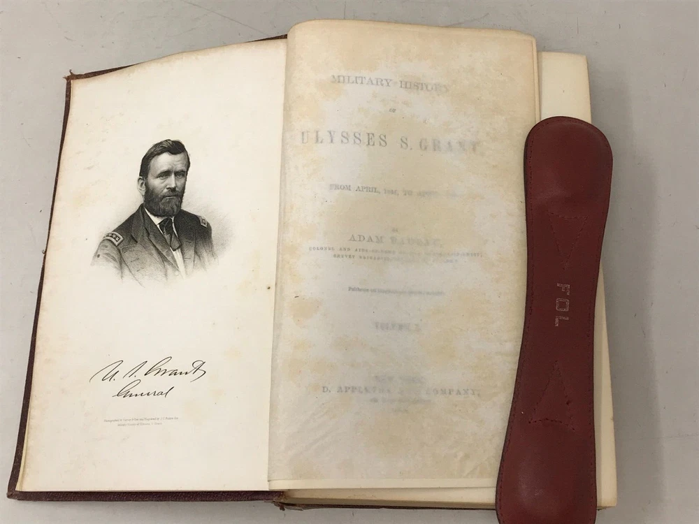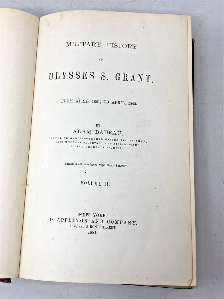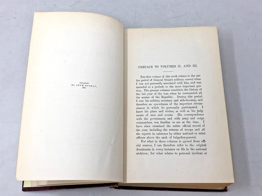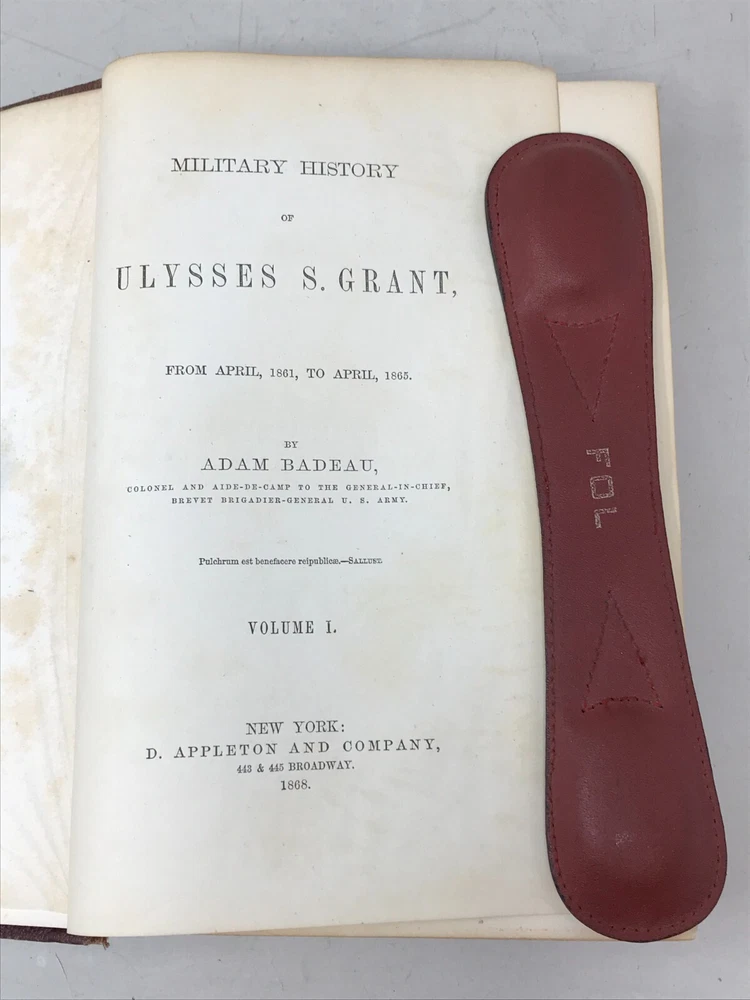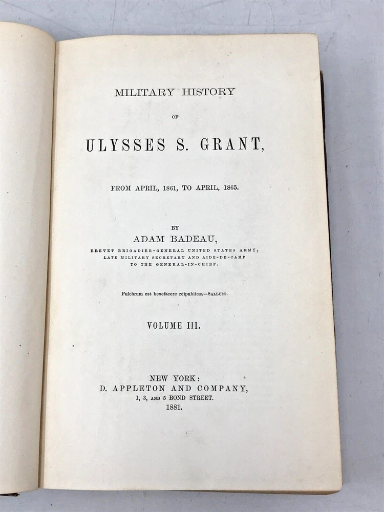 Please note we do not work weekends . All offers, questions, or concerns may not be answered until Monday. Please understand this means you may need to resubmit your offer Sunday evening. Thank you for supporting our libraries and have a great weekend. Adam Badeau (December 29, 1831 – March 19, 1895) was an American author, Union Army officer, and diplomat. He is most famous for his service on the staff of Ulysses S. Grant during the American Civil War and his subsequent three-volume biography of Grant. Badeau enjoyed a successful career as a writer and assisted Grant with the research, fact checking, and editing when Grant authored Personal Memoirs of Ulysses S. Grant. This is a 3 volume set Military History of Ulysses S. Grant From April, 1861, to April, 1865 by Adam Badeau, Colonel and Aide-De-Camp to the General-In-Chief, Grant Brigadier-General, U. S. Army published by D. Appleton and Company. Red laether covers with gilt lettering on spine, the spines have been heavily taped by a previous owner. Volume 1: 1868, 683 pp.(webbing of hinge visible at preface page) Volume 2: 1881, 585 pp. plus fold out maps at rear and 3 masp in pocket inside rear cover Volume 3: 1881, 733 pp. plus fold out maps at rear and 3 maps in pocket inside rear cover All proceeds benefit the Libraries of Pima County. Please review all photos. This listing has been donated. Please note that the listing is for what you see in the listing. We photograph all of it so you know what you are purchasing. The sale of the item(s) benefits Friends of the Pima Library (501c3 non-profit).
