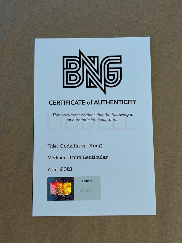 Godzilla vs Kong released by Bottleneck in the picutres has protective film on it half way pulled down so you can see print 3D Lenticular 1mm pet mounted Size: 24X36 Come with Certificate of Authenticity Numbered out of 100 Mint/Near Mint. Stored flat in flat file, in smoke free home. Shipping **This particular print will ship flat** Ships fully insured USPS priority mail or USPS priority mail international. Usually ship next day. Check my feedback on packaging. Almost all feedback as a seller is by shipping prints both domestic and international. International shipping: Import duties, taxes, and charges and not included in the item price or shipping. These charges are the buyer’s responsibility. If unfamiliar please check with your country's custom office to determine what these additional costs will be prior to buying. Pictures My pictures are of the actual print. If you have any questions feel free to reach out. Thanks for looking.