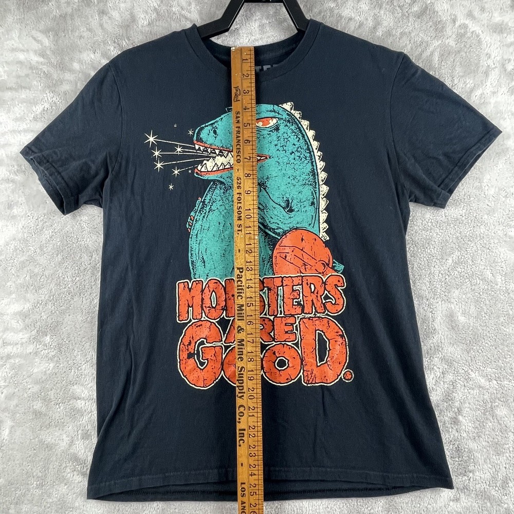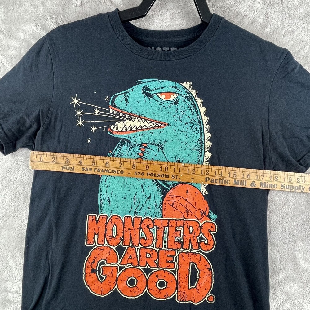 The "Monsters Are Good Godzilla Logo Tee Shirt" in black is a unisex t-shirt made of cotton jersey fabric with a crew neck and short sleeves. It features the Godzilla logo as an accent, with a tagless design for added comfort. This size medium shirt from the Monsters Are Good brand is suitable for year-round wear and is machine washable for easy care.