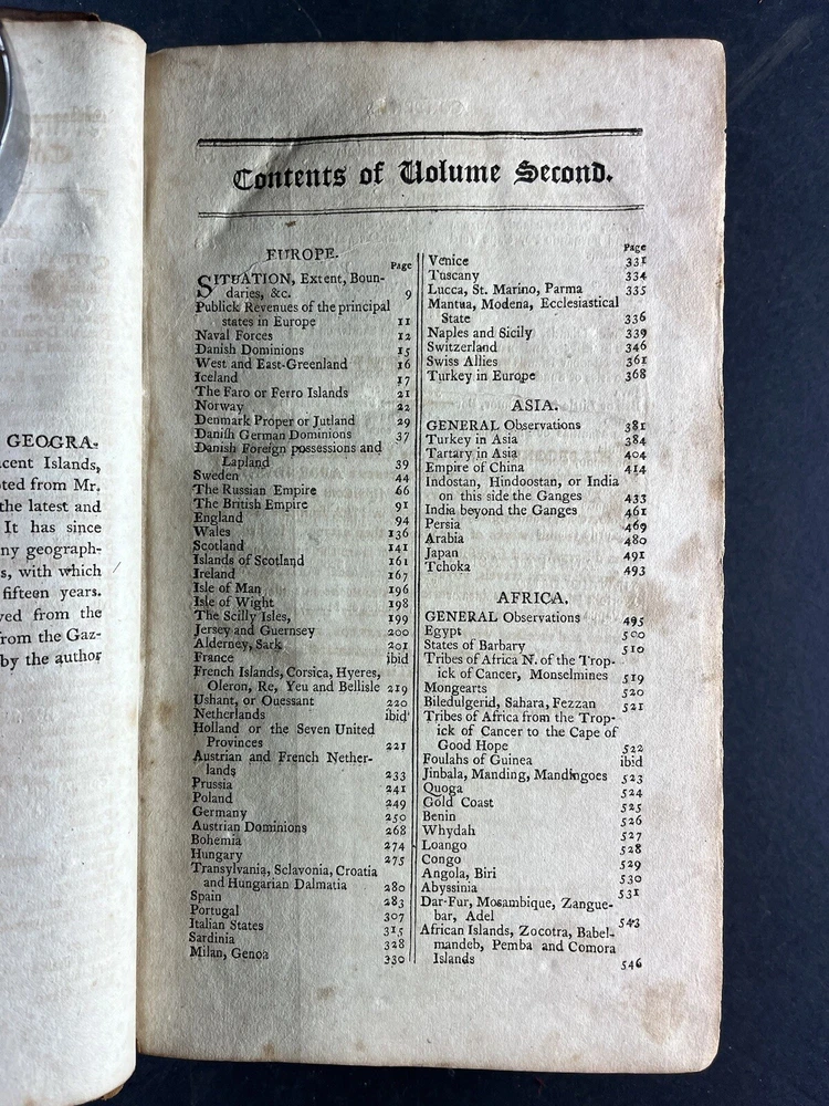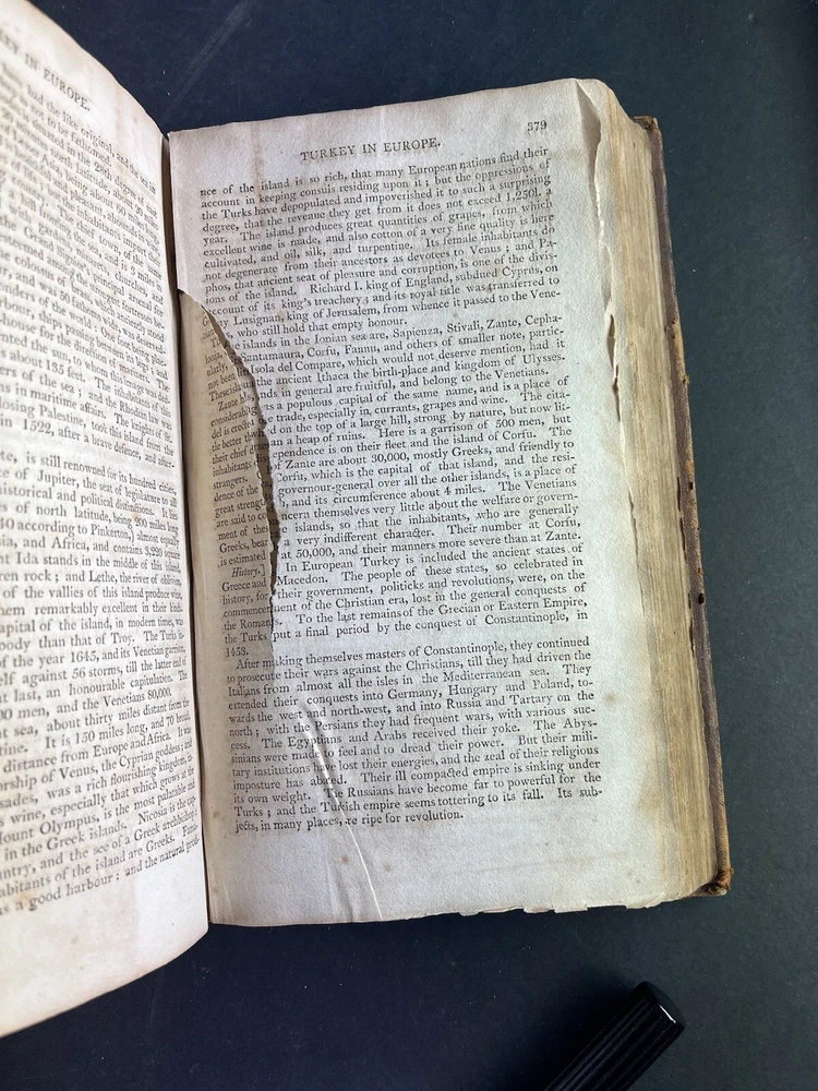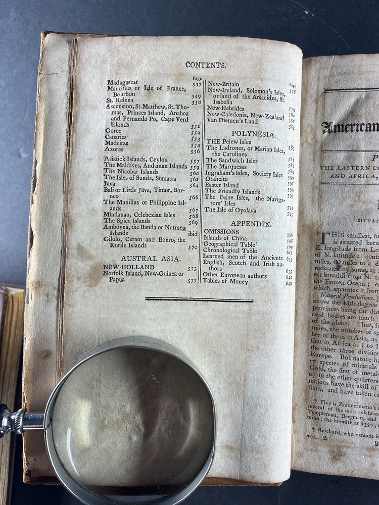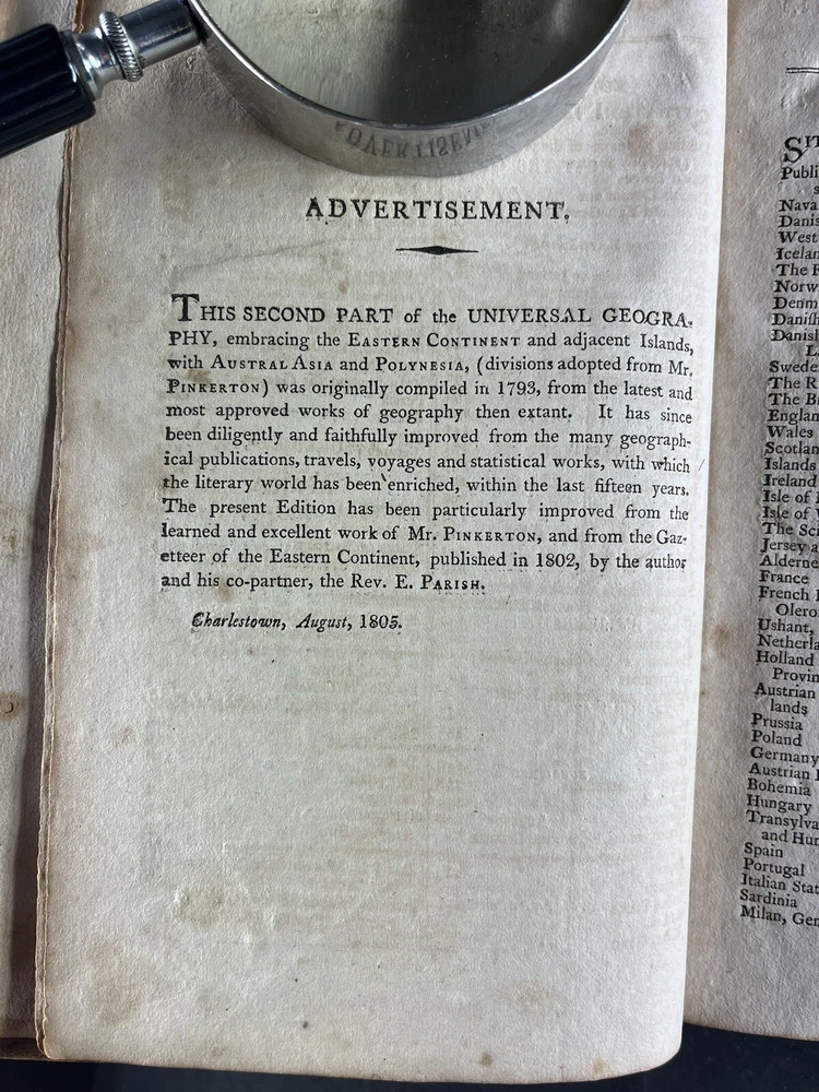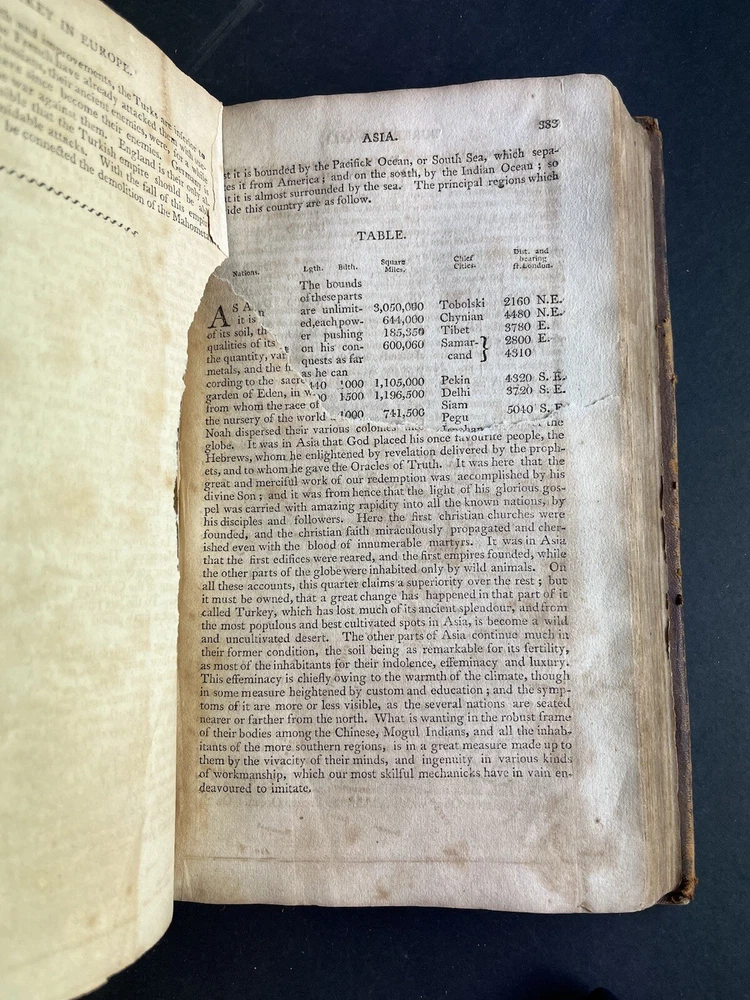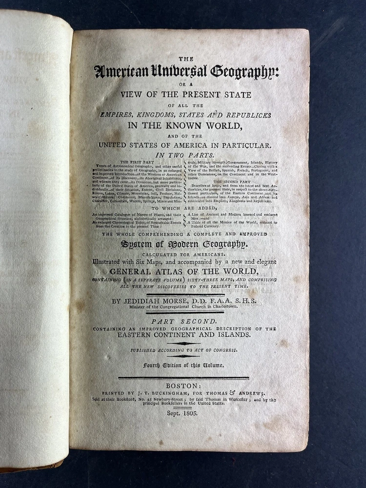 Morse's Universal Geography Vol 2: The American Universal Geography, or a View of the Present State of All the Empires, Kingdoms, States, and Republics in the Known World and of the United States of America in Particular by Jedidiah Morse, published in 1805, is a comprehensive and valuable geographical reference from the early 19th century. Key Features: Author: Jedidiah Morse, a prominent minister and geographer, often regarded as the "Father of American Geography." Content: This volume offers an extensive overview of the global political landscape and a detailed examination of the United States during the early 1800s. Notably, this volume does not contain maps. Pages: Contains 664 pages filled with rich geographical information. Condition: Binding: Bound in calf leather with faded gilt and title on the spine. Wear: The spine shows distress at the tips, and the front joint is cracked and weak, though the board remains attached. Pages: The pages are toned and foxed, with some torn and partially missing. Signatures: Of historical note, this copy contains two signatures on the front endpaper in script and ink consistent with the early 19th century, adding to its provenance and historical value. This volume is a significant historical artifact, providing insights into the geographical knowledge and perspectives of the early 19th century. Despite its condition issues and the absence of maps, it remains a valuable resource for collectors and historians interested in early American geographical literature. The presence of early 19th-century signatures further enhances its historical significance and collectability.