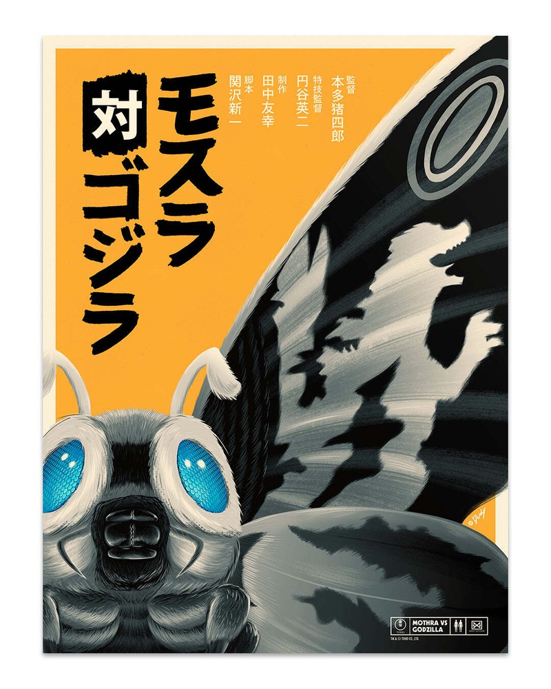 Mothra vs. Godzilla An official, limited edition print by artist Doaly Edition: Limited Edition of 150 Technique: archival pigment print Dimensions: 18" x 24" Markings: hand-numbered Mint condition; stored flat in an archival sleeve. From the 1964 film Mothra vs. Godzilla directed by Ishiro Honda and starring Akira Takarada, Yuriko Hoshi, Hiroshi Koizumi.