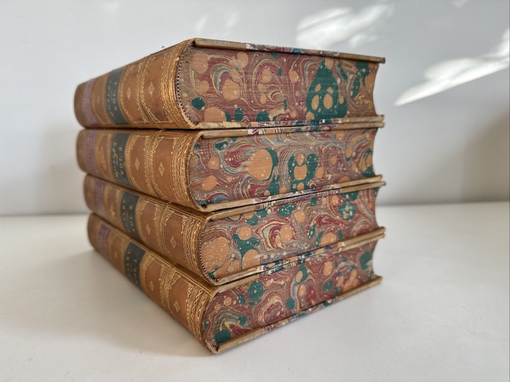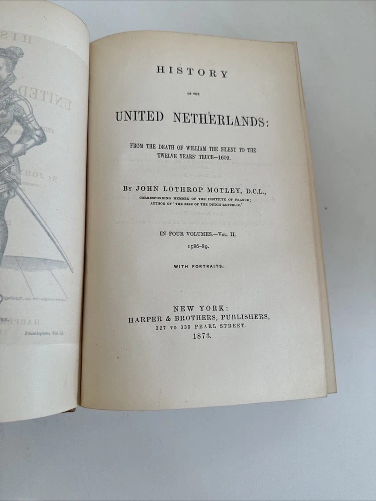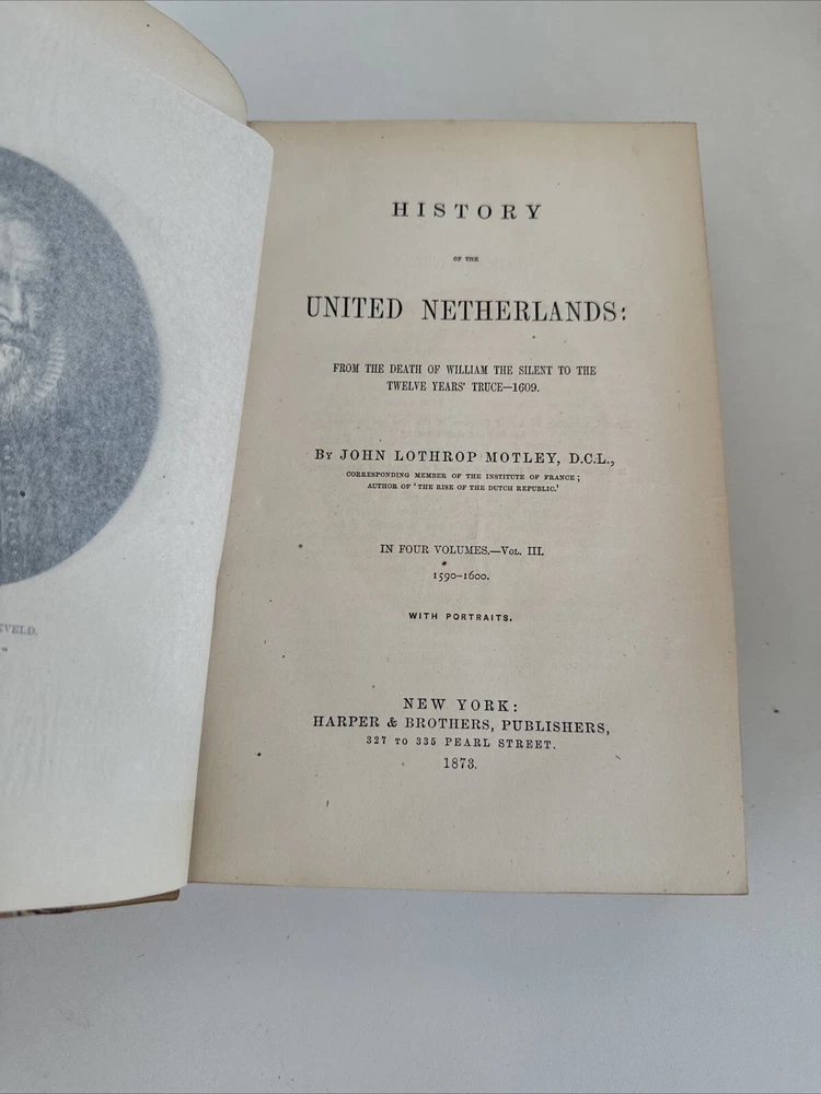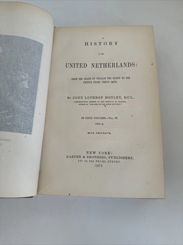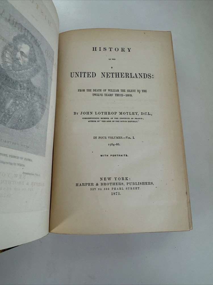 History of the United Netherlands - From the Death of William the Silent to the Twelve Years’ Truce - 1609. By John Lothrop Motley Complete, four volume set. Published in 1872/73 in New York by Harper & Brothers. Beautiful leatherbound books featuring marble patterns to both the outer cover and page edges. Condition: Quite good overall. Some minor age and shelf wear. A few minor cosmetic marks to the leather. Bindings remain very crisp. Some light age coloring to pages. Note written inside on blank cover pages of each volume. Note written by J. Townsend Lansing. Shipped for FREE!