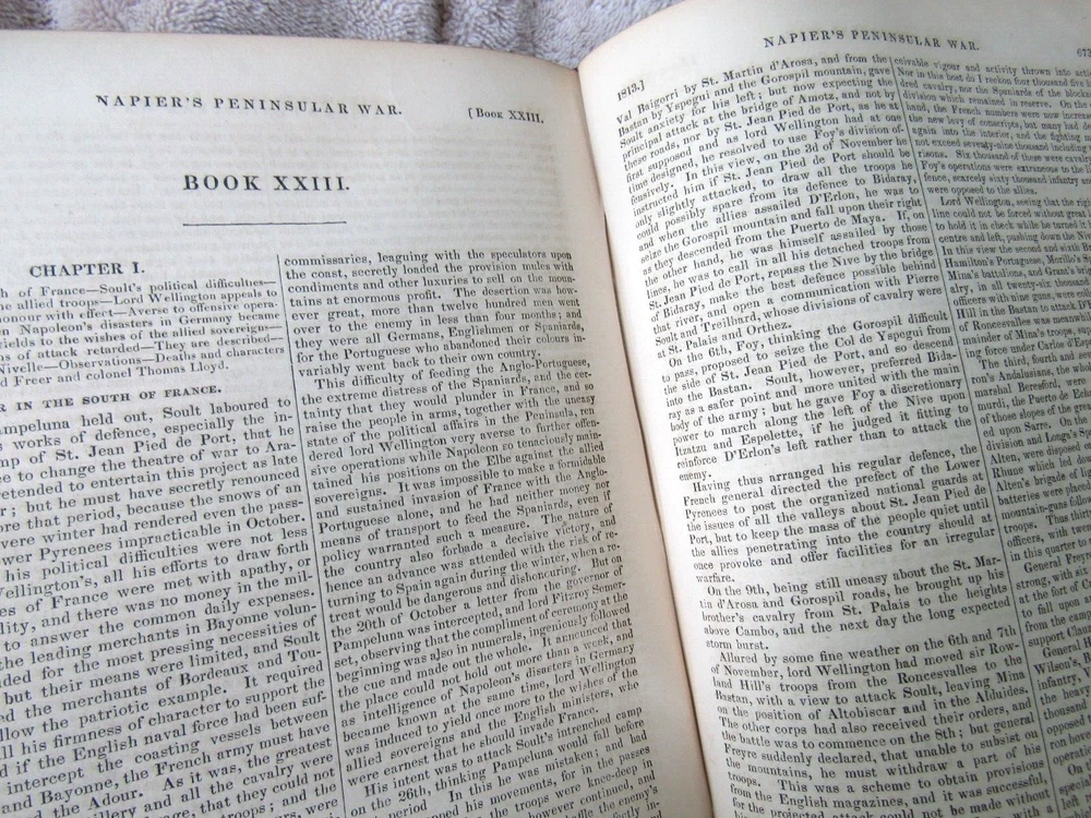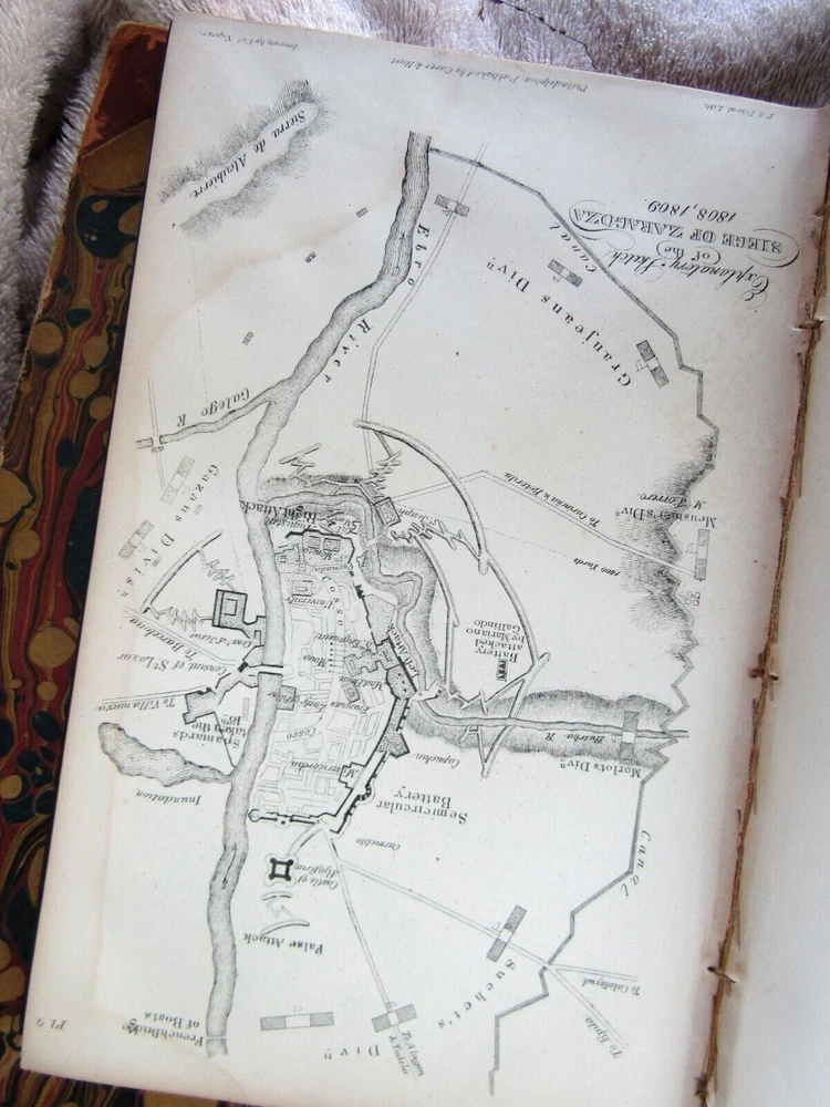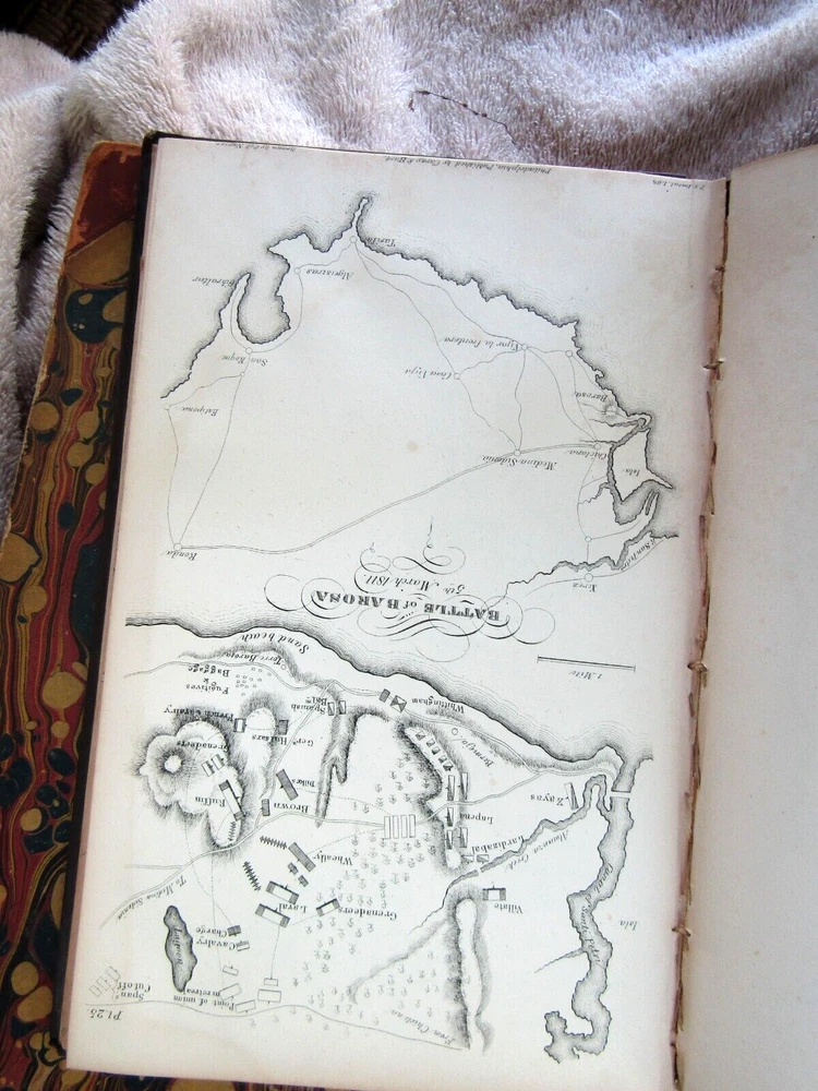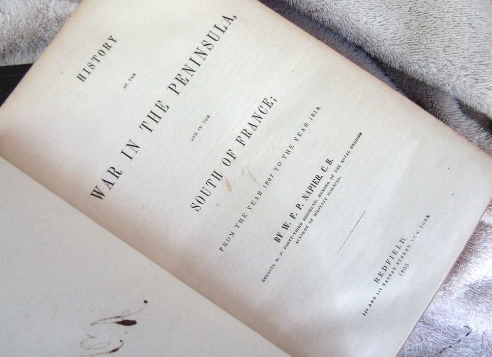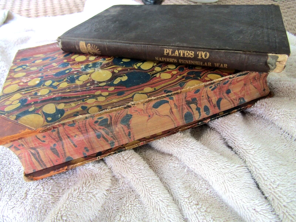 This full leather book contains NAPIER'S PENINSULAR WAR. The second smaller book contains 46 pages of Plates of maps concerning the Peninsular war and the war in France. Please see the picture of the title page for the exact title. 19th century writer's tended to make them long and detailed. The gilt on the spine is worn, but the marbled boards and page edges are very showy. Pages seem strongly attached and the spine is strong. The larger book is 10.5 inches by 7.5 and it's about 2.25 inches thick. Email if you have questions. THE SMALL PRINT. Shipping will be paid by the buyer. I'll send this media mail. I mail fast because I really appreciate fast payment.