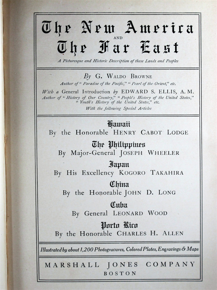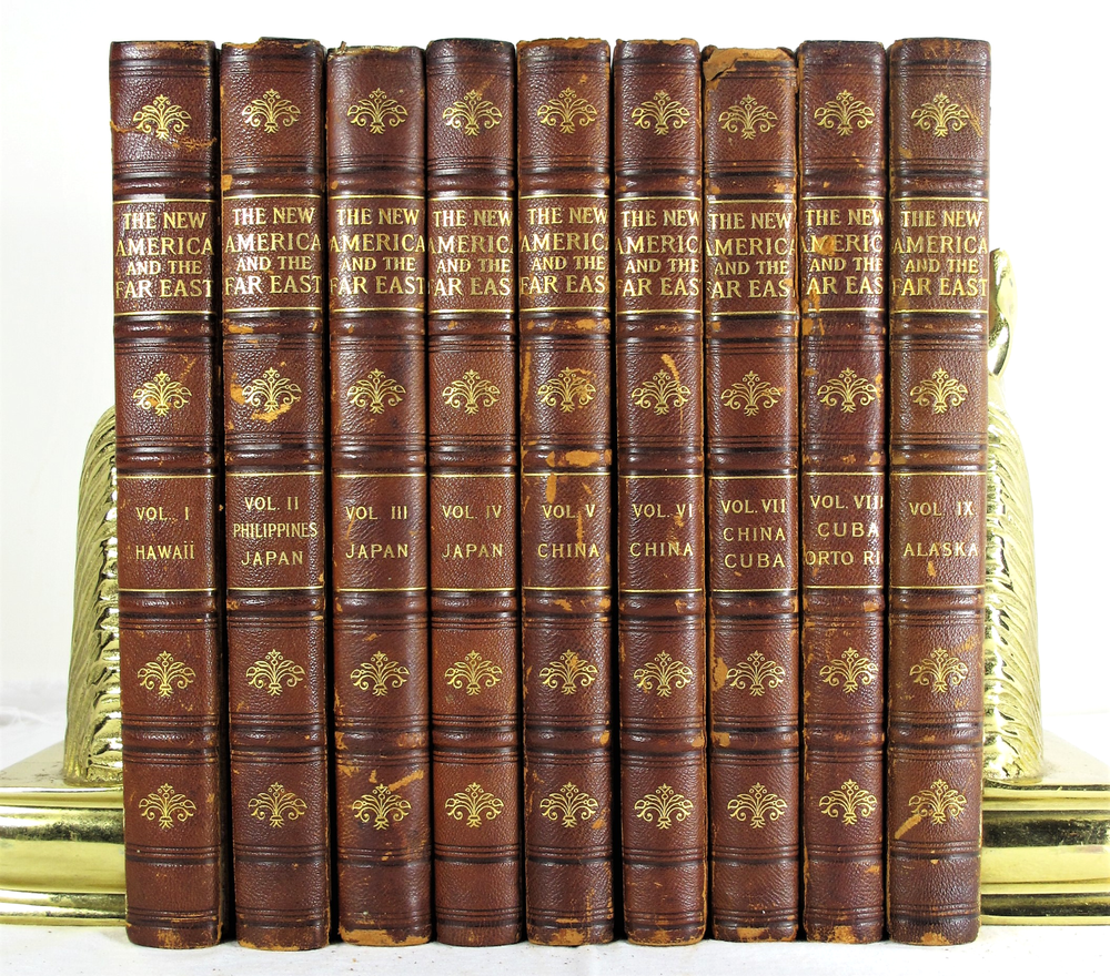 WELCOME TO MY AUCTION YOU ARE VIEWING The New America and the Far East by G. Waldo Browne and Nathan Haskell Dole Nine Volume Set Illustrated Marshall Jones Company Boston 1910 **More Pictures Below** Item Description: The New America and the Far East by G. Waldo Browne and Nathan Haskell Dole. Nine Volumes of a Ten Volume Set. Missing Vol. 10-India. Published by Marshall Jones Company, Boston, 1910. Hardcover. 3/4 leather over pebbled boards, 6 raised bands to the spine with gilt lettering. Top edges gilt. Marbled endpapers. Illustrated by over 1,300 photogravures, colored plates, engravings, color and folding and maps. Condition : Very Good. R ubbing/wear on edges and corners; Vol. 1. front hinge cracked, boards are securely attached. Contents clean, bright, and unmarked. No writing, markings, bookplates. No torn or missing pages. An excellent addition to any library or collection. A picturesque and historic description of these lands and peoples with a general introduction by Edward S. Ellis; with the following introductions: Hawaii by The Honorable Henry Cabot Lodge, The Philippines by Major-General Joseph Wheeler, Japan by His Excellency Kogoro Takahira, China by The Honorable John D. Long, Cuba by General Leonard Wood, Porto Rico by The Honorable Charles H. Allen, Alaska by The Honorable Walter E. Clarke. Vol. 1. Hawaii, Vol. 2. Philippines/Japan; Vol. 3. Japan; Vol. 4. Japan; Vol. 5. China; Vol. 6. China; Vol. 7. China/Cuba; Vol. 8. Cuba/Porto Rico; Vol. 9. Alaska. Large oversize volumes. 8 x 10 7/8" tall. An excellent addition to any library or collection. **************** Buy with confidence... Fast Shipping--Includes Free Delivery Confirmation and Insurance. We have 18 years experience selling on Ebay. We maintain 100% Feedback. Please Check out my other items ! Be sure to add me to your favorites list ! Condition glossary: MINT - as new FINE - clean and with no wear but not as crisp as mint NEAR FINE - clean with only minimal shelf wear - no writing or tears VERY GOOD - clean with light shelf wear, possible owner's name, any marks or tears are disclosed GOOD - worn edges and corners, possible smudges or markings inside, edge tears, FAIR - more wear than "good", not attractive at all but still solid enough to read EX-LIBRARY - Any book listed as ex-lib may contain the following flaws: front free endpaper removed, library card pocket, jacket glued to the endpapers, tape and sticker residue, other library notations, discard stamps, etc. We Ship: Worldwide. We Offer: USPS Domestic and International Shipping We Ship 5 Days a Week. Monday-Friday Free Delivery Confirmation--Confirmation Number will be automatically emailed to you as soon as your shipping label is printed. Cross-border buyers are responsible for any customs, duties, etc. imposed by the buyer's home country. RETURNS : Returns are accepted. While every effort is made to accurately describe every item minor flaws may not always be noted. Please review the description and condition of an item prior to bidding. If you have any questions please do not hesitate to Email us. REFUNDS: You may return your item for a full refund within 30 days. You are required to ship the item back with insurance and tracking at your own expense. Refunds will be issued in the form in which item was paid. We at Lorikayltd strive for 5 Stars and 100% Feedback. No sale is final until you are satisfied with your purchase. We know you have many choices buying online--and we appreciate your business Auction Template Design © In My Cedar Chest - Unauthorized Duplication Prohibited.