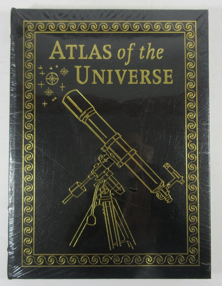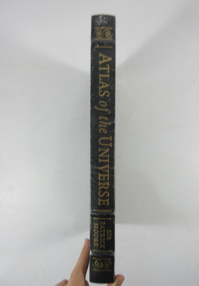 For sale is a New condition, leather-bound hardcover copy of Atlas of the Universe by Sir Patrick Moore. Collector's Edition, published by Easton Press in Norwalk, CT. Features black leather binding, gold foil lettering and decoration, banded spine, gilt pages, and a gold satin placeholder ribbon. New condition, still sealed in original plastic with minimal shelf wear. Please see photos for condition detail. shelf reference #L-1934
