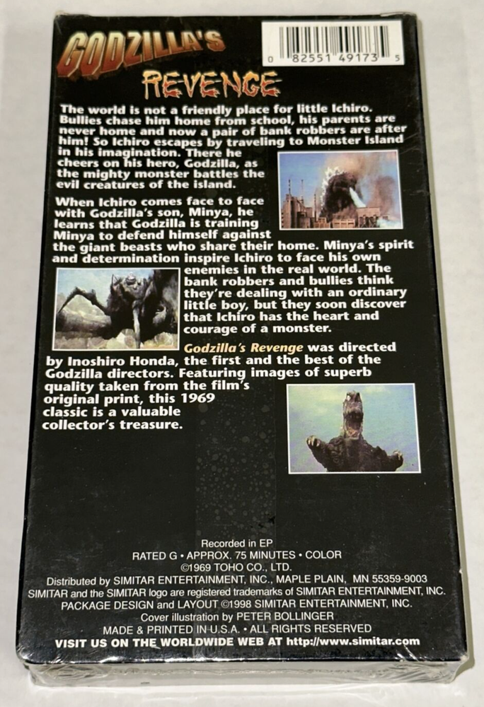 NEW! SEALED! 'Godzilla's Revenge' (VHS, 1998) vintage sci-Fi Movie Video Artwork Complete! Still Sealed. Excellent++ Condition! Same Movie as in the Photo. Shipped with tracking via USPS.