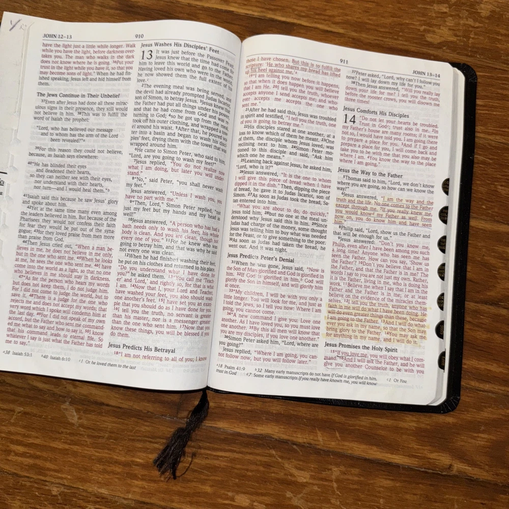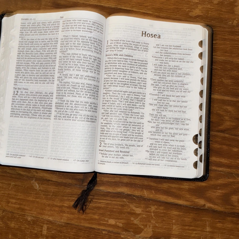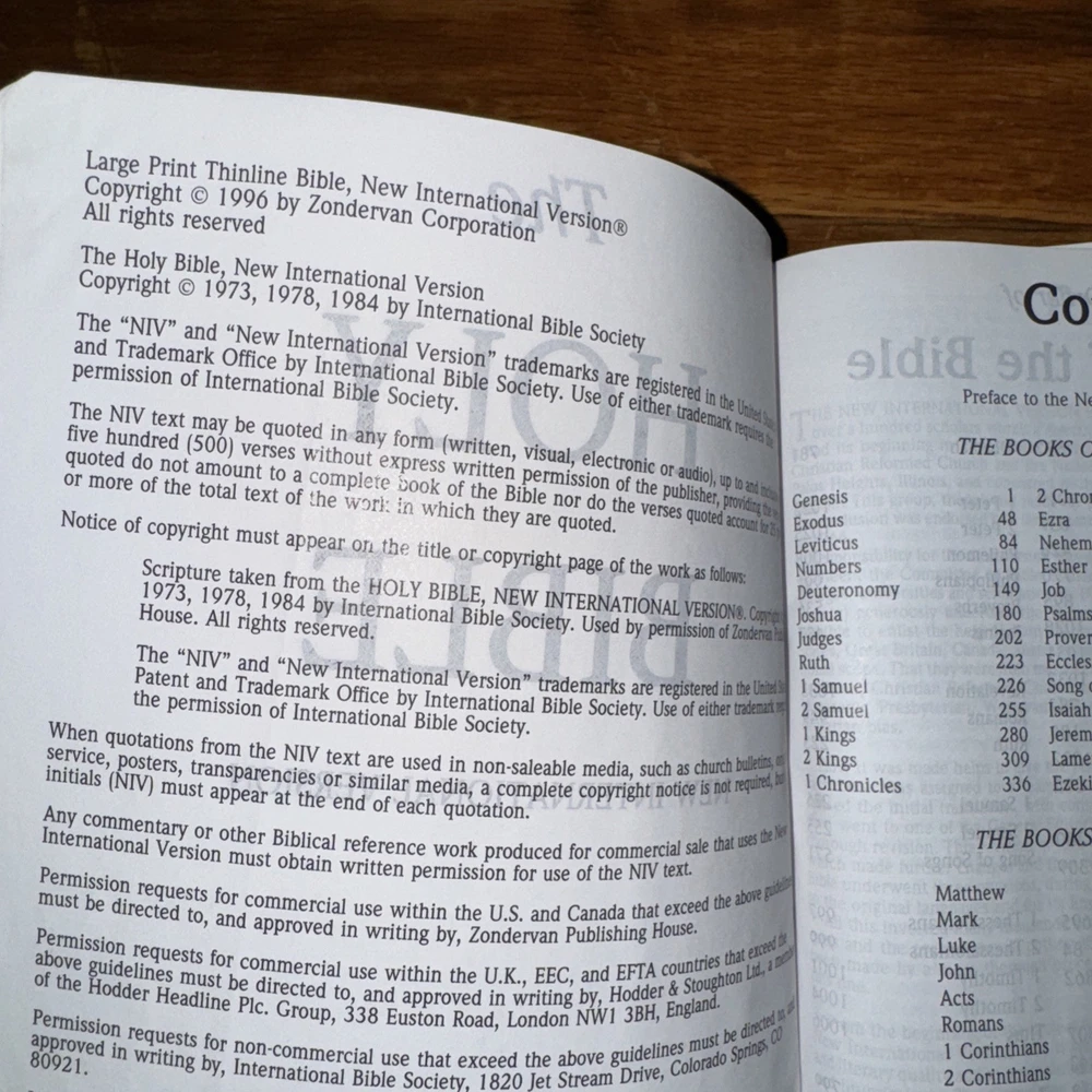 This NIV Large Print Thinline Bible from 1996 is a great addition to any collection. The black bonded leather cover is in good shape, although there is some damage to the ribbon. The Bible features large print and is thinline, making it easy to carry around and read on the go. It includes maps and red lettering to aid in study and understanding. The Bible has 1152 pages and weighs 29.9 oz. It is intended for young adults and adults and is a nonfiction narrative. The book title is NIV Thinline Large Print Bible and it is a revised edition. The literary movement is realism and it is written by God. The Bible is published by Zondervan and the illustrators are Zondervan Staff.