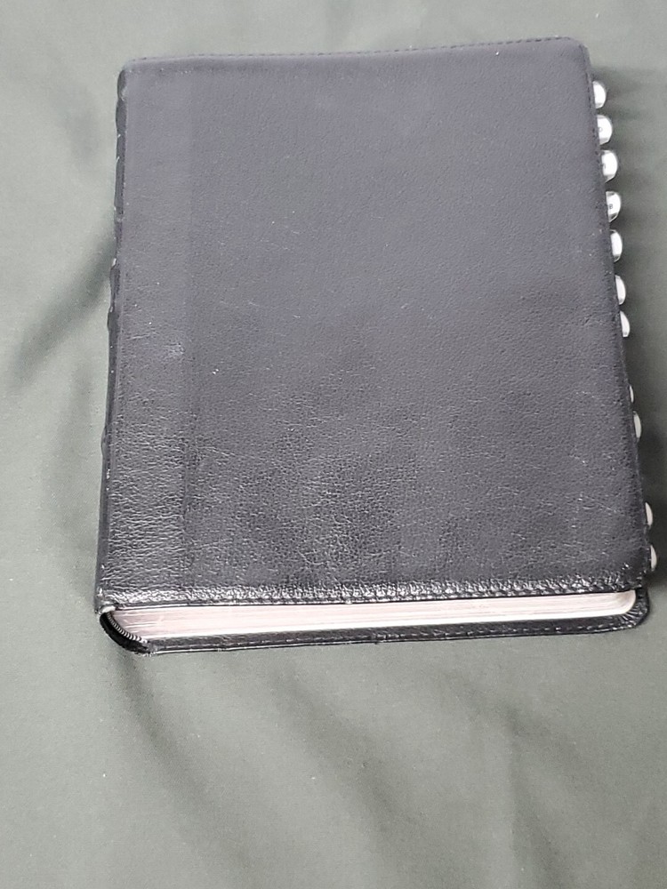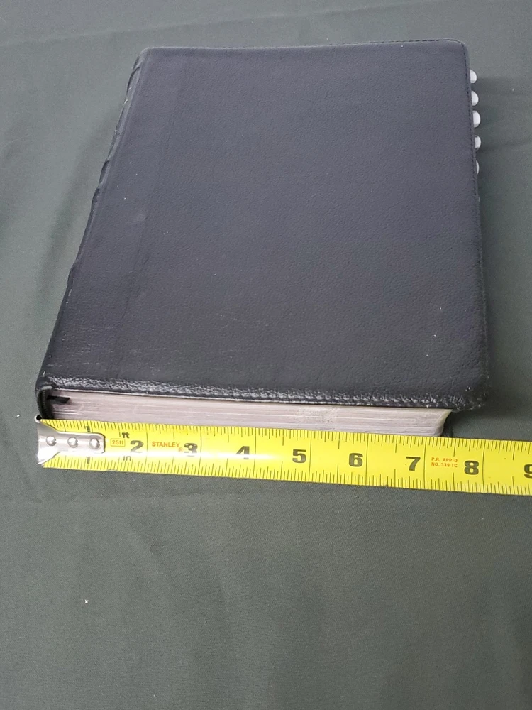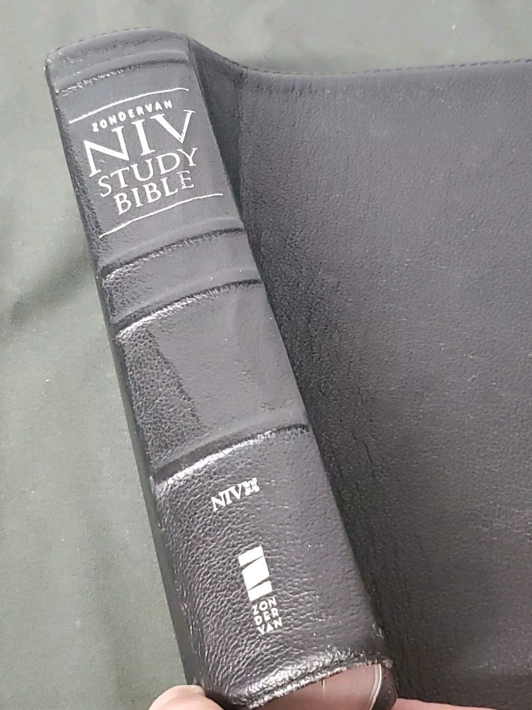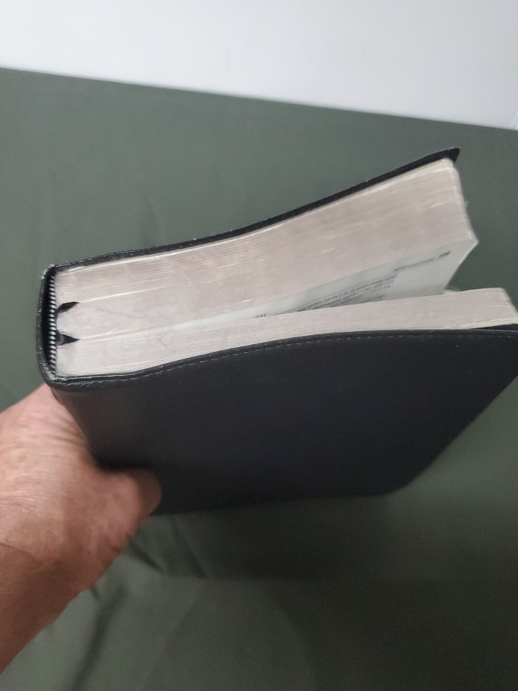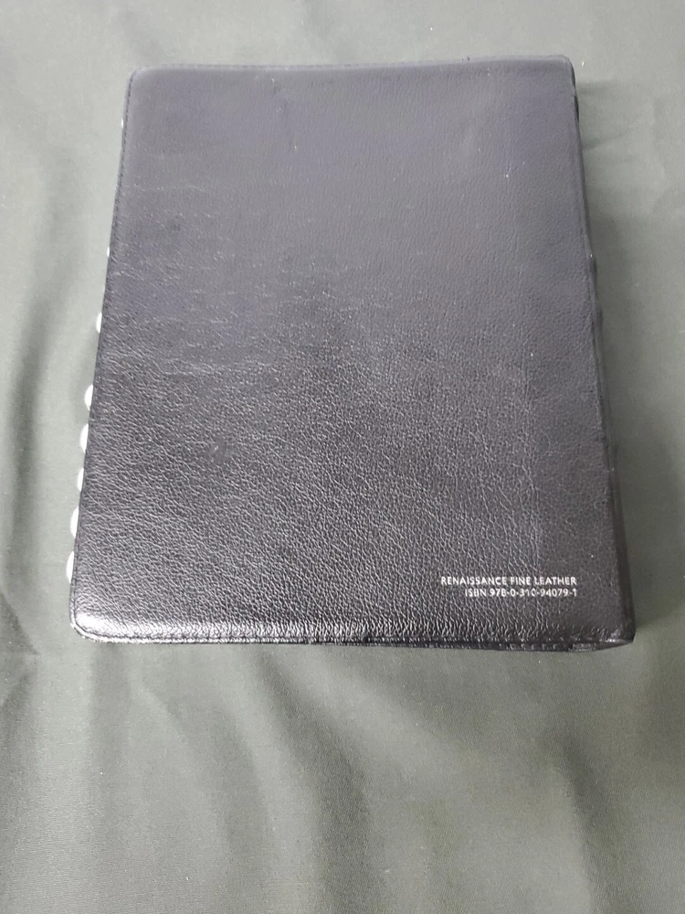 NIV Study Bible Ebony Renaissance Fine Leather Red Letter 2008 Update Writing on Presentation Page, name only, highlighting 2 verses in Genesis 1, some notes on last page before maps. Few folded pages, tears around tabs. Nice large Bible 7½ × 9½", larger than average, leather cover feels good in the hand. 2 ribbon markers, thumb tabs to ease finding books, guessing this was a top of the line Bible when this first came out. Nice Study Helps: Table of weights and measures, index to topics, index to notes, concordance, index to color maps, colored Chronology chart. Weight is 4 lb before packaging. 7½ × 9½ × 1⅞" Offers always considered. Thank you for looking. WC1b.061424.74.9
