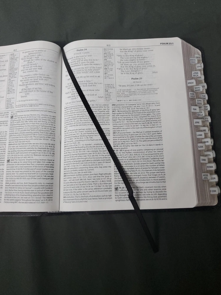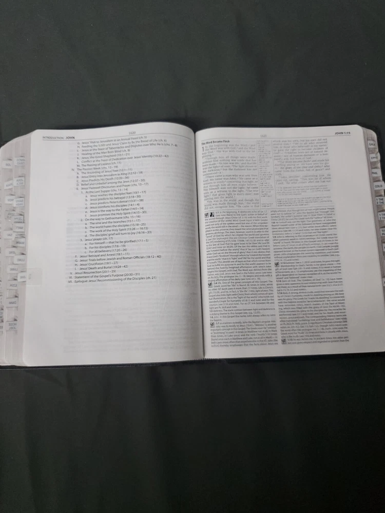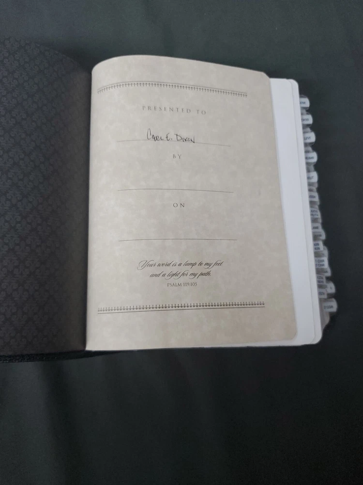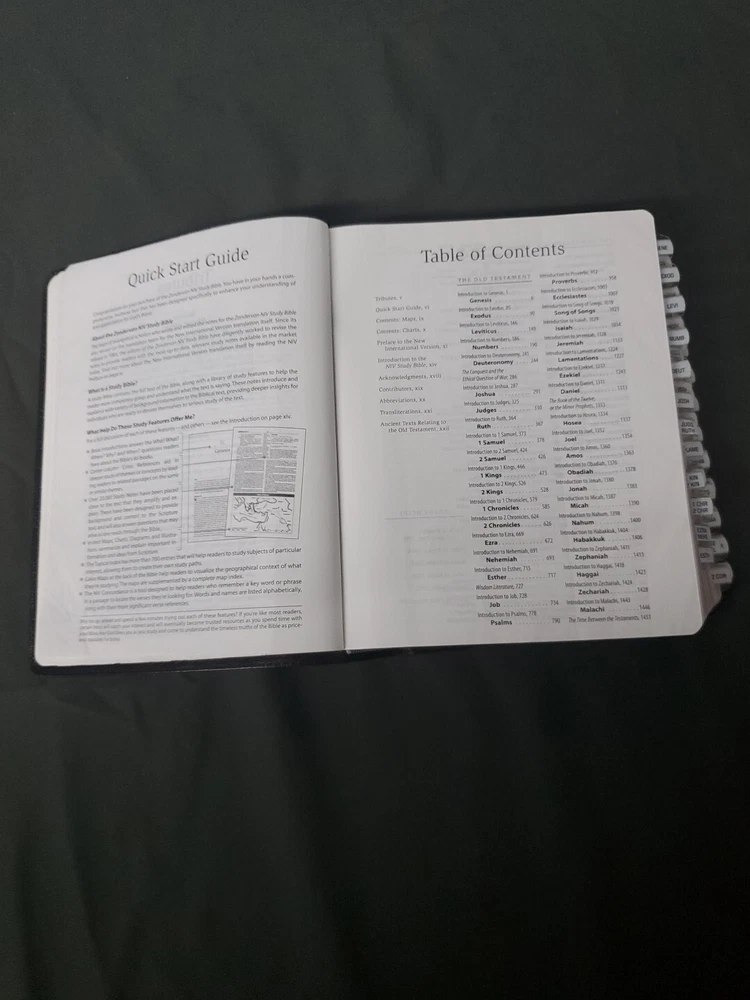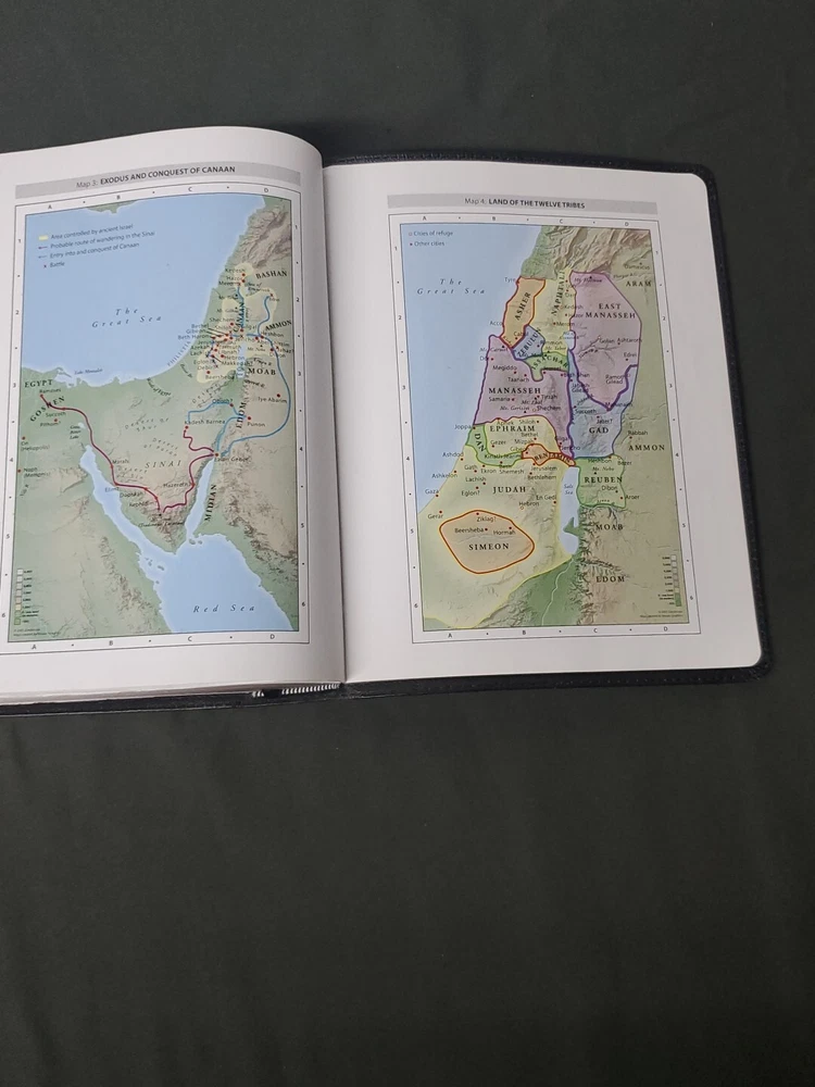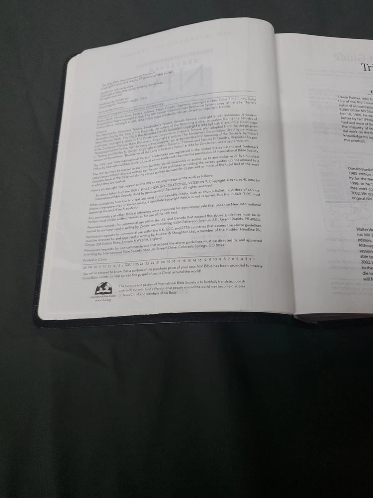 NIV Study Bible Ebony Renaissance Fine Leather Red Letter 2008 Update Writing on Presentation Page, name only, highlighting 2 verses in Genesis 1, some notes on last page before maps. Few folded pages, tears around tabs. Nice large Bible 7½ × 9½", larger than average, leather cover feels good in the hand. 2 ribbon markers, thumb tabs to ease finding books, guessing this was a top of the line Bible when this first came out. Nice Study Helps: Table of weights and measures, index to topics, index to notes, concordance, index to color maps, colored Chronology chart. Weight is 4 lb before packaging. 7½ × 9½ × 1⅞" Offers always considered. Thank you for looking. WC1b.061424.74.9