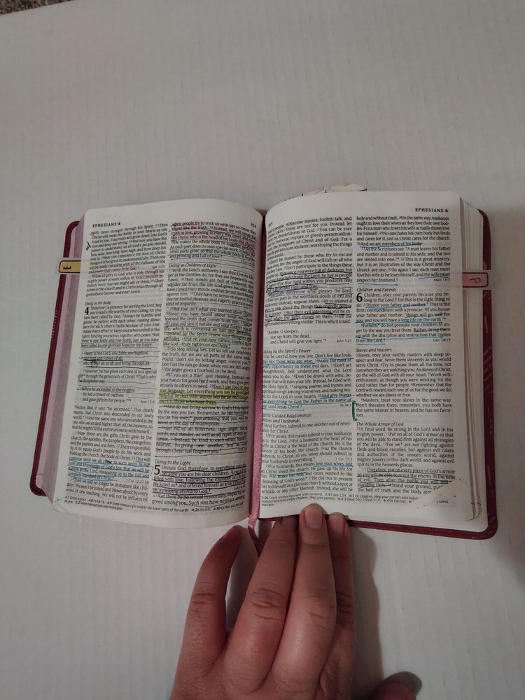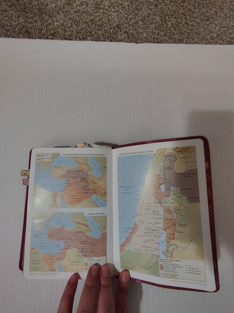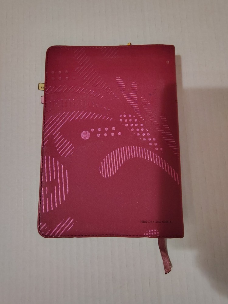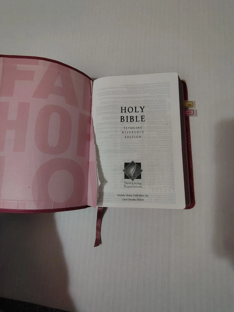 This NLT New Living Translation Bible is a wonderful addition to any collection. With its pink faux leather cover and colored maps, it is a beautiful and unique edition. The Bible is written in English. It is a nonfiction narrative type and belongs to the Historical book series. The Tyndale House Publishers have done an excellent job of presenting this Bible in a beautiful format. The Bible is not signed, inscribed or vintage, but it is a wonderful addition to any collection. See pictures for condition Ribbon placeholder bookmark
