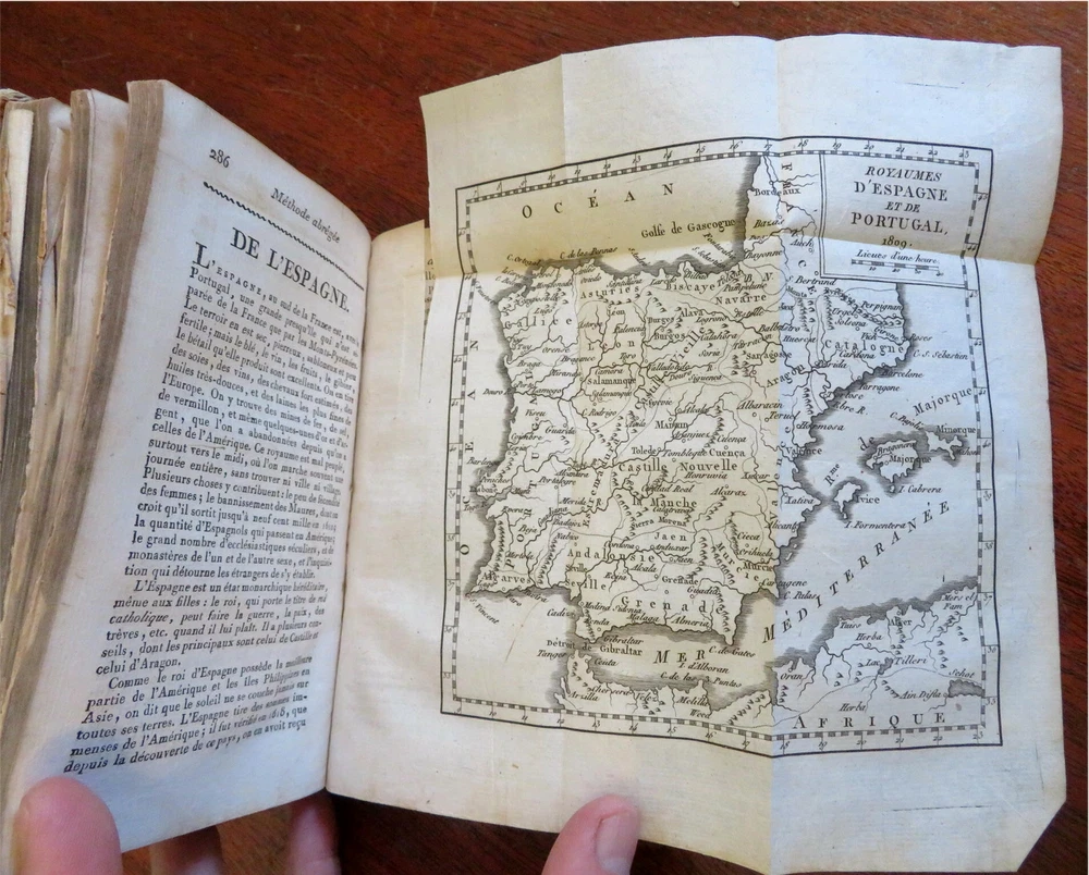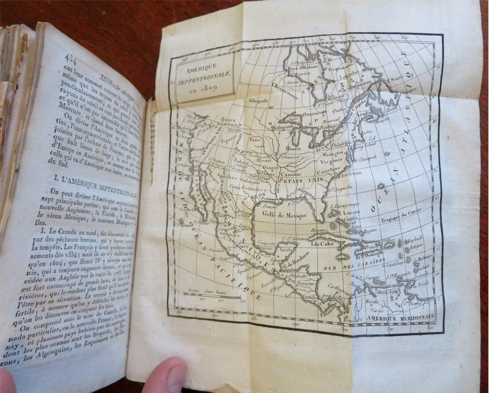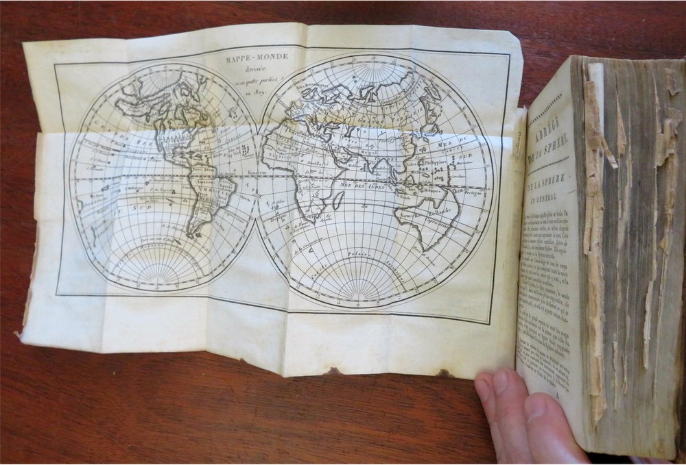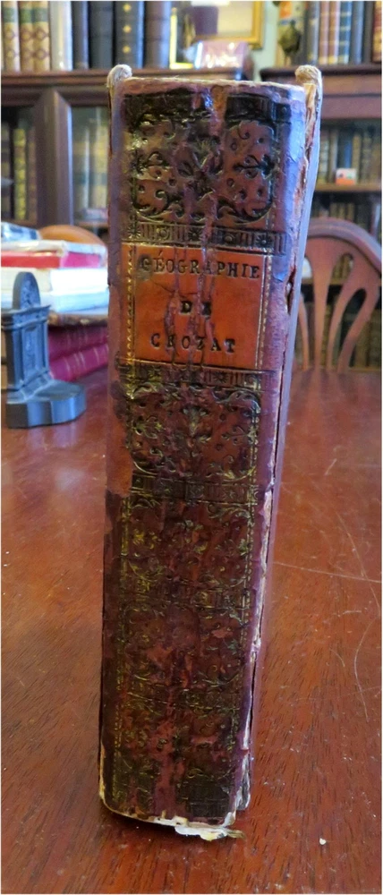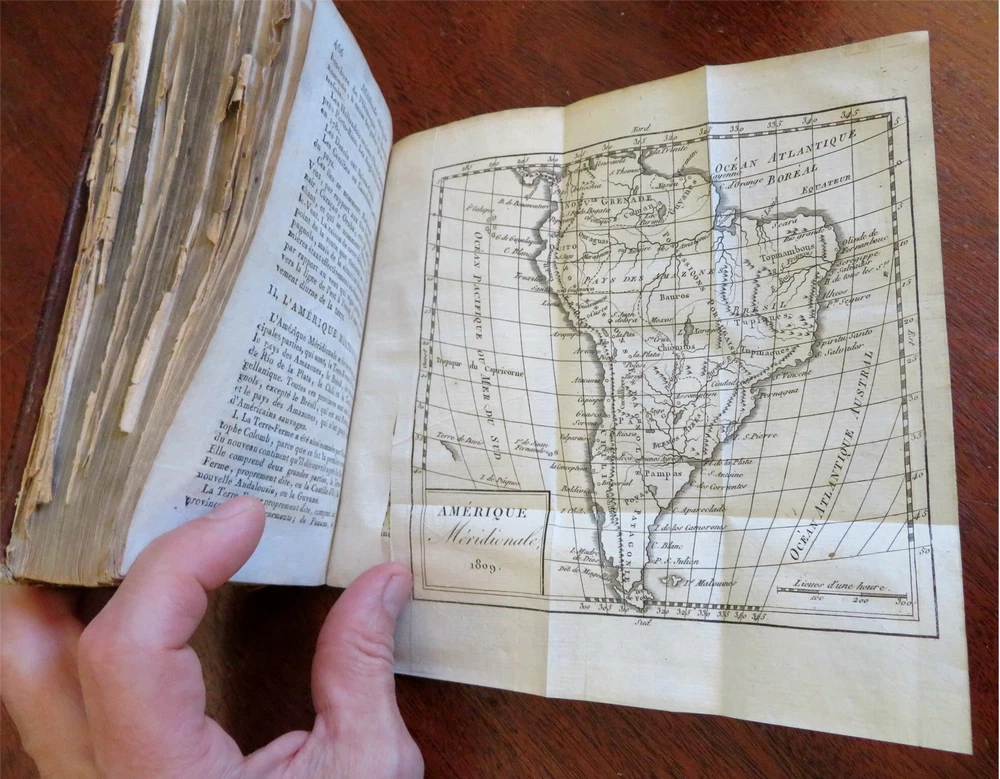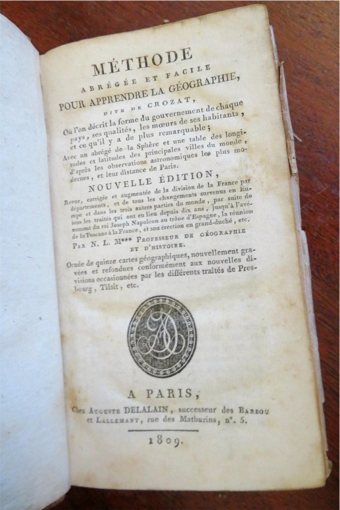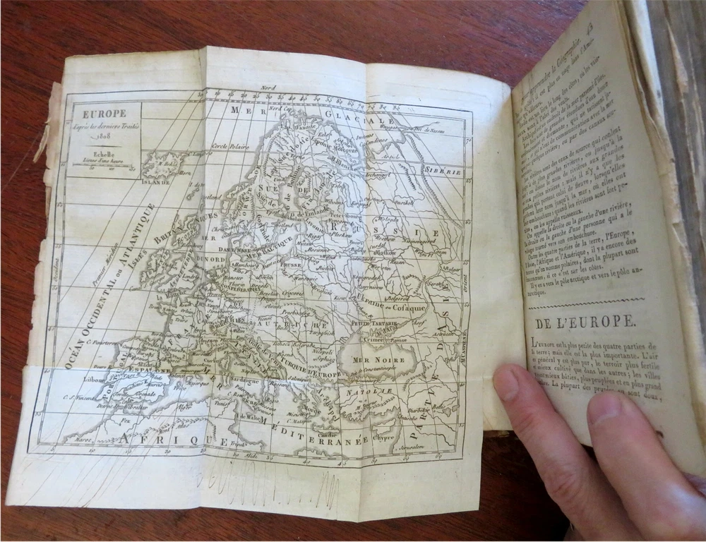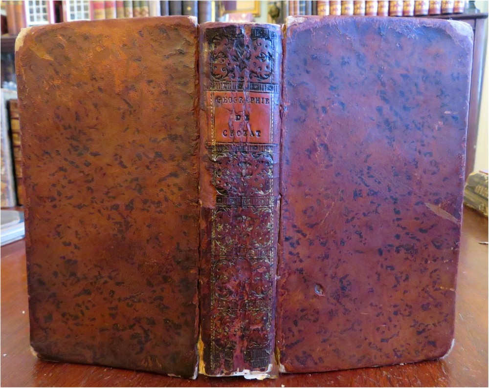 Napoleonic France Geography Book 1809 leather atlas w/ 16 world maps Napoleonic France Geography Book 1809 leather atlas w/ 16 world maps (Old Books, 19th Century Books, Leather Books, School Books, Text Books, Geography, Books with Maps, French Books). Methode Abregee et Facile Pour Appendre la Geographie. Published 1809, Paris by Auguste Delalain. 511 pages. Text in French. With 16 engraved folding maps of the world (including the continents and a world in spheres map). Attractive antiquarian full leather binding, smooth spine, gilt title lettering & spine decorations, Book is physically old and shows some signs of handling and time. Front cover almost detached, rear joint broken and cover loosened. Binding well age worn but still appealing, leather and joints rubbed but still supple, remains overall very attractive as an object. Text block paper is age toned as typical, some fraying to map edges from slightly protruding from text block over the years, Africa map has a short minor (closeable) split within it, internally book remains mostly clean, tight and sound. A book which has been taken care of but may/ does not look like new. Still attractive on the shelf. Book displays a pleasing and unique age patina and is in rather nice antiquarian condition, any age flaws seem easy to overlook or forgive. Please review photos for more detailed attempt to present this pocket geography/ small atlas as it survives. We often over-describe any flaws that many sellers would not even bother to mention since most people would overlook them as minor and unworthy of comment. Many people tell us the books they receive from us are nicer in person than they appears on the screen. We want you to be clear about what you are buying, so we take numerous photos and try to describe it openly and honestly. Book Measures c. 7" H x 4" W. [B8973].