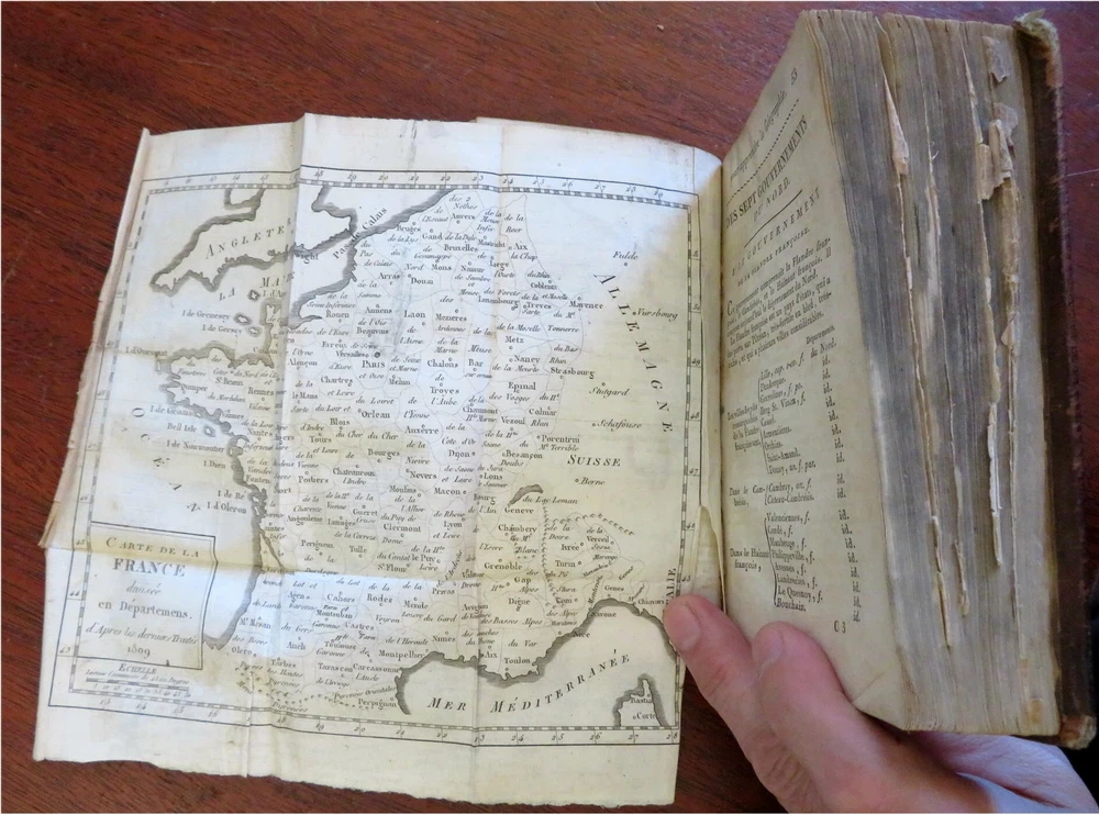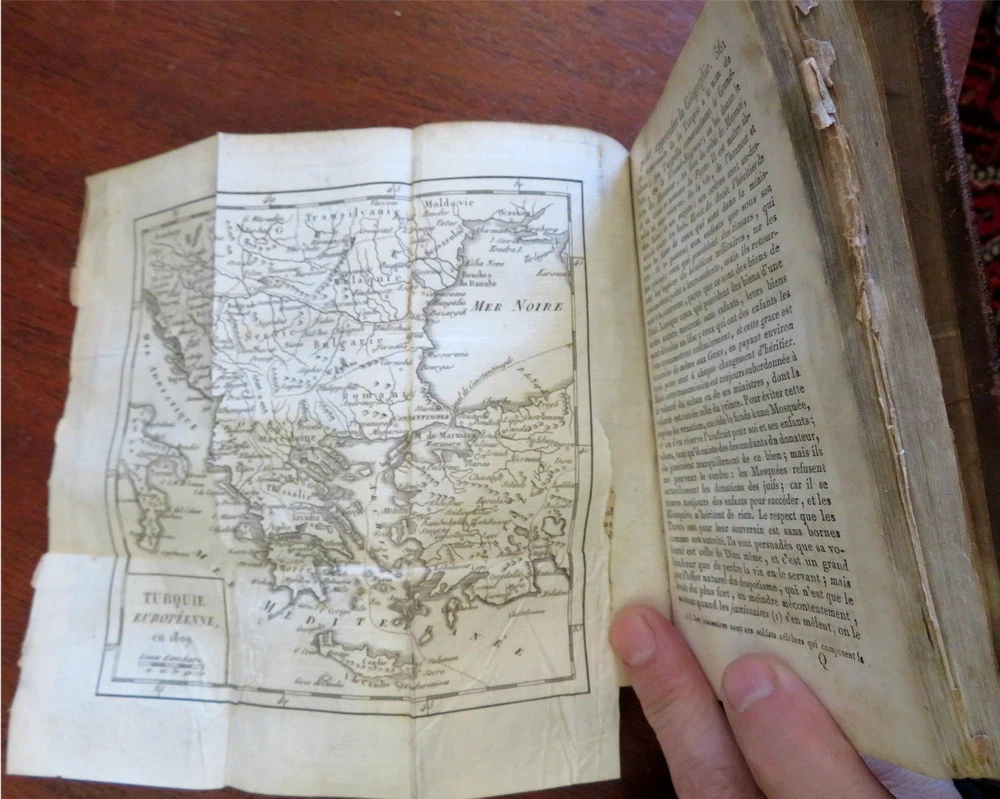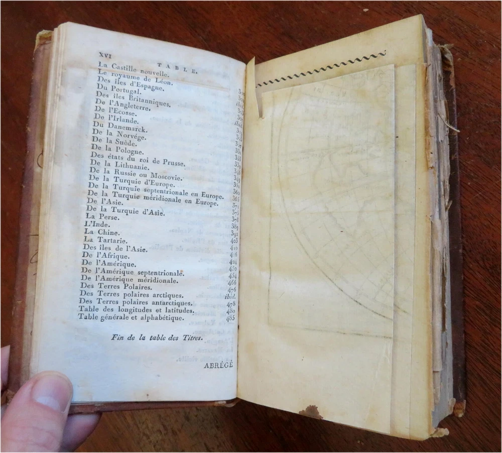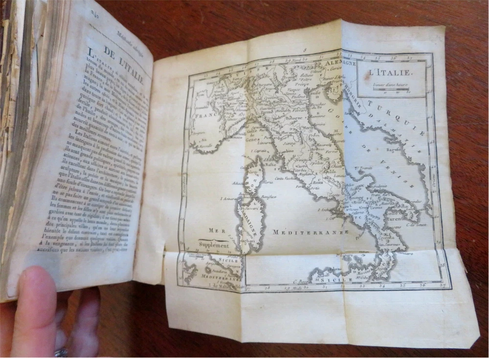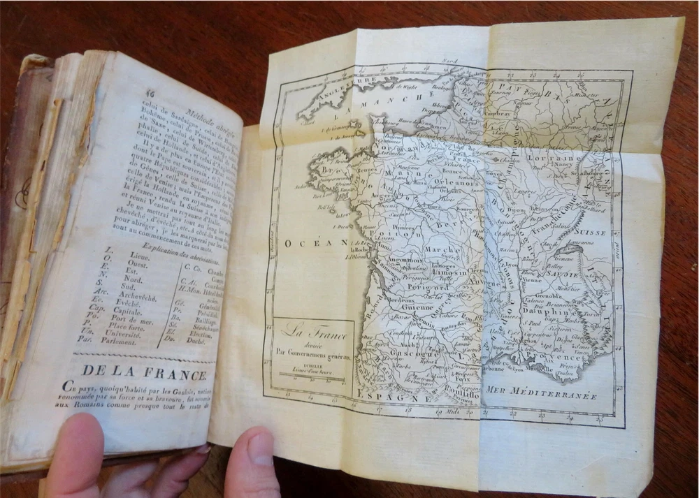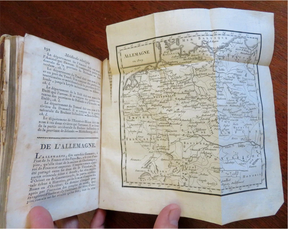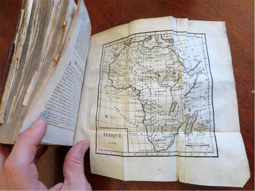 Napoleonic France Geography Book 1809 leather atlas w/ 16 world maps Napoleonic France Geography Book 1809 leather atlas w/ 16 world maps (Old Books, 19th Century Books, Leather Books, School Books, Text Books, Geography, Books with Maps, French Books). Methode Abregee et Facile Pour Appendre la Geographie. Published 1809, Paris by Auguste Delalain. 511 pages. Text in French. With 16 engraved folding maps of the world (including the continents and a world in spheres map). Attractive antiquarian full leather binding, smooth spine, gilt title lettering & spine decorations, Book is physically old and shows some signs of handling and time. Front cover almost detached, rear joint broken and cover loosened. Binding well age worn but still appealing, leather and joints rubbed but still supple, remains overall very attractive as an object. Text block paper is age toned as typical, some fraying to map edges from slightly protruding from text block over the years, Africa map has a short minor (closeable) split within it, internally book remains mostly clean, tight and sound. A book which has been taken care of but may/ does not look like new. Still attractive on the shelf. Book displays a pleasing and unique age patina and is in rather nice antiquarian condition, any age flaws seem easy to overlook or forgive. Please review photos for more detailed attempt to present this pocket geography/ small atlas as it survives. We often over-describe any flaws that many sellers would not even bother to mention since most people would overlook them as minor and unworthy of comment. Many people tell us the books they receive from us are nicer in person than they appears on the screen. We want you to be clear about what you are buying, so we take numerous photos and try to describe it openly and honestly. Book Measures c. 7" H x 4" W. [B8973].