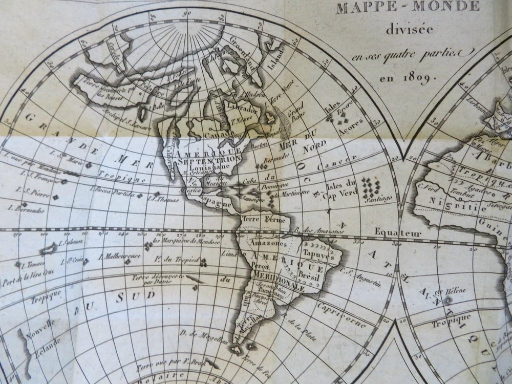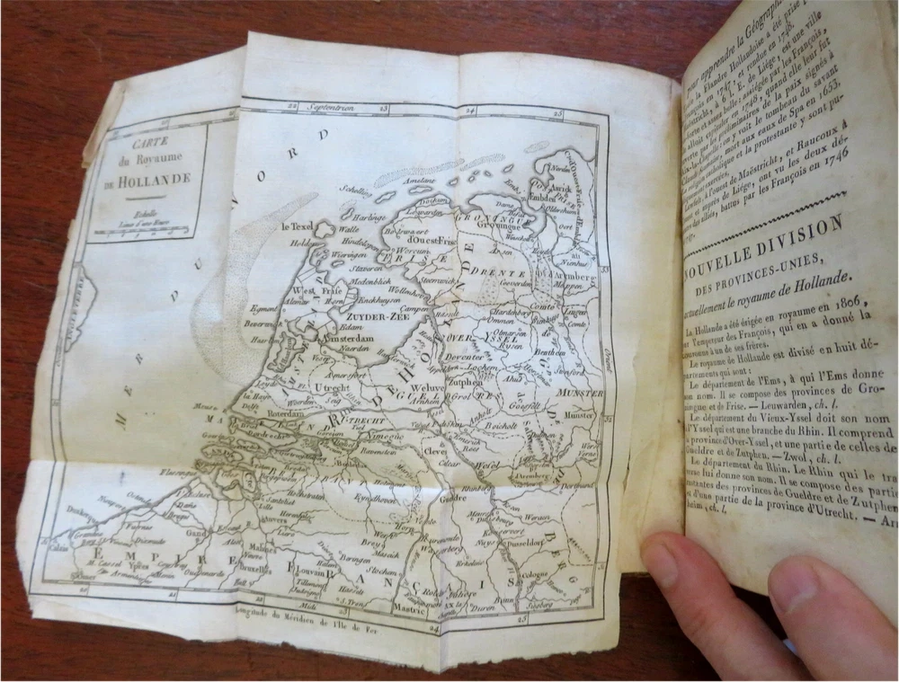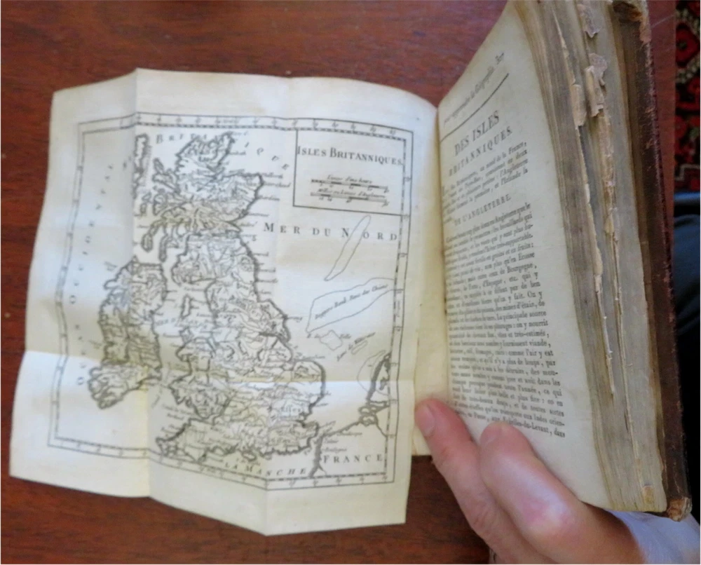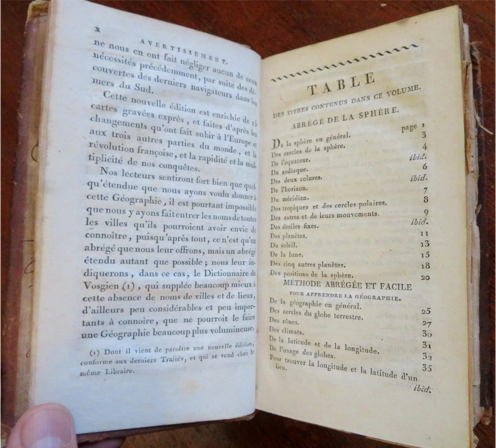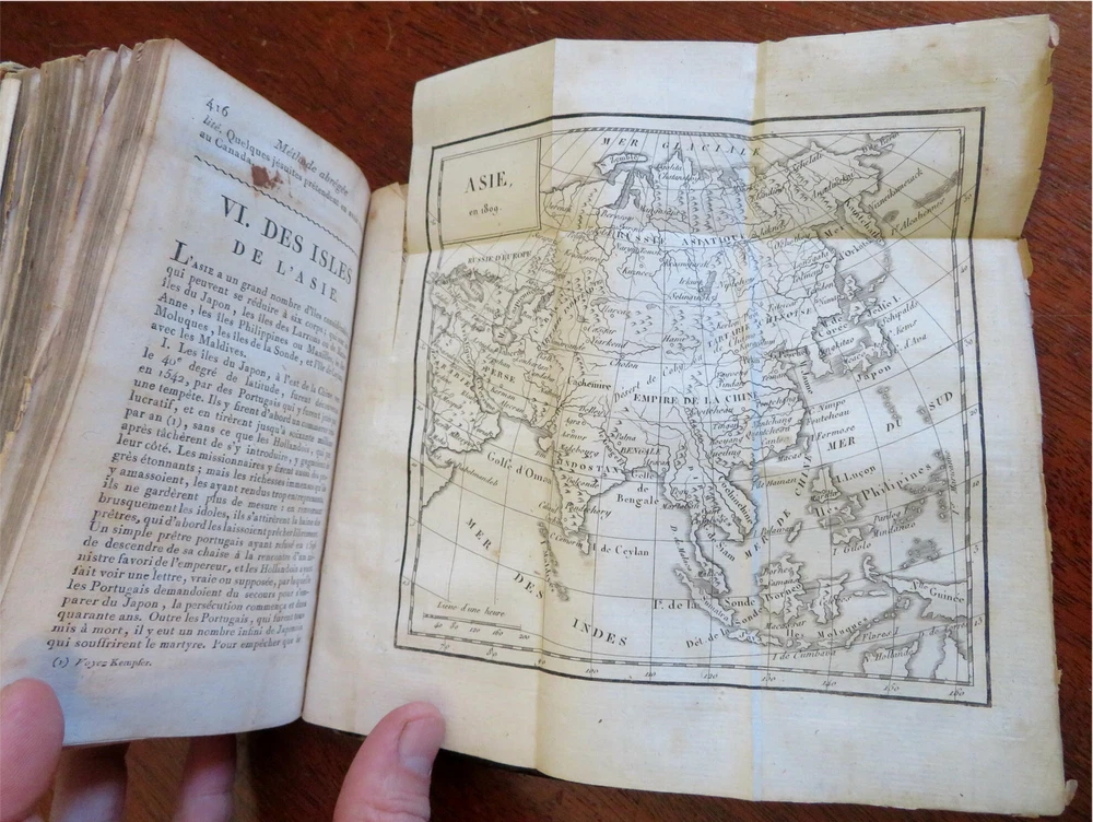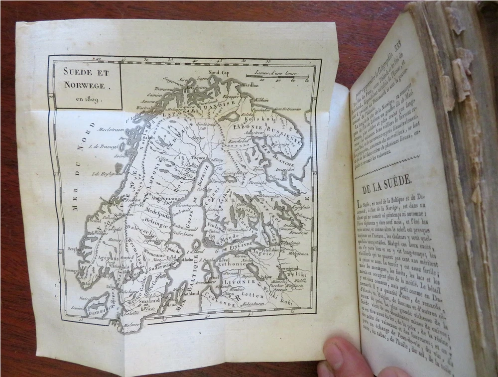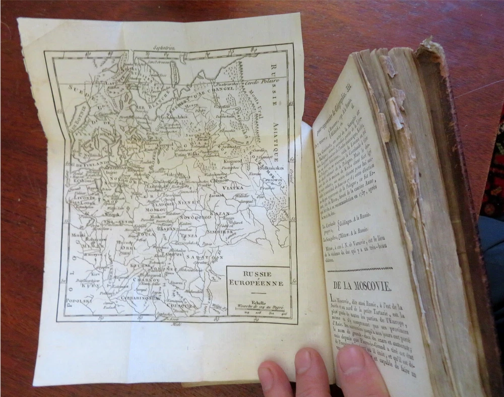 Napoleonic France Geography Book 1809 leather atlas w/ 16 world maps Napoleonic France Geography Book 1809 leather atlas w/ 16 world maps (Old Books, 19th Century Books, Leather Books, School Books, Text Books, Geography, Books with Maps, French Books). Methode Abregee et Facile Pour Appendre la Geographie. Published 1809, Paris by Auguste Delalain. 511 pages. Text in French. With 16 engraved folding maps of the world (including the continents and a world in spheres map). Attractive antiquarian full leather binding, smooth spine, gilt title lettering & spine decorations, Book is physically old and shows some signs of handling and time. Front cover almost detached, rear joint broken and cover loosened. Binding well age worn but still appealing, leather and joints rubbed but still supple, remains overall very attractive as an object. Text block paper is age toned as typical, some fraying to map edges from slightly protruding from text block over the years, Africa map has a short minor (closeable) split within it, internally book remains mostly clean, tight and sound. A book which has been taken care of but may/ does not look like new. Still attractive on the shelf. Book displays a pleasing and unique age patina and is in rather nice antiquarian condition, any age flaws seem easy to overlook or forgive. Please review photos for more detailed attempt to present this pocket geography/ small atlas as it survives. We often over-describe any flaws that many sellers would not even bother to mention since most people would overlook them as minor and unworthy of comment. Many people tell us the books they receive from us are nicer in person than they appears on the screen. We want you to be clear about what you are buying, so we take numerous photos and try to describe it openly and honestly. Book Measures c. 7" H x 4" W. [B8973].