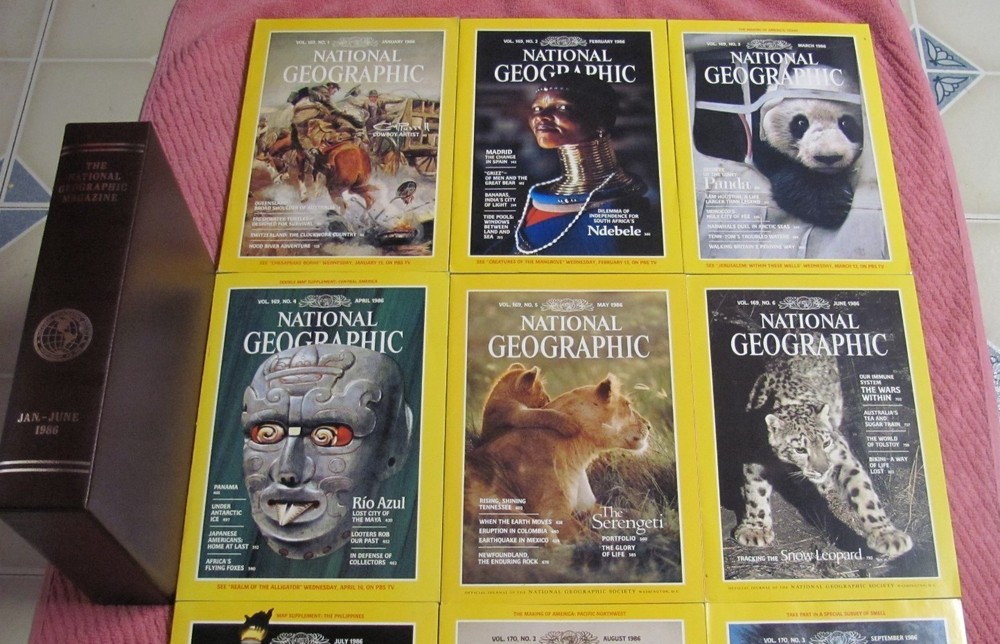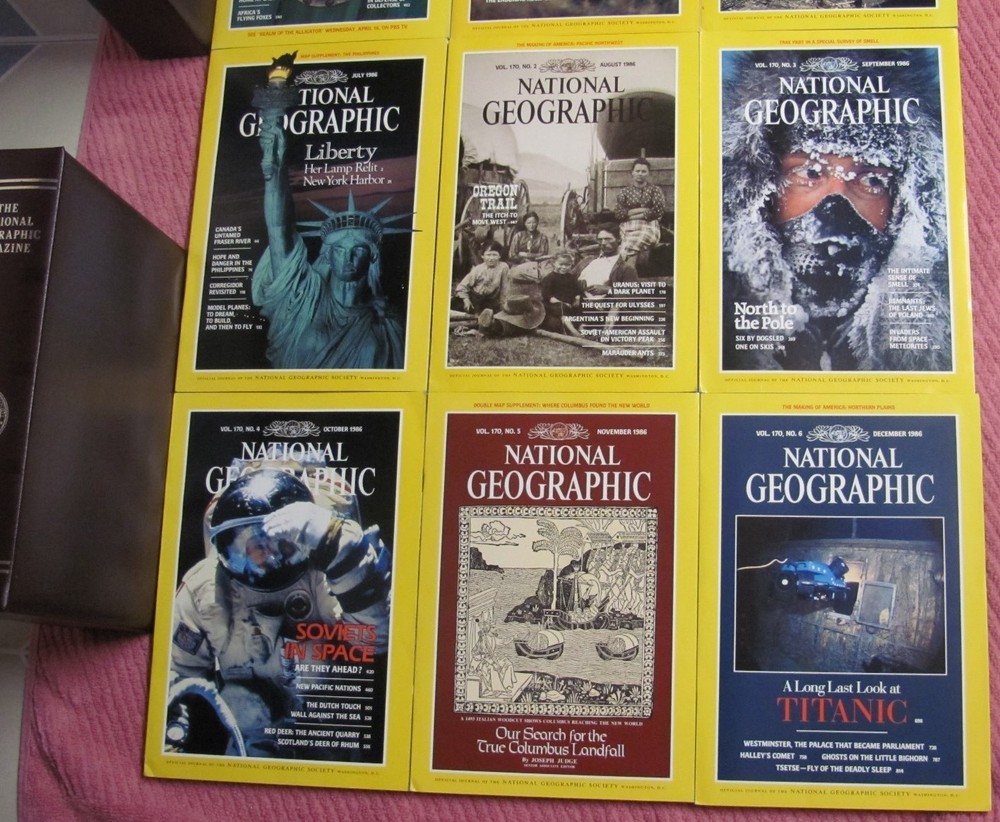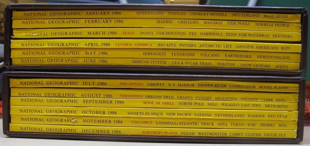 DESCRIPTION NATIONAL GEOGRAPHIC MAGAZINE - 12 ISSUES FOR YEAR 1986 - INCLUDES ALL MAPS - INCLUDES LEATHER BOUND SLIP COVERS - EXCELLENT CONDITION PLEASE REVIEW ALL PICTURES FOR DETAILS AND CONDITION AS THEY ARE PART OF MY DESCRIPTION. BBRNGM101 From non-smoking home The items you see in the pictures are the items you will receive. I do my best to show every aspect and/or defect so you can see exactly what you are bidding on. Please review all pictures carefully. Your bid means that you have read the complete description, inspected the pictures, asked any necessary questions and accept this item as is. Please feel free to ask questions before bidding. PAYMENT Payment is due with 5 days after the auction ends unless prior arrangements are made. SHIPMENT Shipments are made by USPS mail within 1 business day from date payment is cleared. RETURNS No returns accepted before contacting me please. I will work hard to make this an easy transaction and see to it that you are 100% satisfied. Unauthorized returns may be charged 20% restocking and buyer will be responsible for freight. POLICY Y our satisfaction is very important to me and I strive to earn 100% perfect "Five-Star" scores. PLEASE CONTACT ME REGARDING ANY PROBLEMS BEFORE LEAVING NEUTRAL OR NEGATIVE FEEDBACK TO GIVE ME THE OPPORTUNITY TO SEE THAT YOU ARE SATISIFED . Please report any defects, damages or material difference with your item 10 days of when you receive the item. If an item is damaged during transit, please take pictures of the packaging and the damaged item and contact me as soon as possible. On the other hand, if you are satisfied with your purchase, I would appreciate your positive feedback and five-star ratings. Positive feedback is left for you once the payment has cleared. ABOUT ME I have been with eBay since January 2001. I work hard to make your eBay experience a great on so you will come back to visit my other auctions and eBay Store. Thank you and your business is always appreciated!