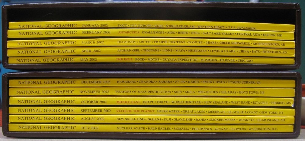 DESCRIPTION NATIONAL GEOGRAPHIC MAGAZINE - 11 ISSUES FOR YEAR 2002 JUNE IS MISSING - INCLUDES ALL MAPS - INCLUDES LEATHER BOUND SLIP COVERS - EXCELLENT CONDITION PLEASE REVIEW ALL PICTURES FOR DETAILS AND CONDITION AS THEY ARE PART OF MY DESCRIPTION. FBRNGM107 From non-smoking home The items you see in the pictures are the items you will receive. I do my best to show every aspect and/or defect so you can see exactly what you are bidding on. Please review all pictures carefully. Your bid means that you have read the complete description, inspected the pictures, asked any necessary questions and accept this item as is. Please feel free to ask questions before bidding. PAYMENT Payment is due with 5 days after the auction ends unless prior arrangements are made. SHIPMENT Shipments are made by USPS mail within 1 business day from date payment is cleared. RETURNS No returns accepted before contacting me please. I will work hard to make this an easy transaction and see to it that you are 100% satisfied. Unauthorized returns may be charged 20% restocking and buyer will be responsible for freight. POLICY Y our satisfaction is very important to me and I strive to earn 100% perfect "Five-Star" scores. PLEASE CONTACT ME REGARDING ANY PROBLEMS BEFORE LEAVING NEUTRAL OR NEGATIVE FEEDBACK TO GIVE ME THE OPPORTUNITY TO SEE THAT YOU ARE SATISIFED . Please report any defects, damages or material difference with your item 10 days of when you receive the item. If an item is damaged during transit, please take pictures of the packaging and the damaged item and contact me as soon as possible. On the other hand, if you are satisfied with your purchase, I would appreciate your positive feedback and five-star ratings. Positive feedback is left for you once the payment has cleared. ABOUT ME I have been with eBay since January 2001. I work hard to make your eBay experience a great on so you will come back to visit my other auctions and eBay Store. Thank you and your business is always appreciated!