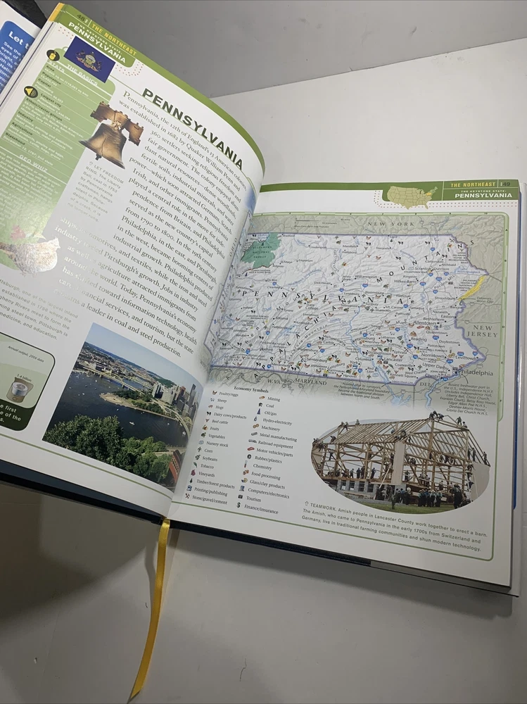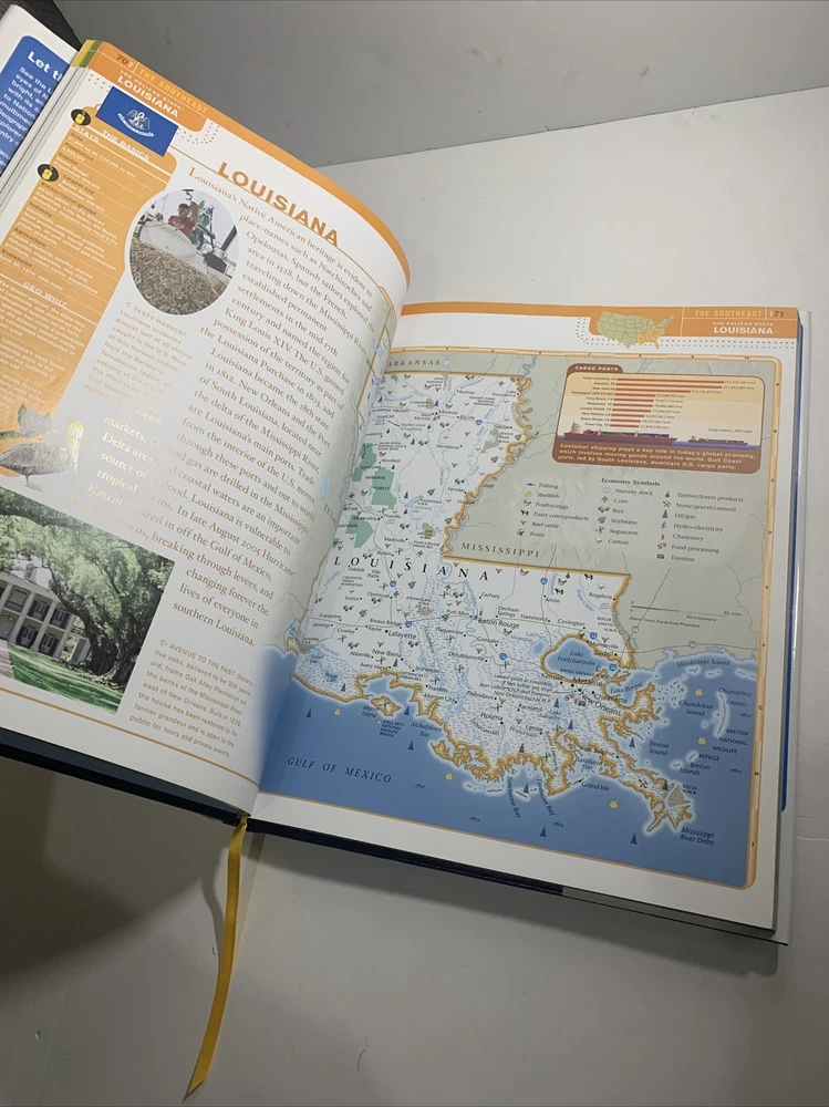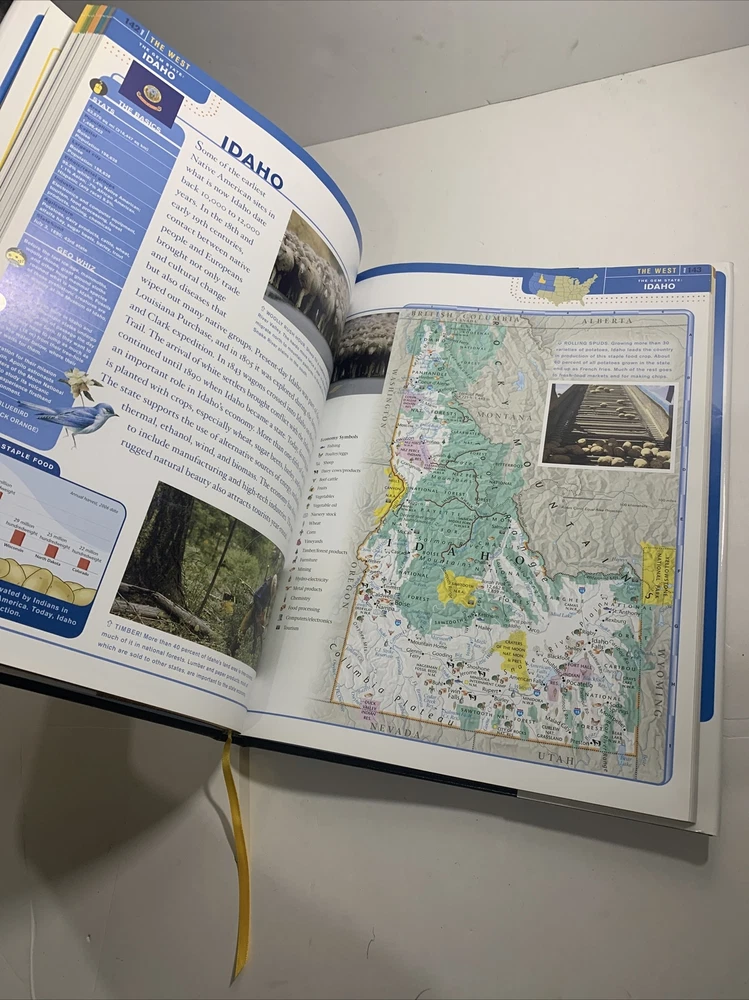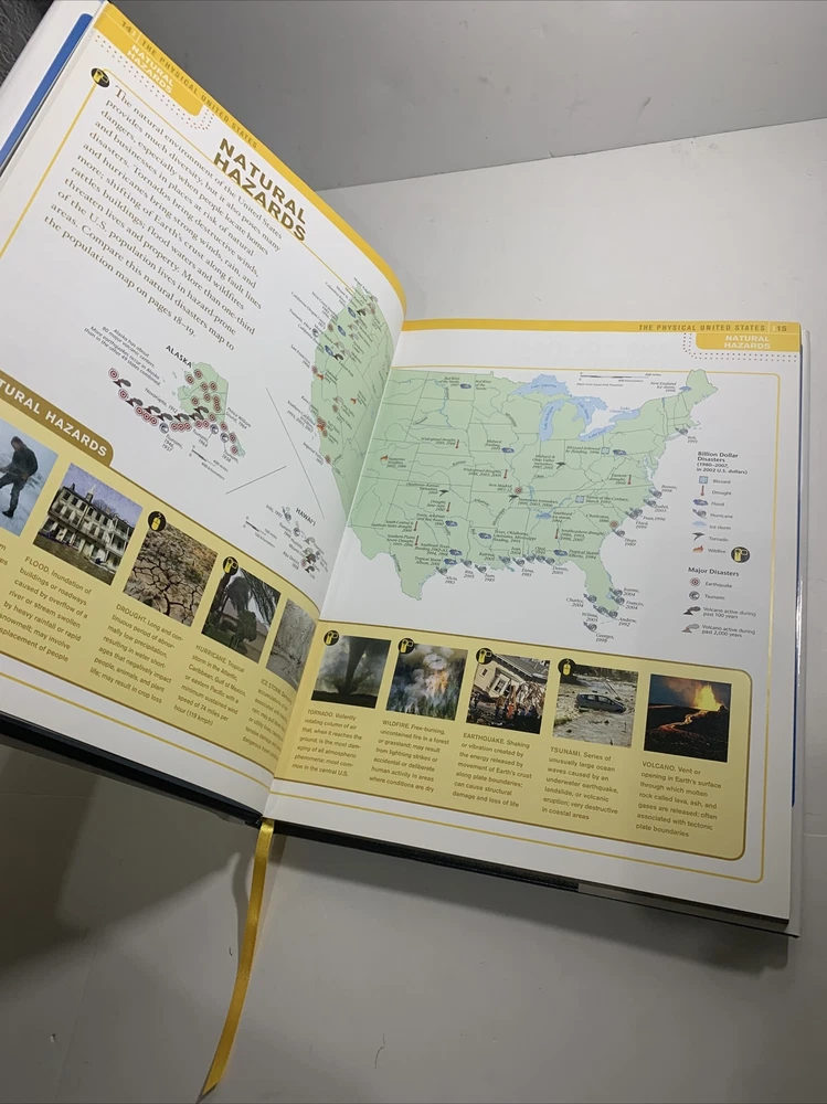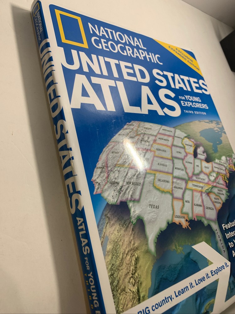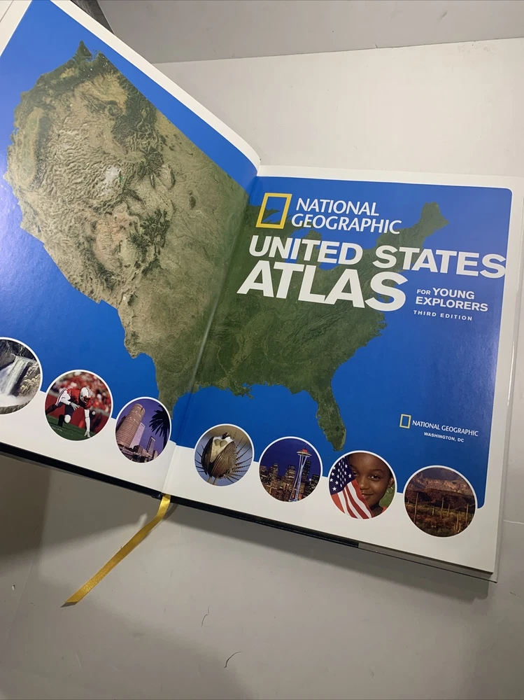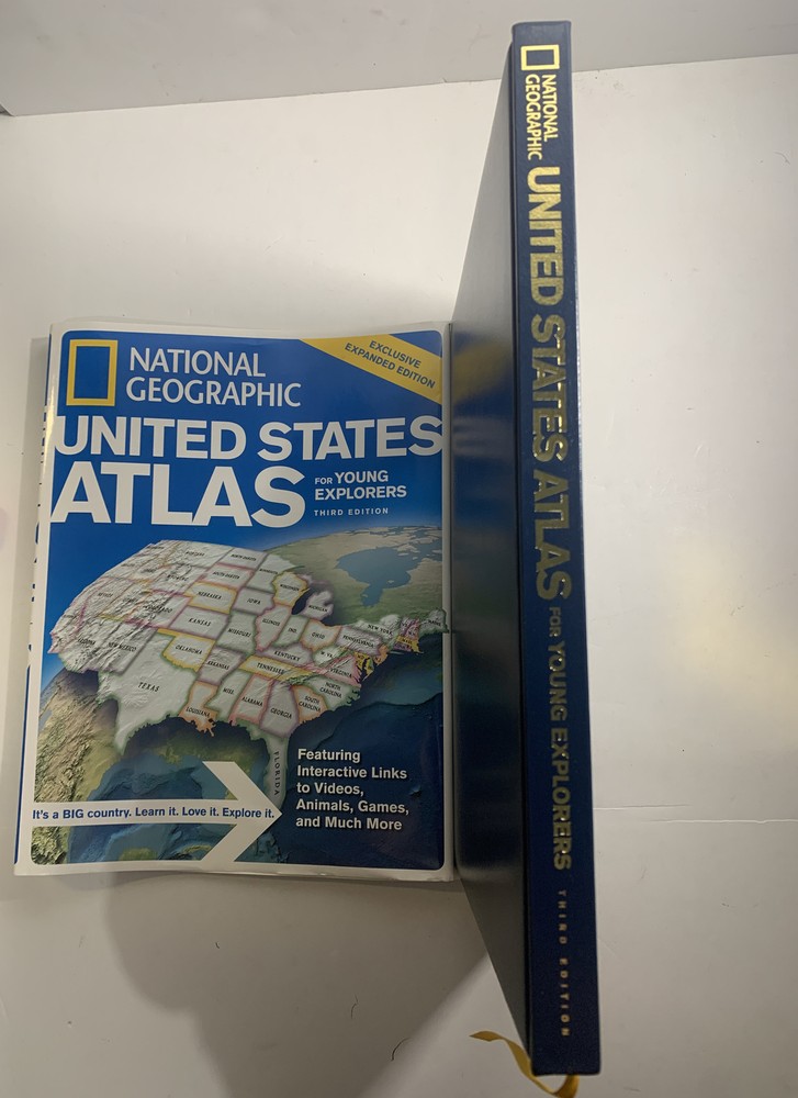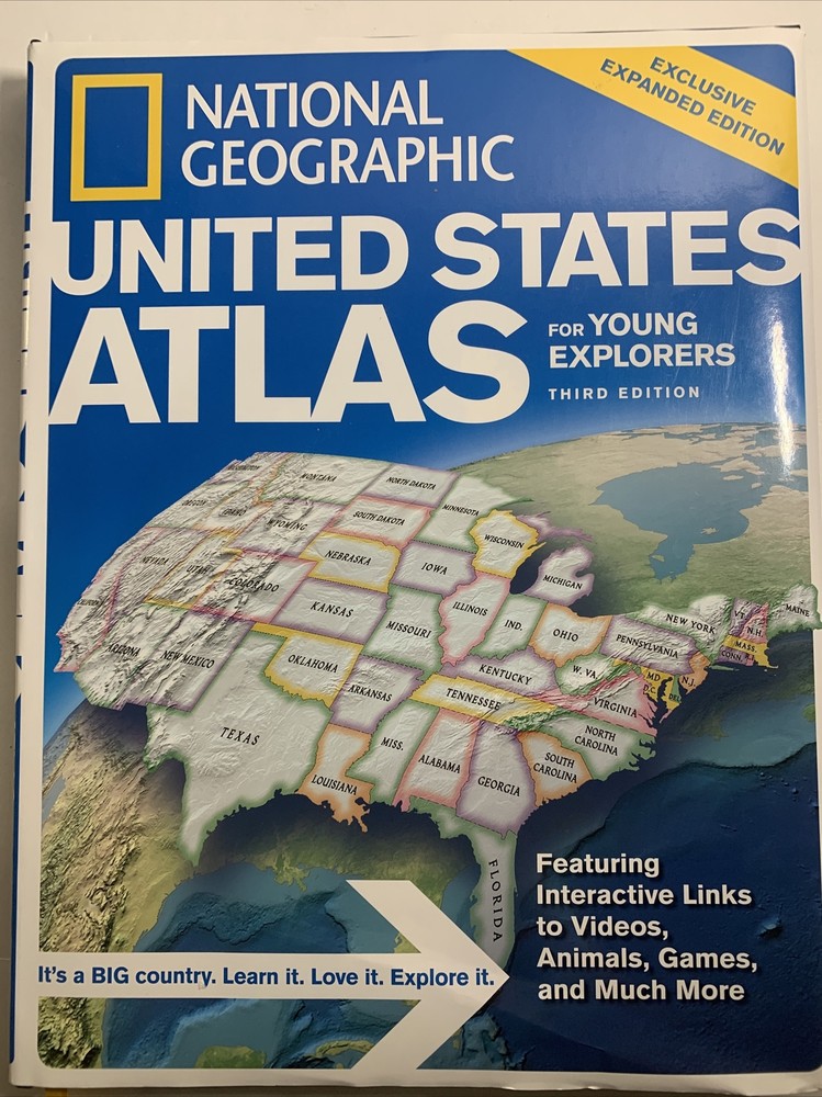 National Geographic United States Atlas for Young Explorers. Featuring interactive links to videos, animals, games, and so much more. This is a huge padded leather bound book, with gold gilt page edges and a page ribbon. An Exclusive Expanded Edition, Third Edition. Measuring approximately 14” x 10.5”. Colorfully illustrated throughout its 207 printed pages.