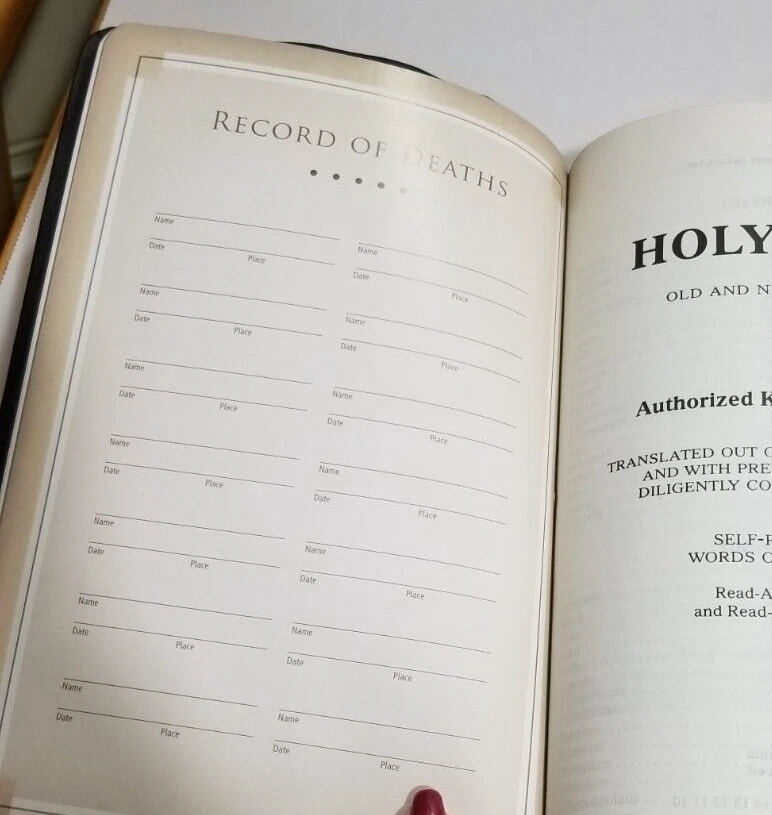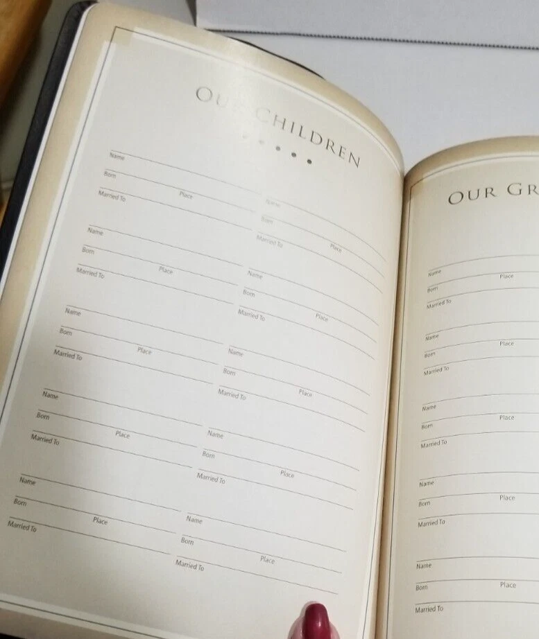 Holy Bible - Giant Print - Black Leathersoft (Imitation Leather) Cover - Red Letter Edition (Read-Along References and Faith-Building) Authorized King James Version Translated Out of the Original Tongues and With Previous Translations Diligently Compared and Revised Self-Pronouncing Words of Christ in Red with Read-Along References and Read-Along Translations In this edition, each book of the Bible begins with a concise introduction provided by the publisher. Personal Records Pages: Presentation Page Church Record Marriage (Holy Matrimony)Record Husband's Family Tree Wife's Family Tree Our Children Our Grandchildren Record of Deaths In very good condition overall with some wear/dings on the cover. All pages, very clean and intact. All family records pages are pristine and blank. Please feel free to contact me if you have any questions. Buyer to pay all shipping; just check the shipping calculator for your options. Thanks for looking!