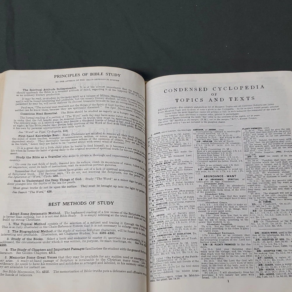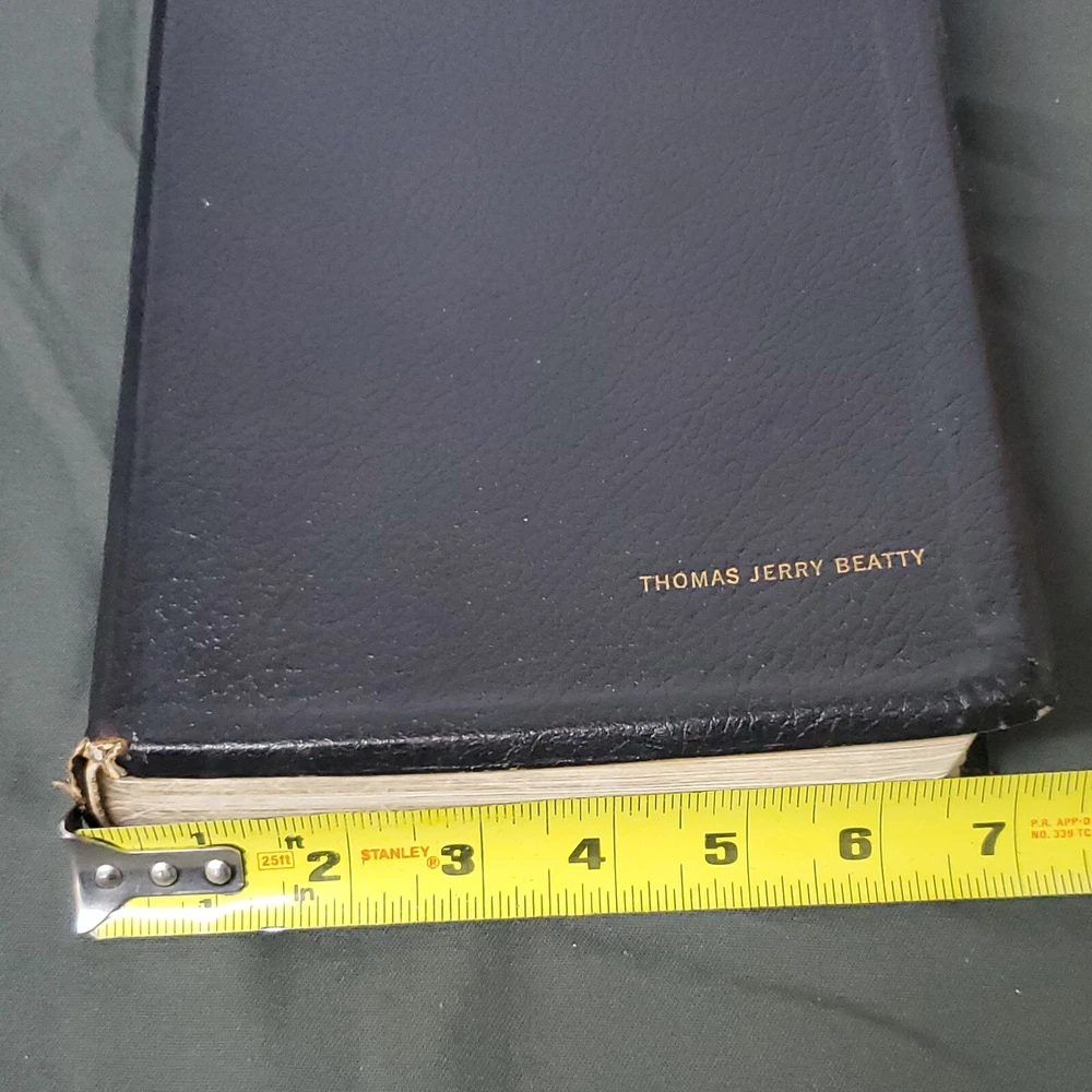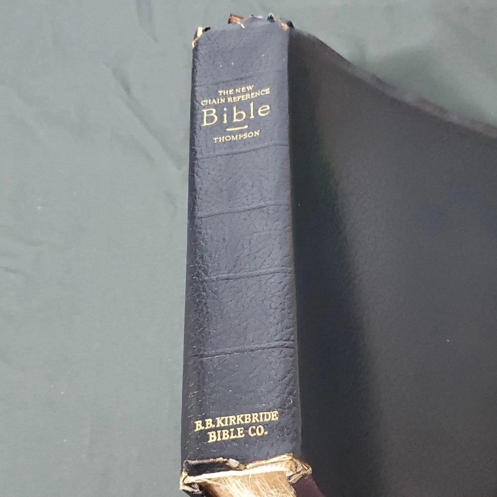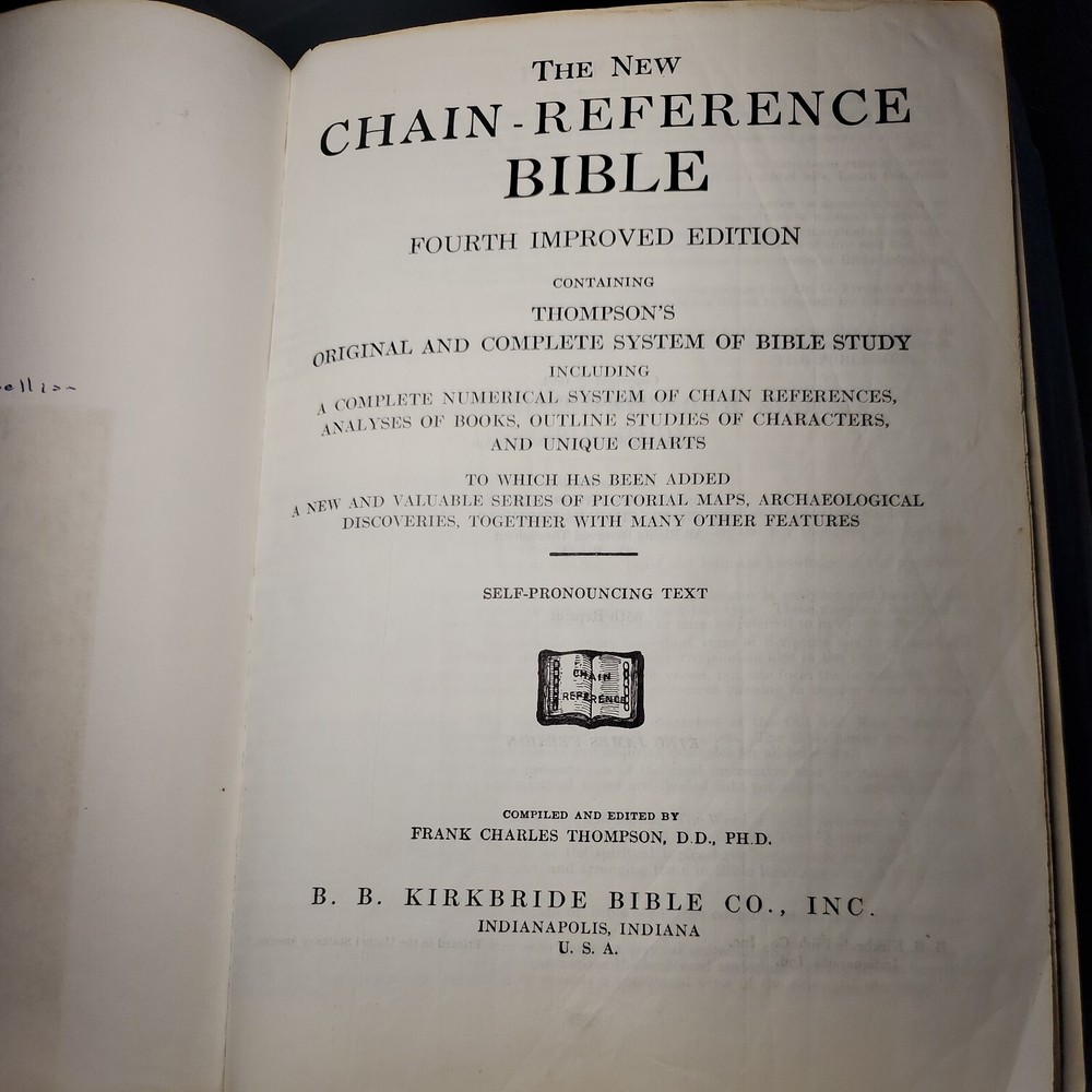 New Chain Reference Bible Thompson's 4th Improved Edition 1964 King James Version KJV. The New Chain Reference Bible Fourth Improved Edition" by Thompson. In the King James Version (KJV). 1964 by B. B. Kirkbride Bible Co. 55th reprint. Has name embossed on front cover as shown. In nice condition otherwise, showing some wear mainly on spine ends. Many markings notes highlighting. Old ribbon gone, new glued in. Weight is 2 lb 11 oz before packaging. 7 × 9¼ × 1½" Offers always considered. Thank you for looking. PS1-3bb.031124.34.9