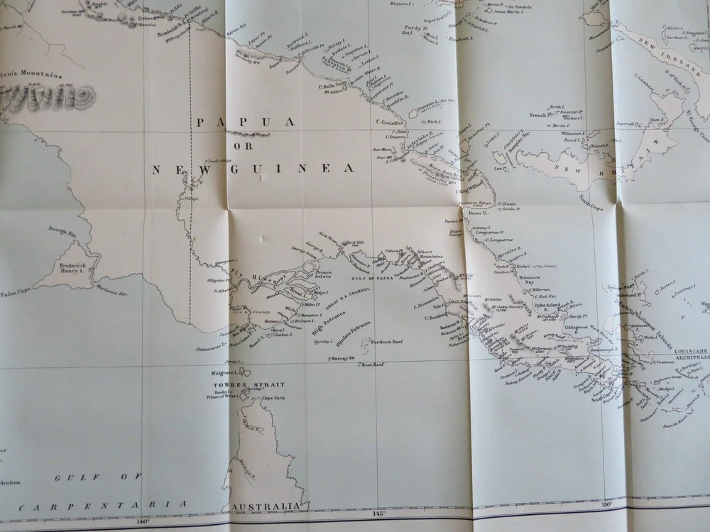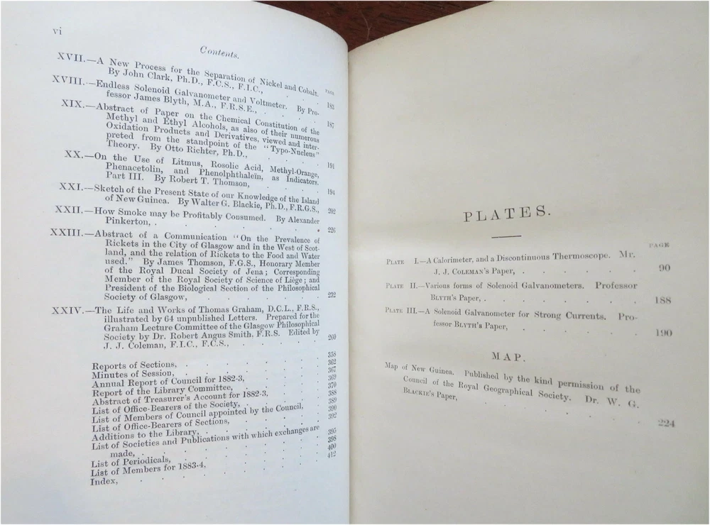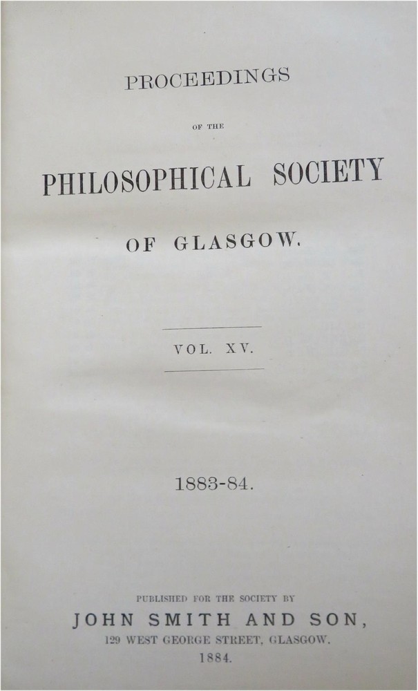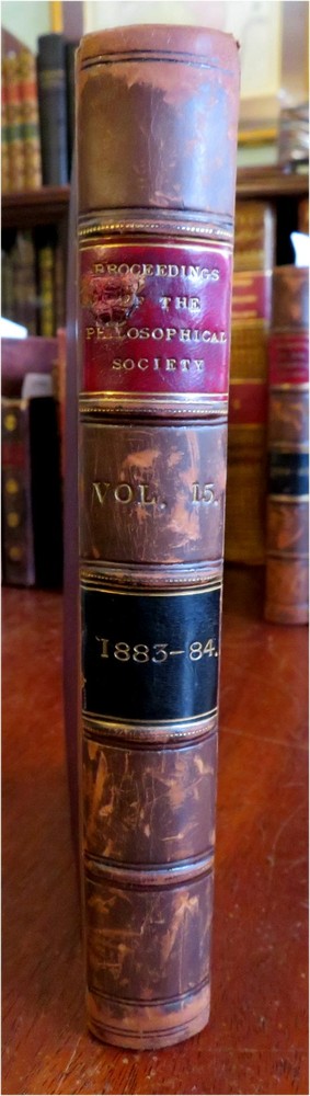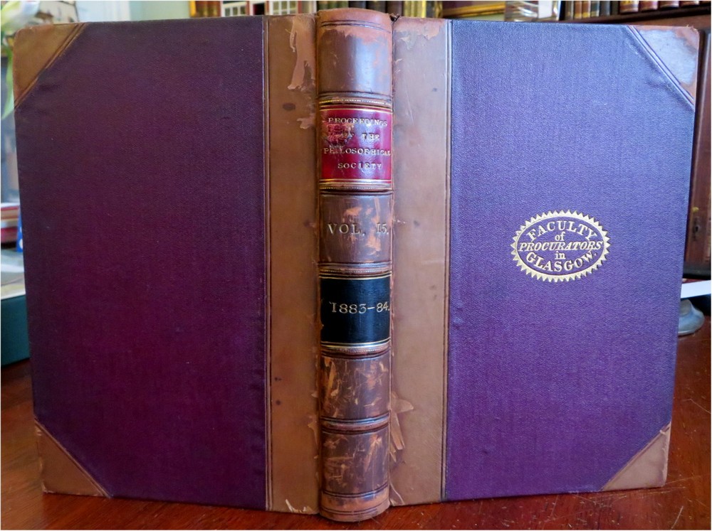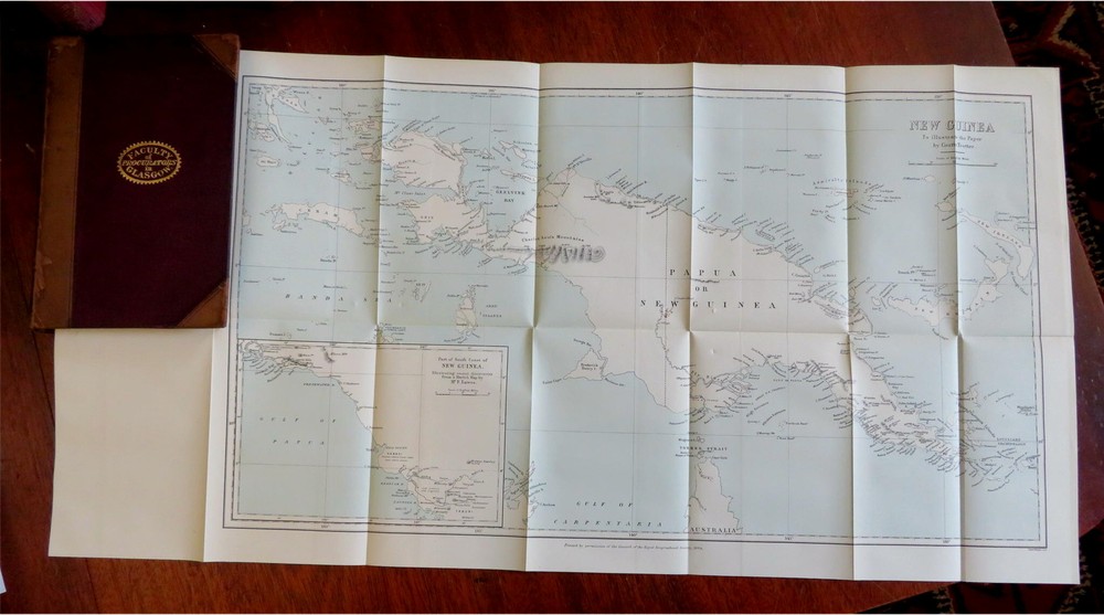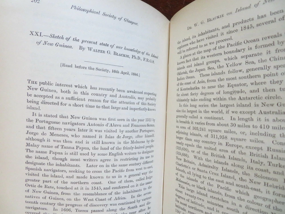 New Guinea map Glasgow Philosophical Society 1883-84 illustrated leather book New Guinea map Glasgow Philosophical Society 1883-84 illustrated leather book (Old Books, 19th Century Books, Leather Books, Glasgow, Philosophical Society, Illustrated Books). Proceedings of the Philosophical Society of Glasgow, Vol. XV 1883-84. Published 1884, Glasgow by John Smith and Son. 428 pages. Text in English. Illustrated, including a large folding color litho map of New Guinea with a lengthy article discussing the present state of knowledge about it by Walter Blackie, PhD. Attractive antiquarian 1/2 leather binding, raised & gilt bands, gilt title lettering on contrasting leather labels. Book is physically old and shows some signs of handling and time. Binding age worn but still appealing, leather and joints scuffed and slightly rubbed but still supple, remains overall very attractive as an object. Text block paper is gently age toned as typical, some pages display some spot staining, internally book remains mostly clean, tight and sound. A book which has been taken care of but may/ does not look like new. Still attractive on the shelf. Book displays a pleasing and unique age patina and is in rather nice antiquarian condition, any age flaws seem easy to overlook or forgive. Please review photos for more detailed attempt to present this book as it survives. We often over-describe any flaws that many sellers would not even bother to mention since most people would overlook them as minor and unworthy of comment. Many people tell us the books they receive from us are nicer in person than they appears on the screen. We want you to be clear about what you are buying, so we take numerous photos and try to describe it openly and honestly. Book Measures c. 8 1/2" H x 5 3/4" W. [B9105].