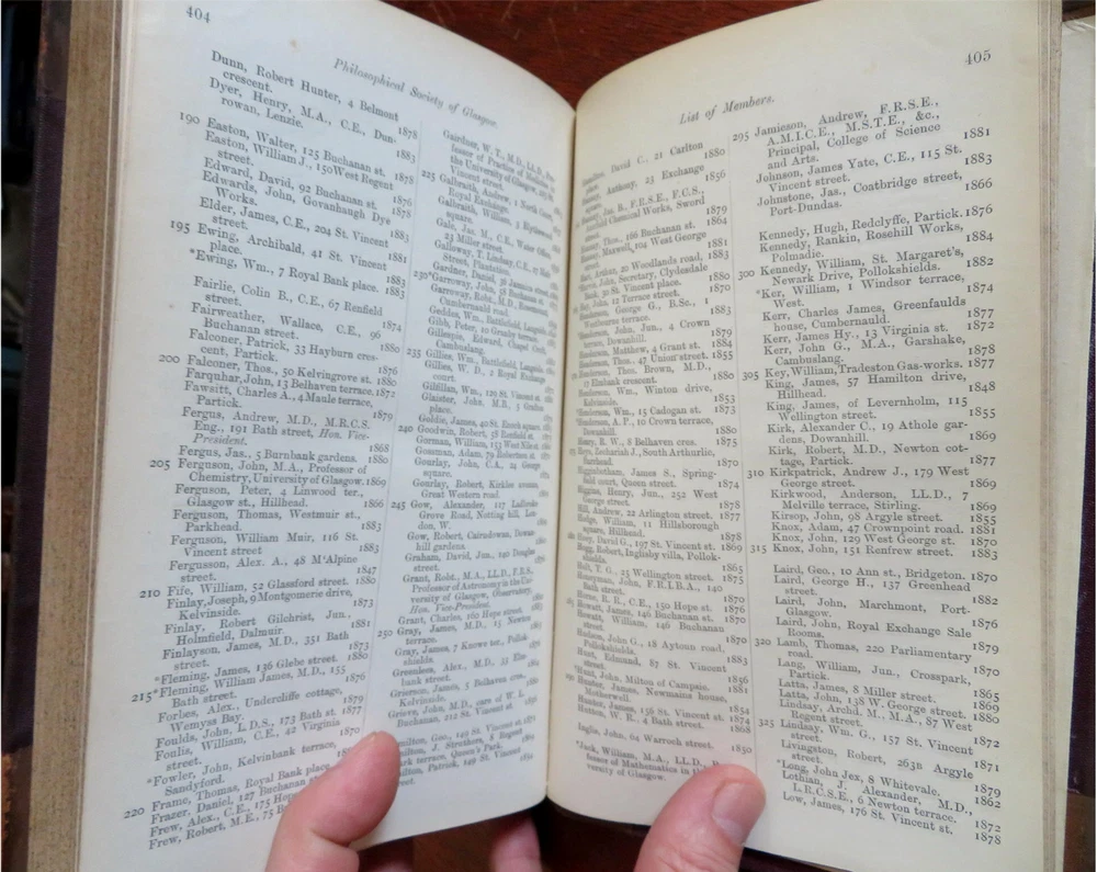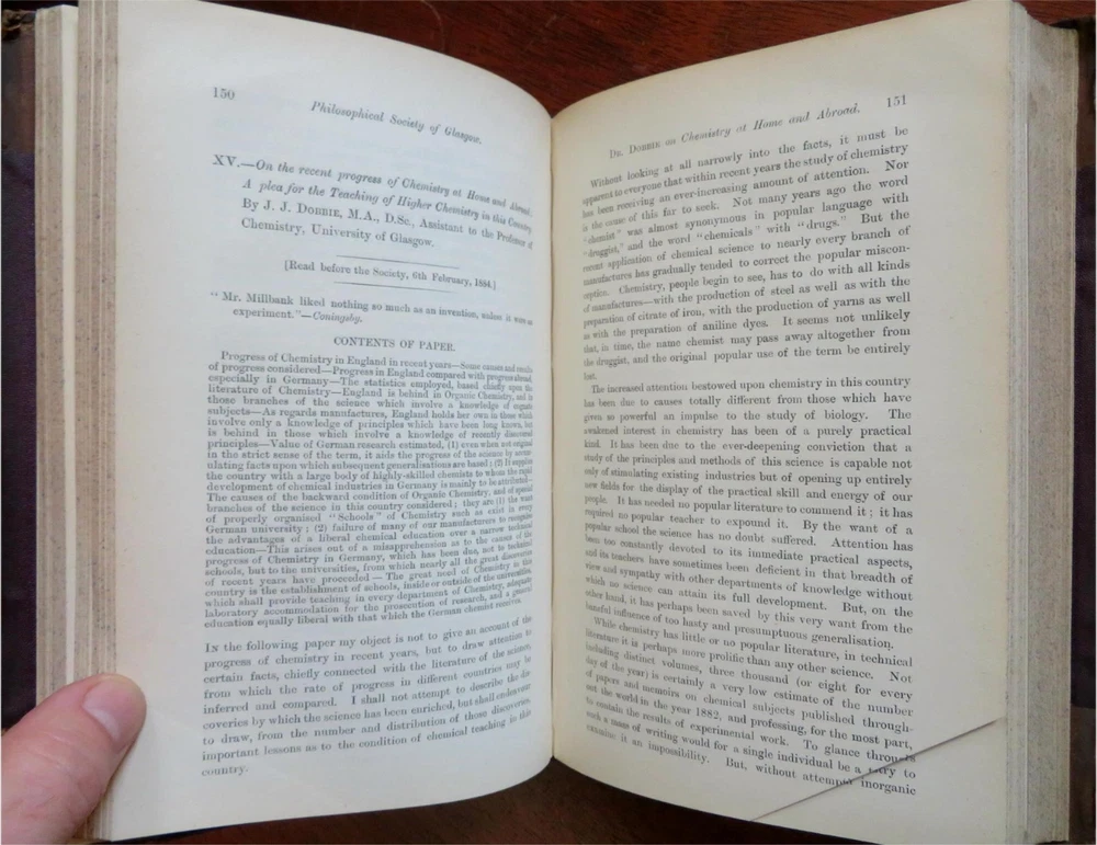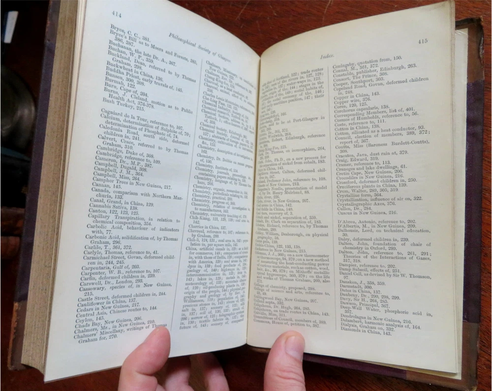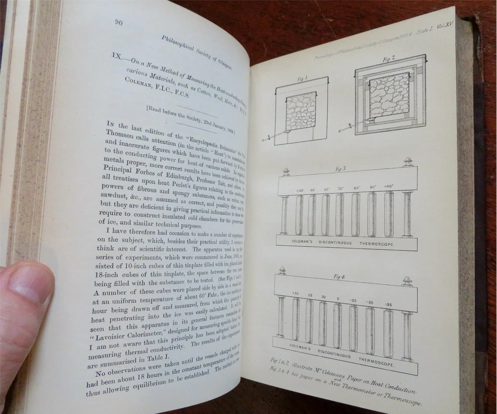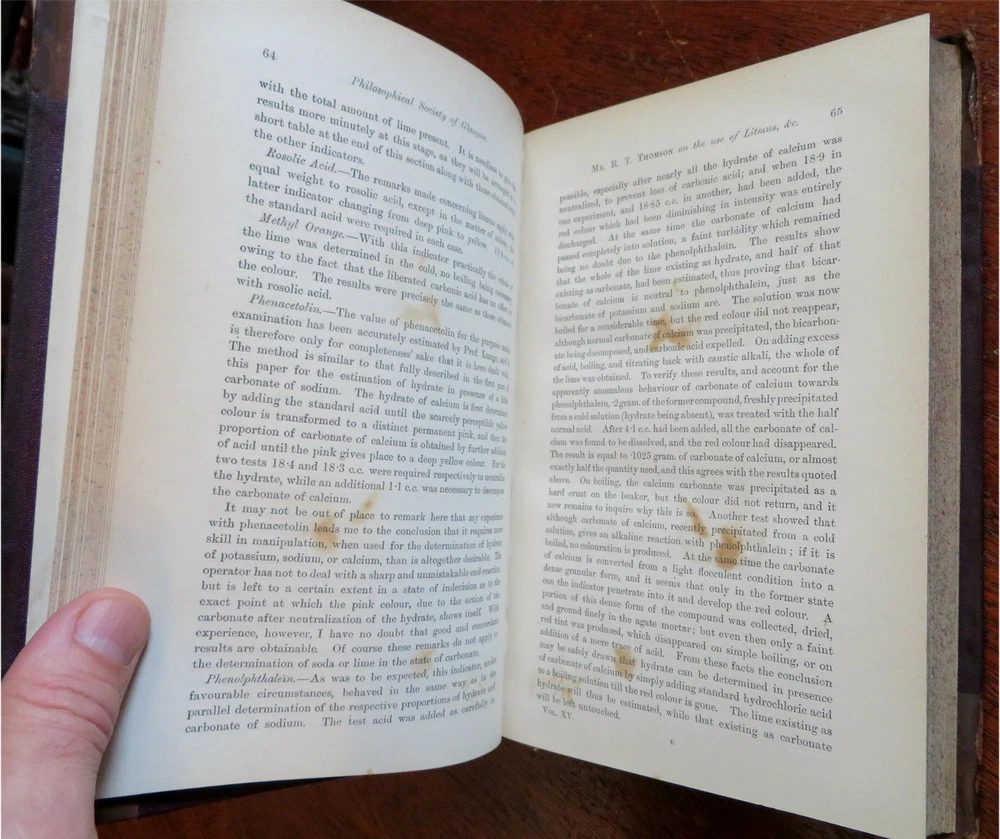 New Guinea map Glasgow Philosophical Society 1883-84 illustrated leather book New Guinea map Glasgow Philosophical Society 1883-84 illustrated leather book (Old Books, 19th Century Books, Leather Books, Glasgow, Philosophical Society, Illustrated Books). Proceedings of the Philosophical Society of Glasgow, Vol. XV 1883-84. Published 1884, Glasgow by John Smith and Son. 428 pages. Text in English. Illustrated, including a large folding color litho map of New Guinea with a lengthy article discussing the present state of knowledge about it by Walter Blackie, PhD. Attractive antiquarian 1/2 leather binding, raised & gilt bands, gilt title lettering on contrasting leather labels. Book is physically old and shows some signs of handling and time. Binding age worn but still appealing, leather and joints scuffed and slightly rubbed but still supple, remains overall very attractive as an object. Text block paper is gently age toned as typical, some pages display some spot staining, internally book remains mostly clean, tight and sound. A book which has been taken care of but may/ does not look like new. Still attractive on the shelf. Book displays a pleasing and unique age patina and is in rather nice antiquarian condition, any age flaws seem easy to overlook or forgive. Please review photos for more detailed attempt to present this book as it survives. We often over-describe any flaws that many sellers would not even bother to mention since most people would overlook them as minor and unworthy of comment. Many people tell us the books they receive from us are nicer in person than they appears on the screen. We want you to be clear about what you are buying, so we take numerous photos and try to describe it openly and honestly. Book Measures c. 8 1/2" H x 5 3/4" W. [B9105].