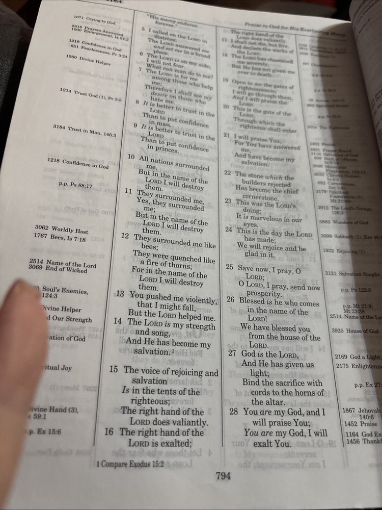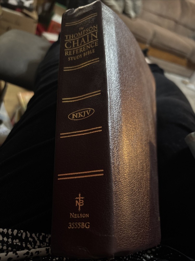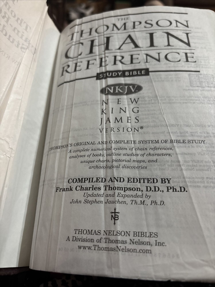 New King James Thompson Chain Reference Study Bible Genuine Leather. Imprinted good use condition. There are some wrinkled pages. An excellent study Bible.