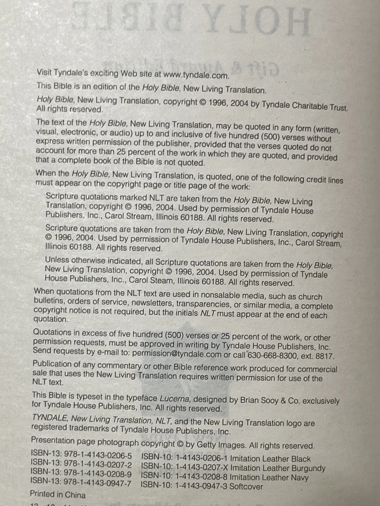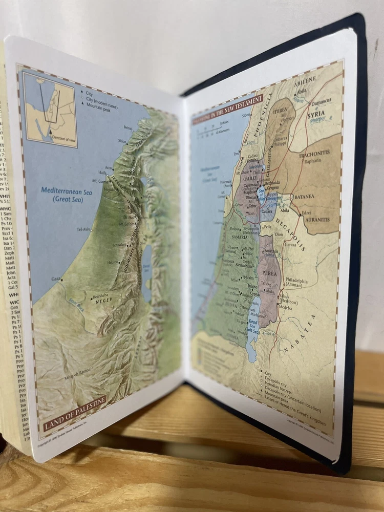 New Living Translation (NLT) Blue Bonded Leather EZ Carry Size Bible Red Letter Edition, 2nd Edition This blue bonded leather Bible is the perfect size for carrying with you on the go. It features red letters for the words of Christ, as well as maps, a concordance, and notes to aid in your reading. The 2nd edition was published in 2004 by Tyndale House Publishers, and the New Living Translation (NLT) makes this Bible accessible and easy to understand. The faux leather binding and gold edges add to the elegant look of this edition. Use it for study or personal reflection, regardless of your spiritual beliefs or background. LOOK CLOSELY AT ALL PHOTOS BEFORE BIDDING SO THAT YOU MAY DECIDE FOR YOURSELF THIS ITEMS VALUE AND CONDITION. PHOTO REVIEW IS THE MOST IMPORTANT ELEMENT OF YOUR DUE DILIGENCE. PLEASE NOTE WE ATTEMPT TO DESCRIBE EACH LISTING ACCURATELY. PLEASE ASK QUESTIONS IF YOU HAVE QUESTIONS. SHIPPING ALL ITEMS ARE VIDEO TAPED AS THEY ARE PACKAGED, WEIGHED AND SEALED FOR SHIPPING. COMBINED SHIPPING IS OFFERED IF PAYMENT IS MADE ON ONE INVOICE CONTAINING ALL ITEMS WON. THE FULL SHIPPING FEE IS CHARGED ON THE FIRST ITEM AND HALF THE FEE FOR EACH ITEM AFTER THAT. SHIPPING AND HANDLING COSTS INCLUDE INSURANCE . ALL PACKAGES ARE AT CARRIERS LOCATION WITHIN 24-48 HOURS (OTHER THAN SUNDAYS & HOLIDAYS.) OF RECEIVING PAYMENT. PLEASE ACCEPT/REALIZE THAT SELLER CANNOT BE HELD RESPONSIBLE FOR POST OFFICE, FEDEX OR UPS DELIVERY DELAYS. WE OPERATE WITH LIMITED INTERNATIONAL SHIPPING. FEEDBACK WE WOULD GREATLY APPRECIATE YOU LEAVING POSITIVE FEEDBACK FOR US, AS THIS HELPS THE ENTIRE EBAY COMMUNITY OF SHOPPERS FEEL CONFIDENT ABOUT PURCHASING FROM US IN THE FUTURE. IF THERE ARE ANY CONCERNS REGARDING YOUR PURCHASE, PLEASE CONTACT US BEFORE CONTACTING EBAY AND WE WILL RECTIFY THE SITUATION. PLEASE EMAIL US WITH ANY QUESTIONS YOU MAY HAVE BEFORE BIDDING. - We package carefully and ship within 24-48 hours (weekends). Thanks so much for looking - God's richest Blessings, Cindy & John (VISIT OUR STORE www.ebay.com/str/wilsonfamilyresellers)