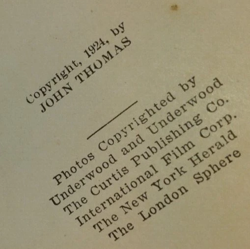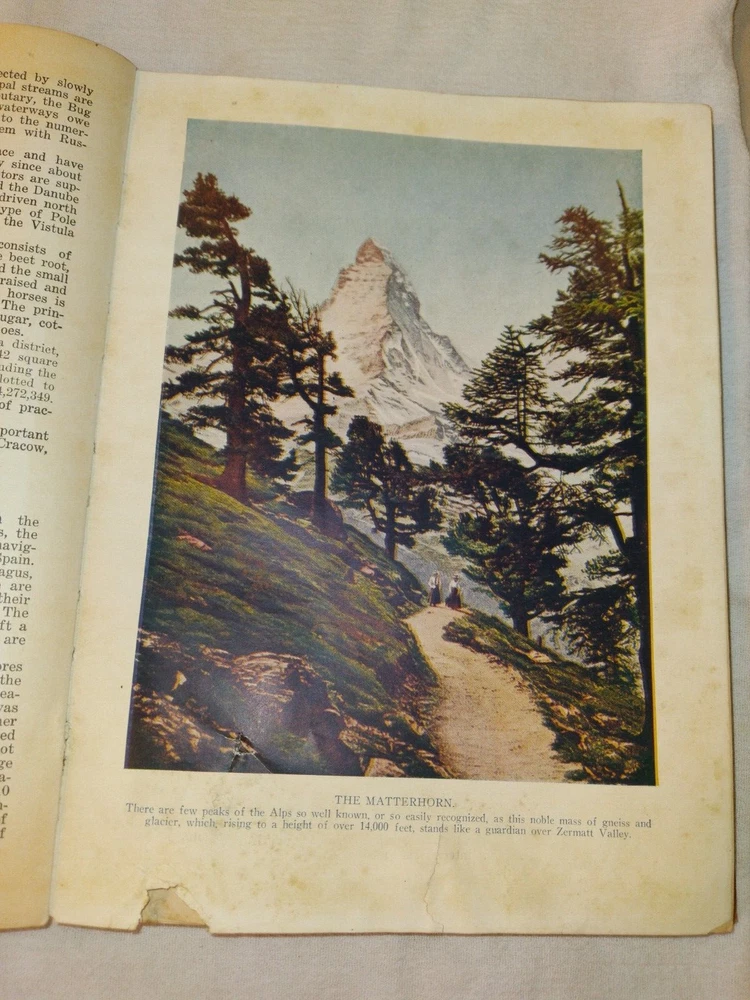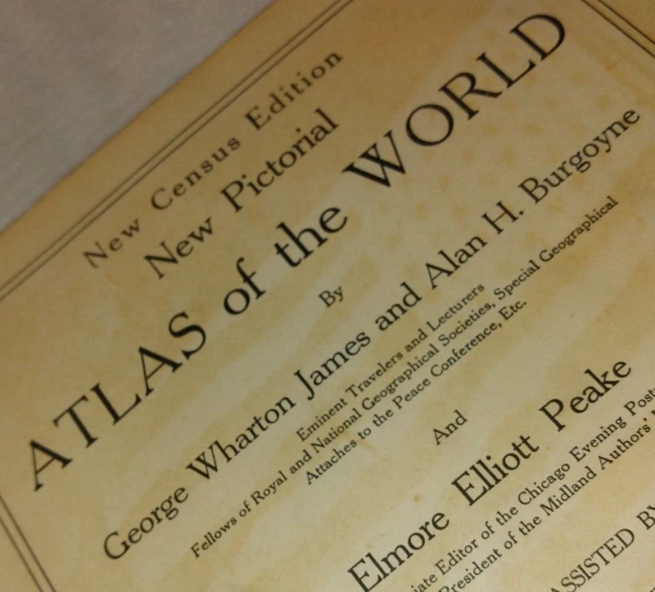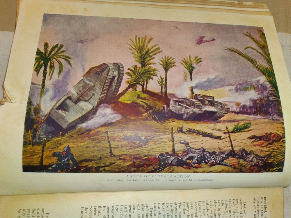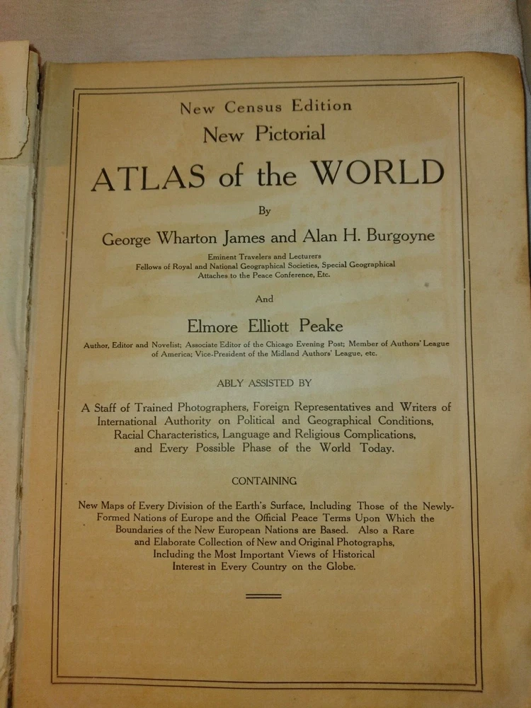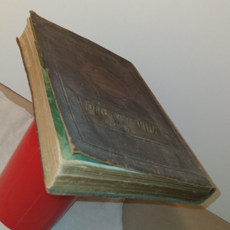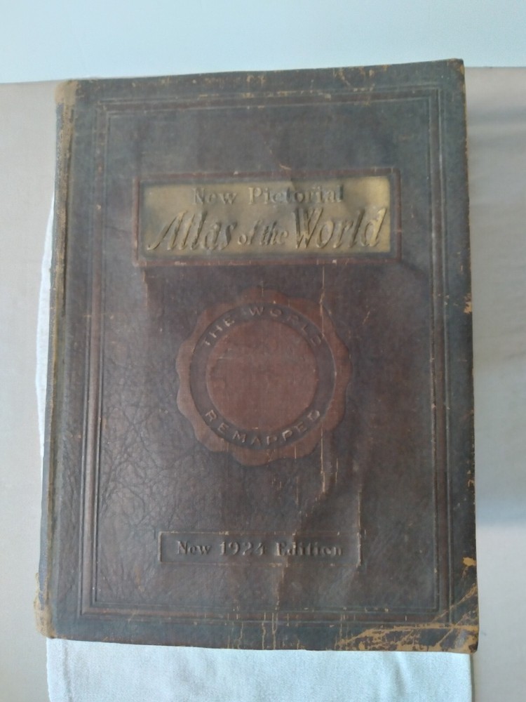 1924 Edition of an Atlas of the World. Lots of photos, several in color. 384 pages plus another 47 of index, Original leather cover, The color illustrations are heavy on World War One content because it had ended just 6 years before this was published. Interesting to see the differences in the civilized world between then and now. ATTENTION!!! This book has been sold and returned recently here on ebay. I felt that the photos, which I have not changed, sufficiently showed the damage it has sustained over a century. Gouges, scrapes, punctures--it looks as if it went through a meat grinder. YET, it is structurally sound, despite a page or three up front being loose. Furthermore, it was written at a time which in hindsight was near the beginning of the spike on the 'hockey stick' graph of human history. Oddly, I can't find the typical copyright information. There is a line or two about photo credits, but no book publisher.