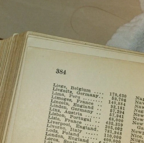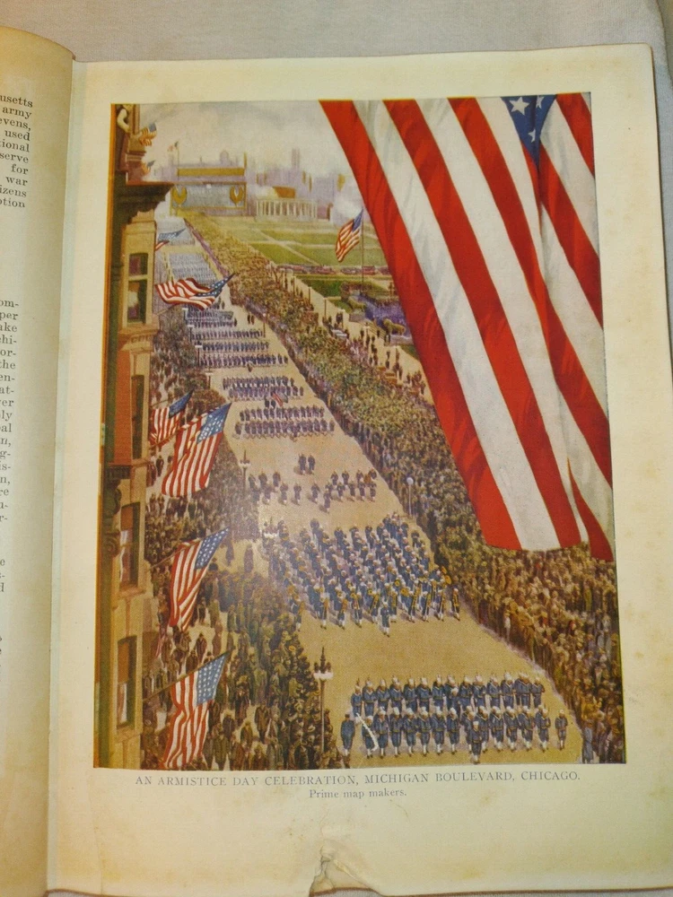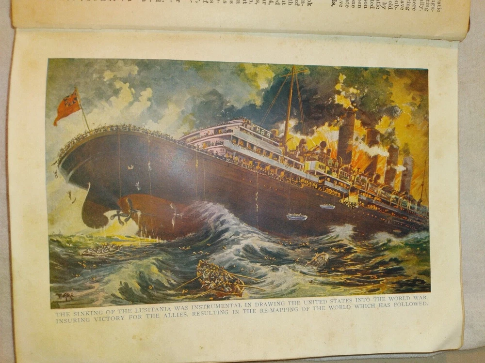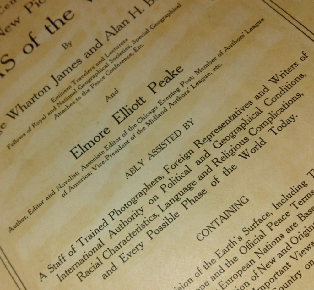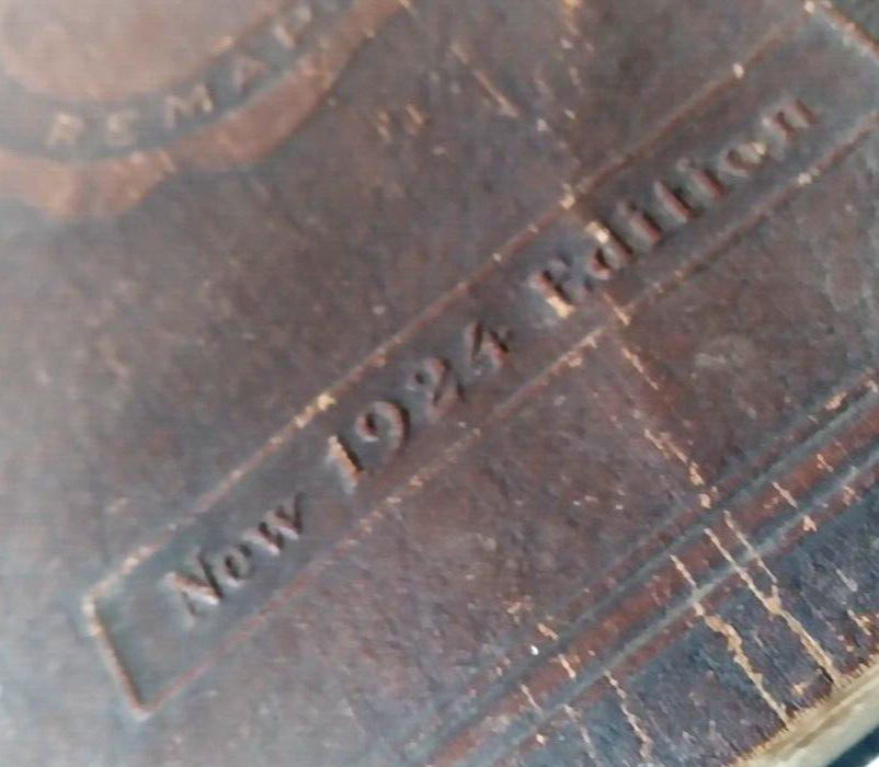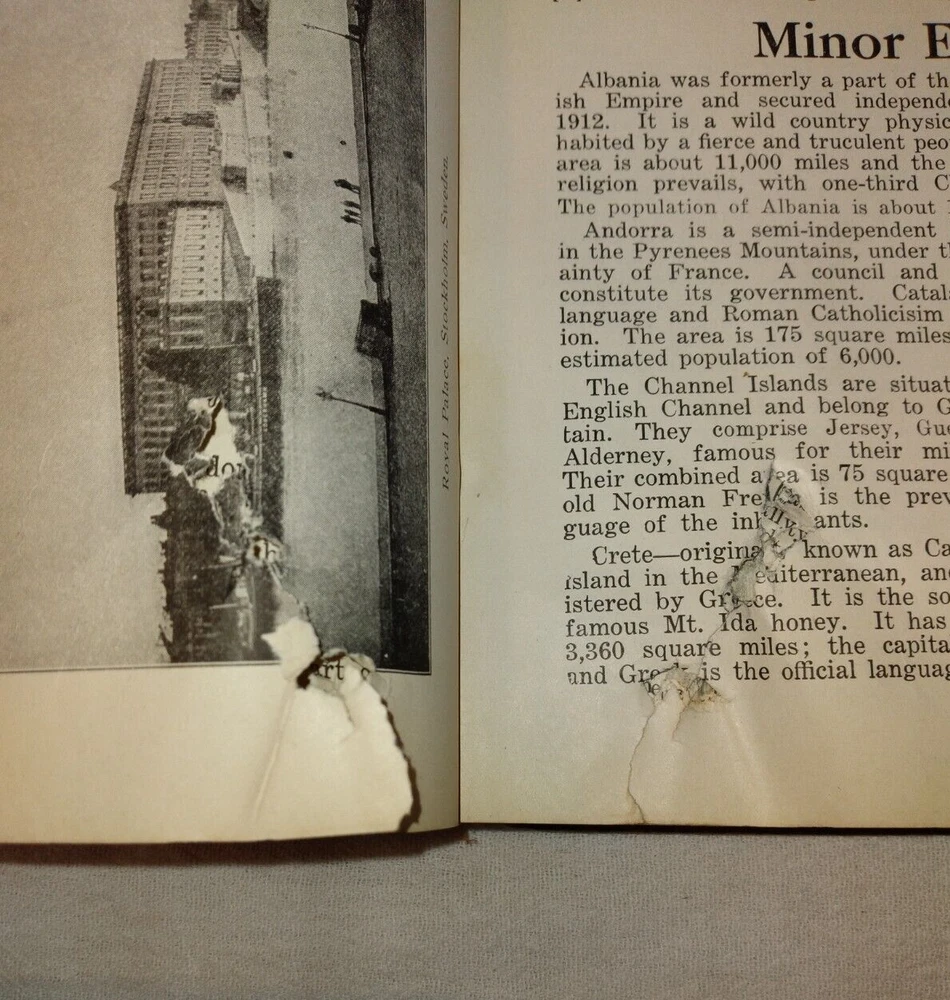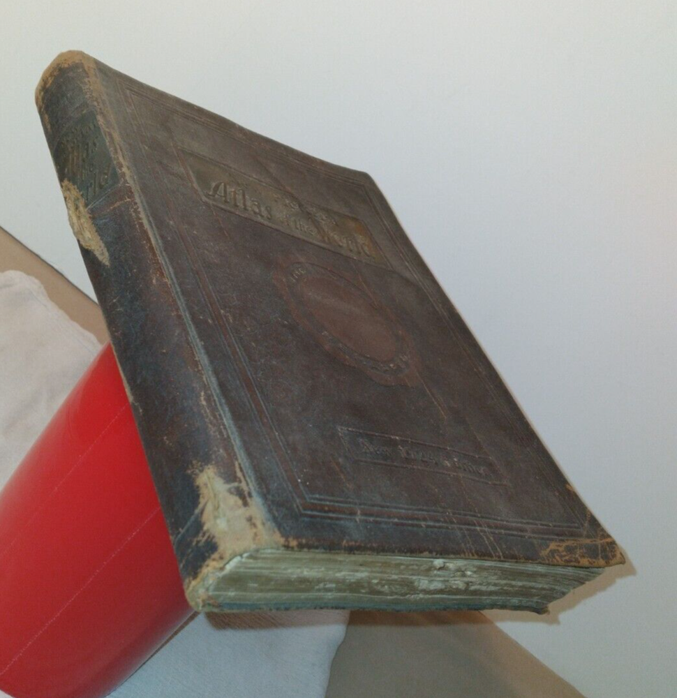 1924 Edition of an Atlas of the World. Lots of photos, several in color. 384 pages plus another 47 of index, Original leather cover, The color illustrations are heavy on World War One content because it had ended just 6 years before this was published. Interesting to see the differences in the civilized world between then and now. ATTENTION!!! This book has been sold and returned recently here on ebay. I felt that the photos, which I have not changed, sufficiently showed the damage it has sustained over a century. Gouges, scrapes, punctures--it looks as if it went through a meat grinder. YET, it is structurally sound, despite a page or three up front being loose. Furthermore, it was written at a time which in hindsight was near the beginning of the spike on the 'hockey stick' graph of human history. Oddly, I can't find the typical copyright information. There is a line or two about photo credits, but no book publisher.