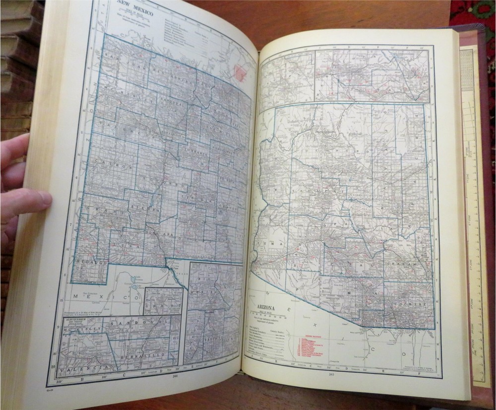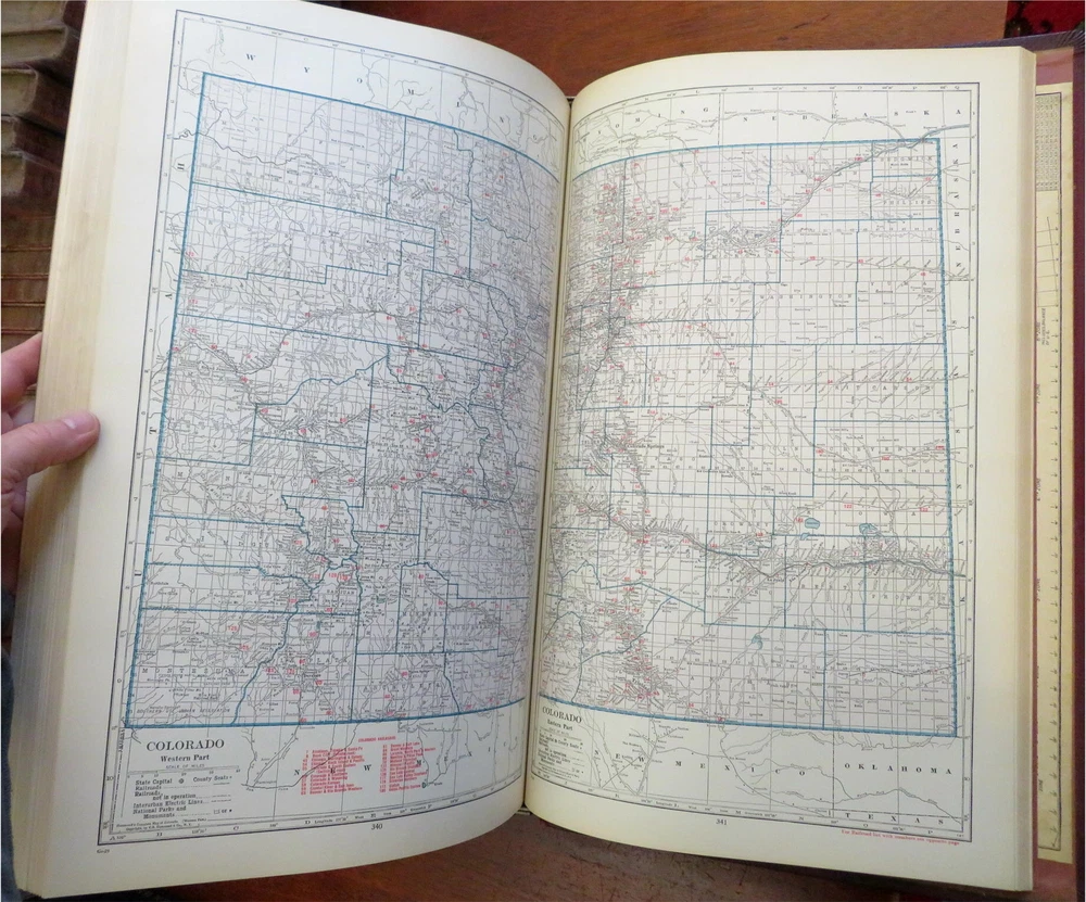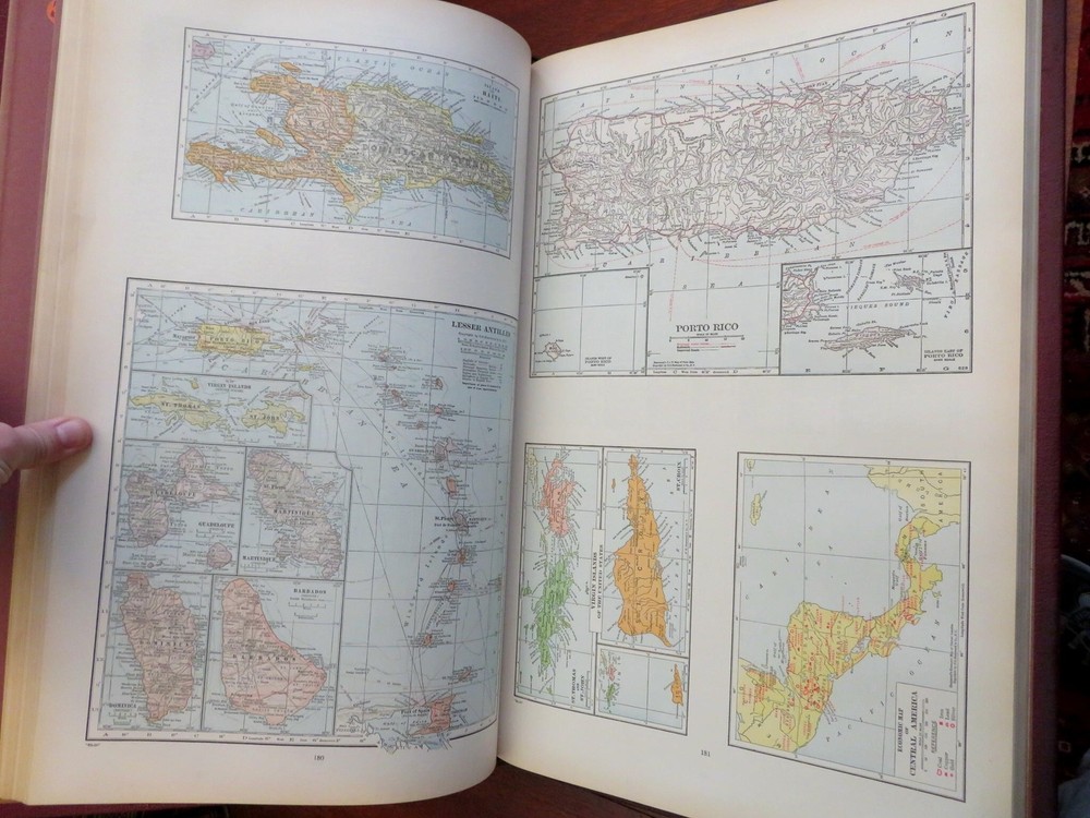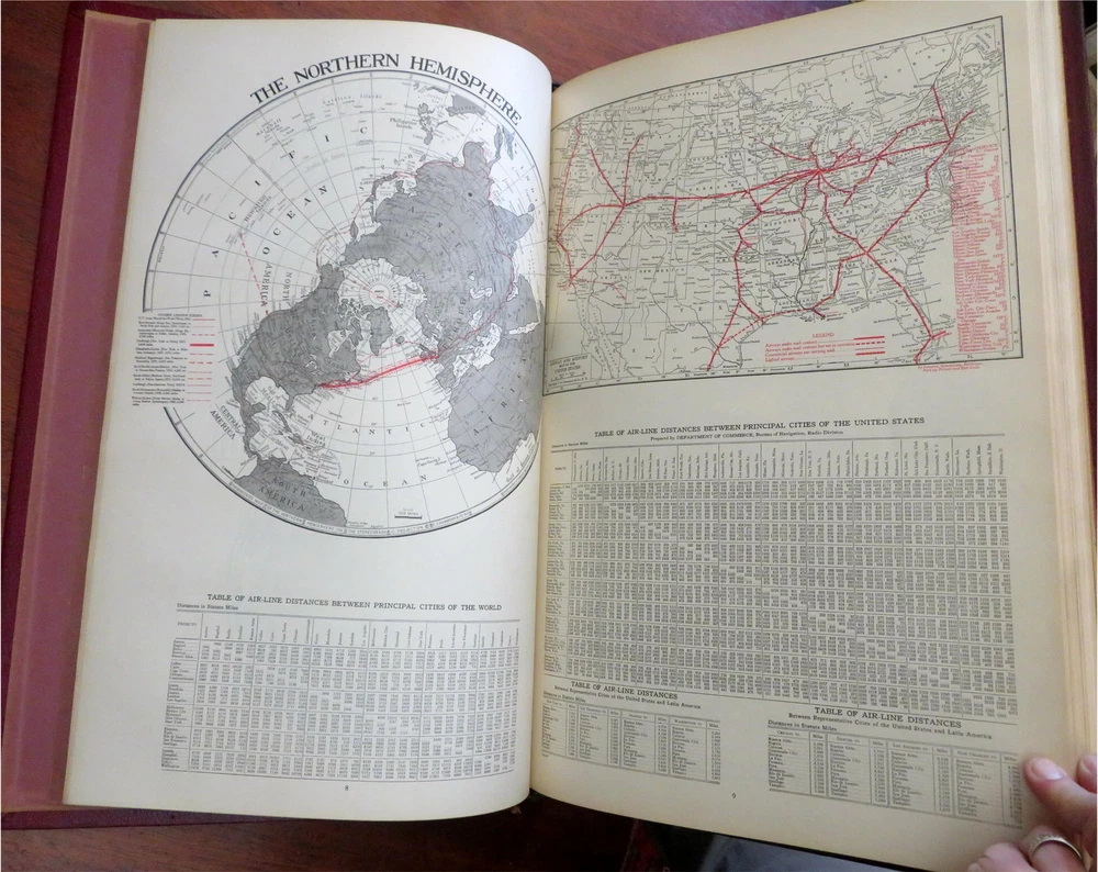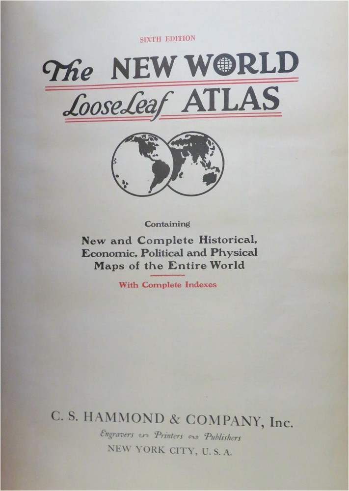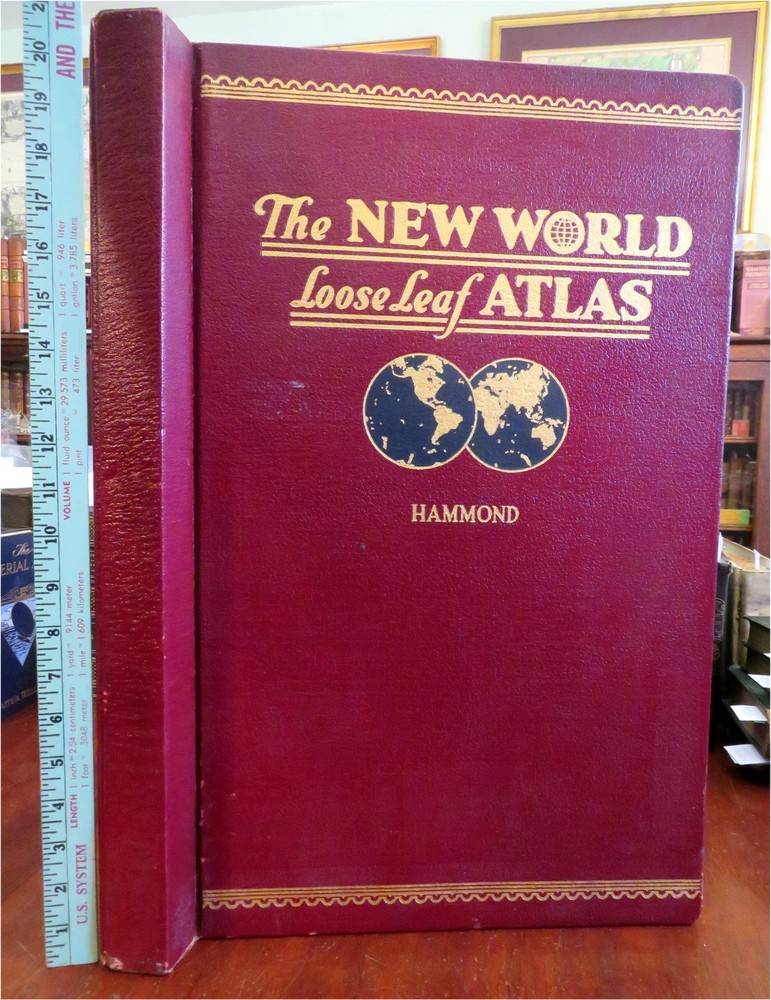New World Loose Leaf Atlas c. 1929 monumental leather atlas 100+ maps New World Loose Leaf Atlas c. 1929 monumental leather atlas 100+ maps (Old Books, Early 20th Century Books, Leather Books, Atlases, Books with Maps). The New World Loose Leaf Atlas: Containing New and Complete Historical, Economic, Political, and Physical Maps of the Entire World, With Complete Indexes. Published c. 1929, New York City by C.S. Hammond & Company Inc. Endless maps, almost certainly well over 200, every single map a loose sheet which is removable. Text in English. Attractive antiquarian full leather binding, gilt title lettering & pictorial cover decorations. Monumental atlas - a large and very heavy book! Book is physically old and shows some signs of handling and time. The atlas was designed to allow for map sheets to be added at any time due to the screw and peg binding. Binding gently age worn but still appealing, joints slightly scuffed but still supple, remains overall clean and attractive as an early 20th century Atlas, issued between the two world wars.. Paper is gently age toned as typical, internally book remains mostly clean, tight and sound. An atlas which has been taken care of but may/ does not look like new. Very expensive in it's day, scarce today. Still attractive on the shelf. Book displays a pleasing and unique age patina and is in rather nice antiquarian condition, any age flaws seem easy to overlook or forgive. Please review photos for more detailed attempt to present this book as it survives. We often over-describe any flaws that many sellers would not even bother to mention since most people would overlook them as minor and unworthy of comment. Many people tell us the books they receive from us are nicer in person than it appears on the screen. We want you to be clear about what you are buying, so we take clear photos and try to describe it clearly. Book Measures c. 21" H x 14 1/4" W. [B5380].