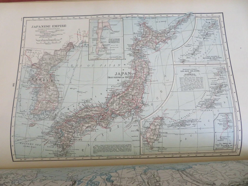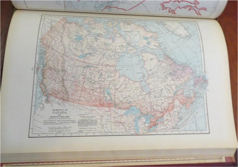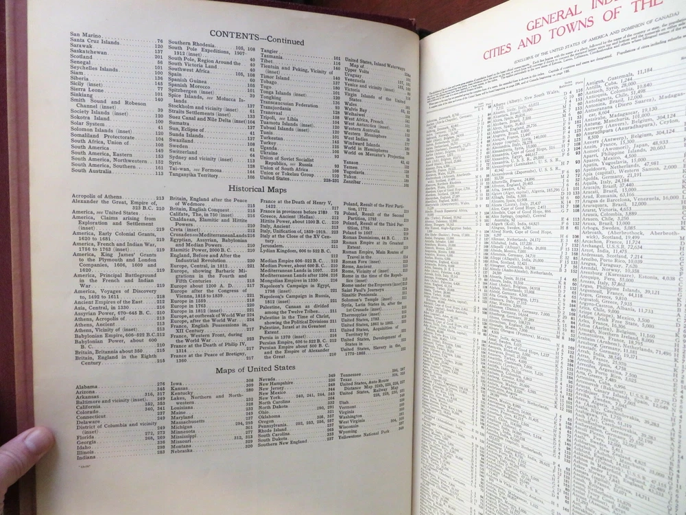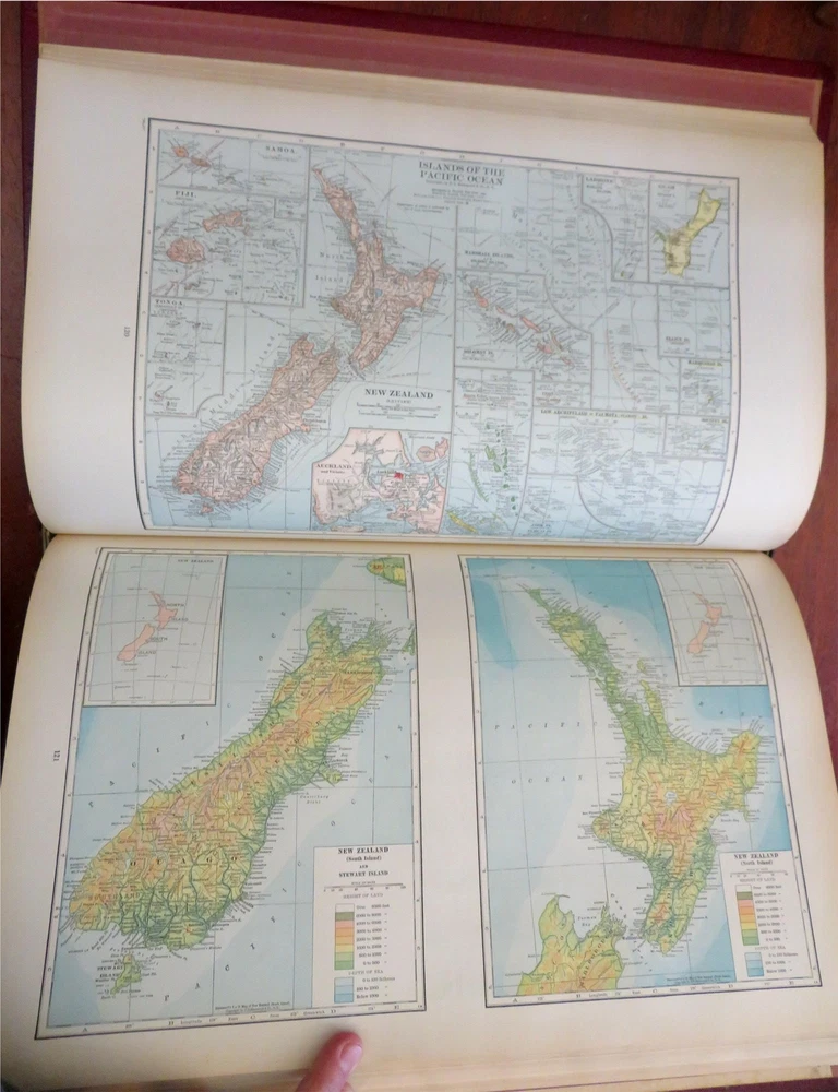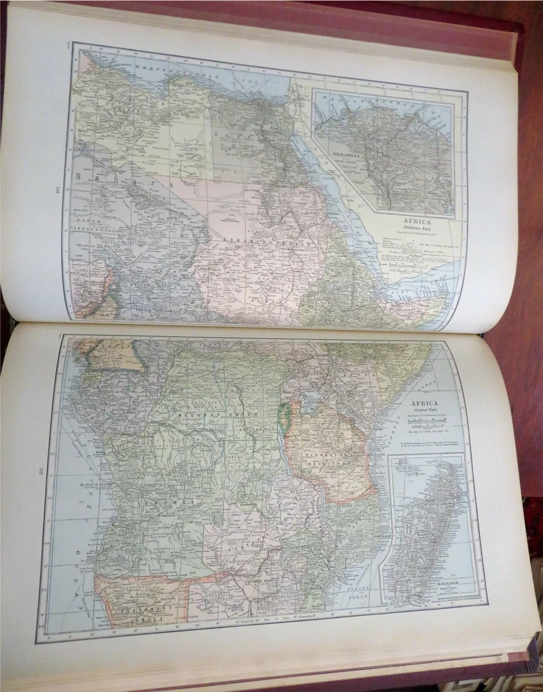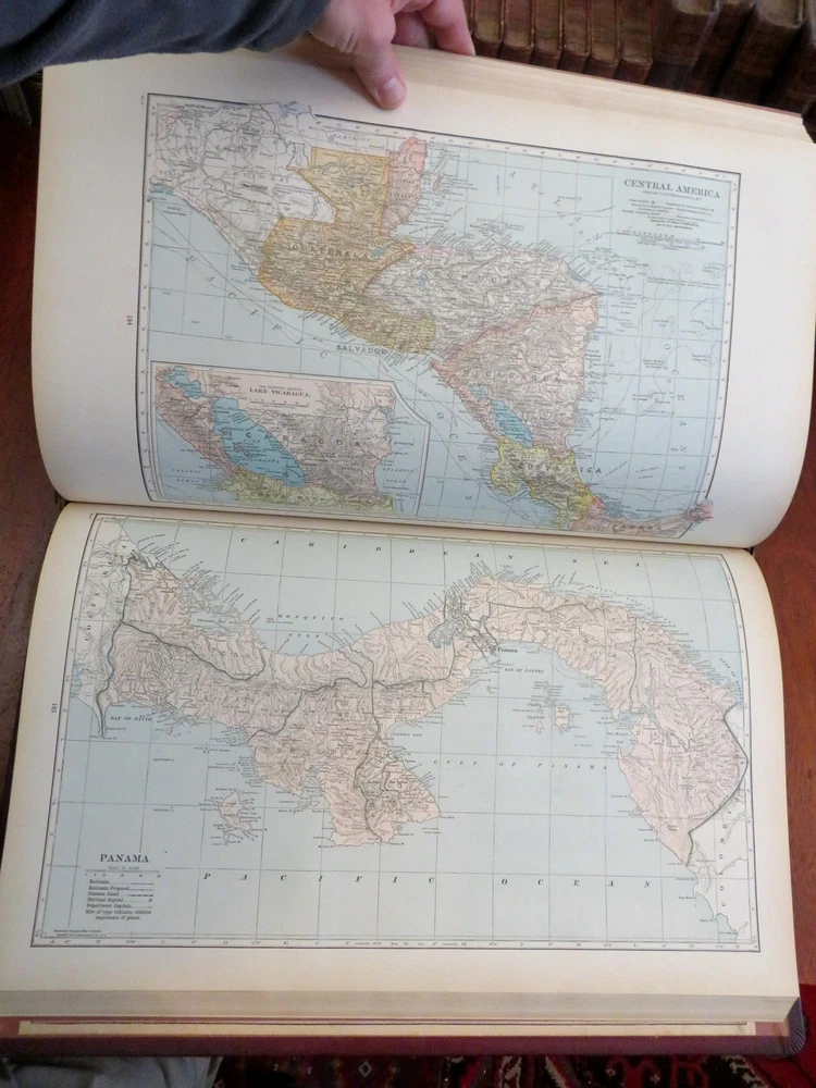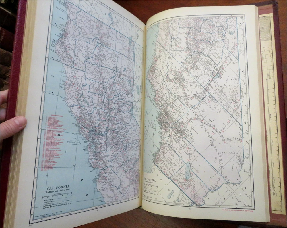 New World Loose Leaf Atlas c. 1929 monumental leather atlas 100+ maps New World Loose Leaf Atlas c. 1929 monumental leather atlas 100+ maps (Old Books, Early 20th Century Books, Leather Books, Atlases, Books with Maps). The New World Loose Leaf Atlas: Containing New and Complete Historical, Economic, Political, and Physical Maps of the Entire World, With Complete Indexes. Published c. 1929, New York City by C.S. Hammond & Company Inc. Endless maps, almost certainly well over 200, every single map a loose sheet which is removable. Text in English. Attractive antiquarian full leather binding, gilt title lettering & pictorial cover decorations. Monumental atlas - a large and very heavy book! Book is physically old and shows some signs of handling and time. The atlas was designed to allow for map sheets to be added at any time due to the screw and peg binding. Binding gently age worn but still appealing, joints slightly scuffed but still supple, remains overall clean and attractive as an early 20th century Atlas, issued between the two world wars.. Paper is gently age toned as typical, internally book remains mostly clean, tight and sound. An atlas which has been taken care of but may/ does not look like new. Very expensive in it's day, scarce today. Still attractive on the shelf. Book displays a pleasing and unique age patina and is in rather nice antiquarian condition, any age flaws seem easy to overlook or forgive. Please review photos for more detailed attempt to present this book as it survives. We often over-describe any flaws that many sellers would not even bother to mention since most people would overlook them as minor and unworthy of comment. Many people tell us the books they receive from us are nicer in person than it appears on the screen. We want you to be clear about what you are buying, so we take clear photos and try to describe it clearly. Book Measures c. 21" H x 14 1/4" W. [B5380].