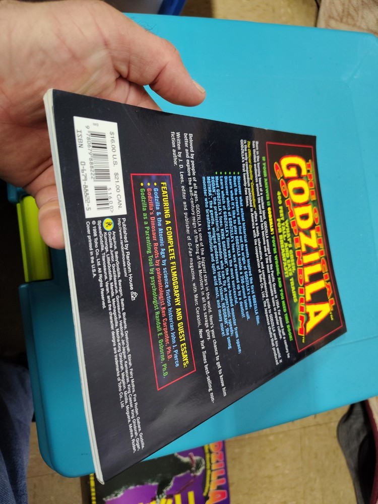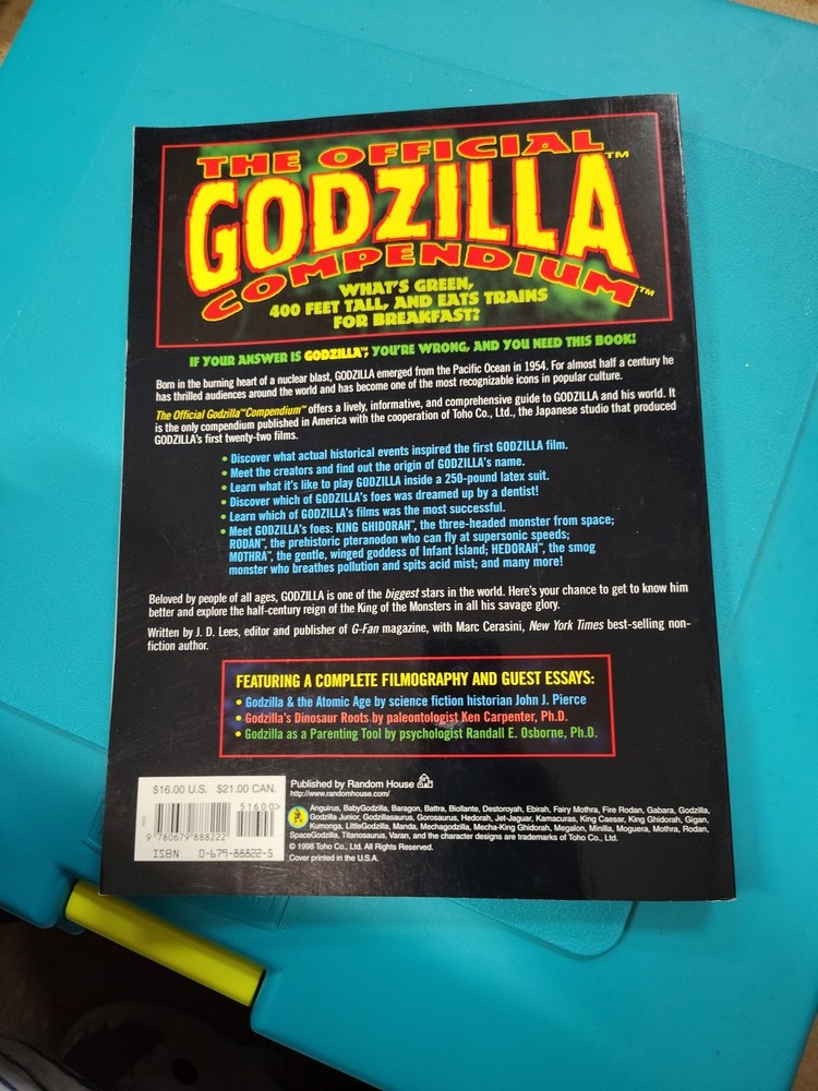 The "Official Godzilla Compendium : A 40 Year Retrospective" by M. Cerasini, Marc Lees is a trade paperback book published by Random House Children's Books in 1998. It is a 144-page book in English, featuring illustrations and discussing topics related to performing arts, fiction, science fiction, and the history and criticism of films.