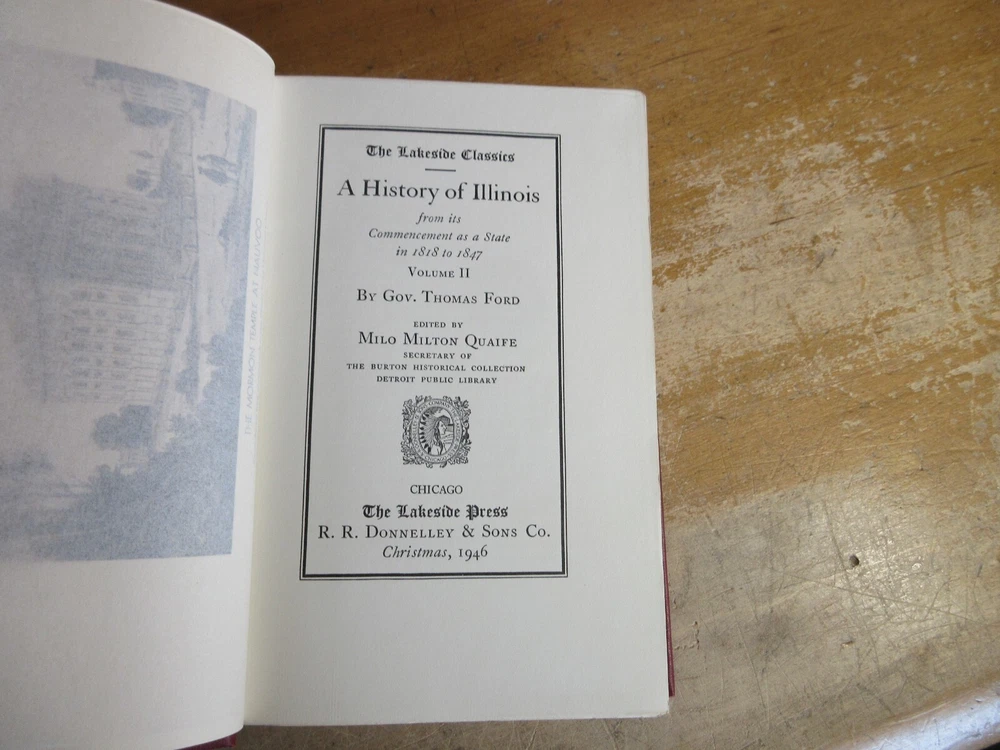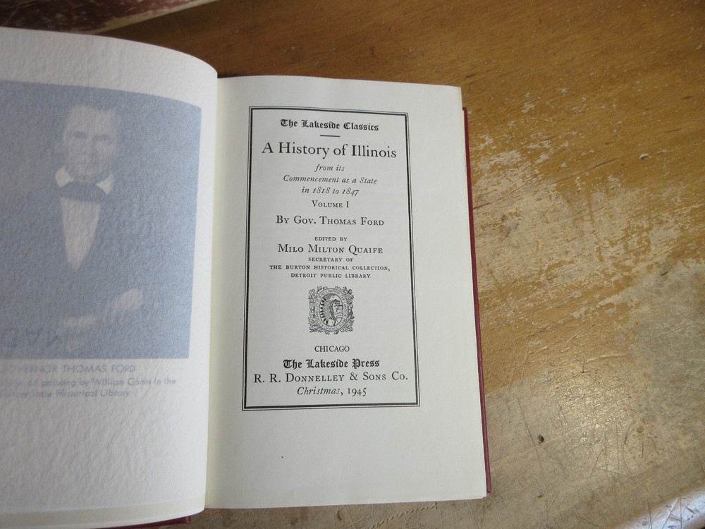 Here is a very interesting and hard to find set of “The Lakeside Classics. A History of Illinois From Its Commencement as a State in 1818 to 1847” by Gov. Thomas Ford, edited by Milo Milton Quaife, in 2 volumes, Volume 1 published in 1945 and Volume 2 published in 1946. These books are in good condition, some cover and spine wear, tight bindings and hinges, pages are fairly clean. Check out some of the interesting contents in these books! They measure approximately 4 ½” x 7” and contain 374 and 371 pages. A great set for any collection! I will be starting more $.99 book auctions every night. There are many books on medicine, agriculture, manufacturing, illustrated books, maps, American history, ancient history, religion, philosophy, animals, science, etc. I'm happy to combine shipping. Be sure to check out my other items!!