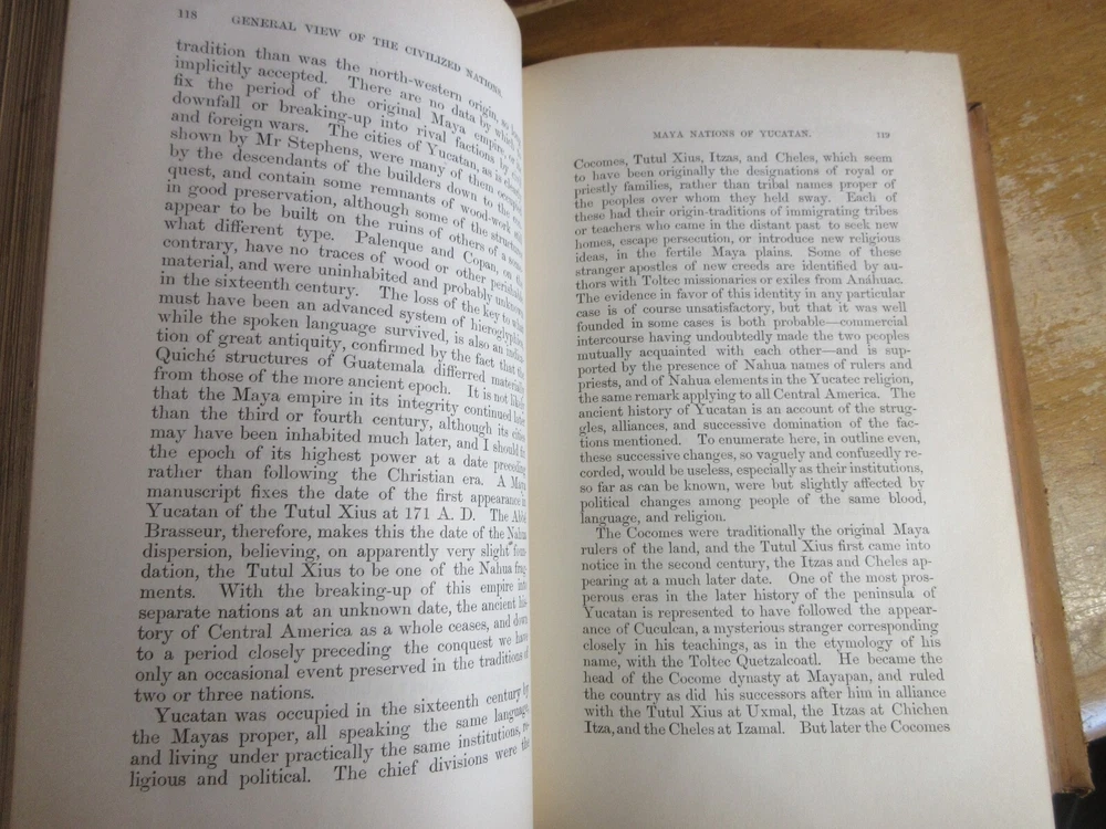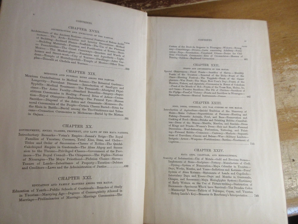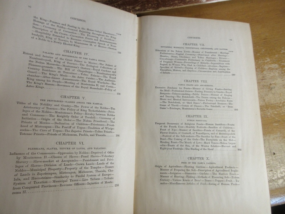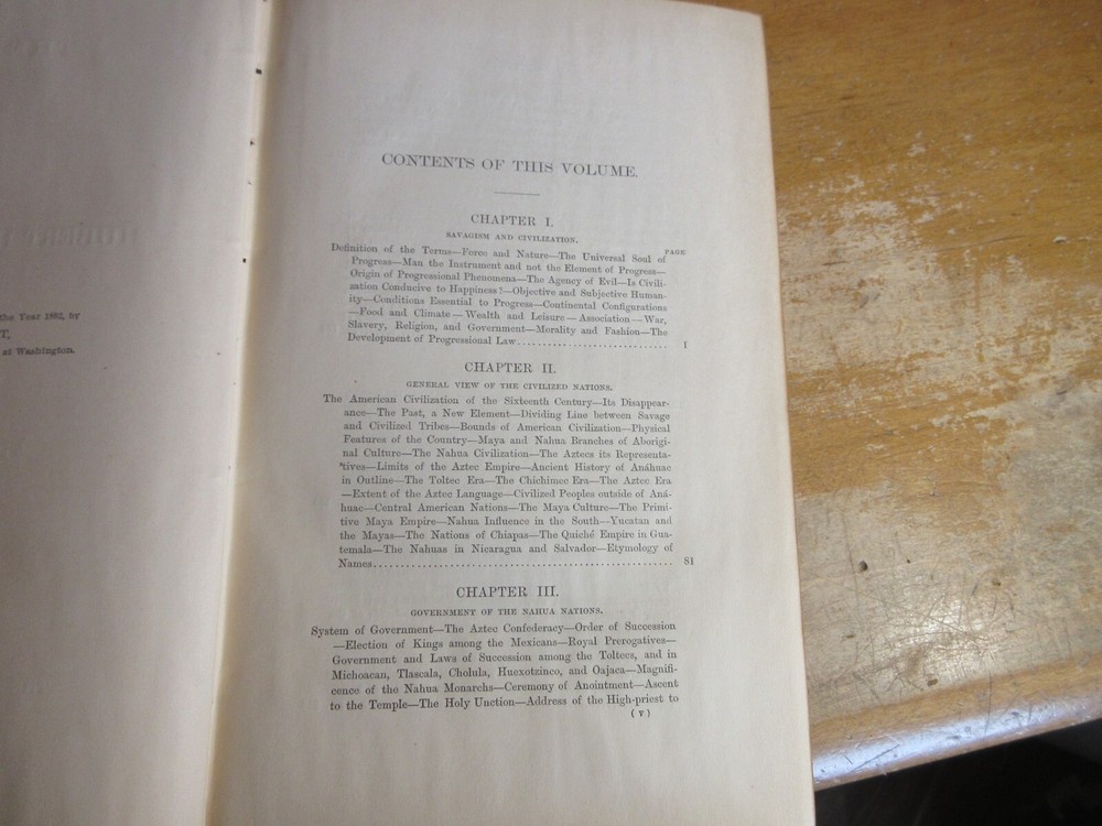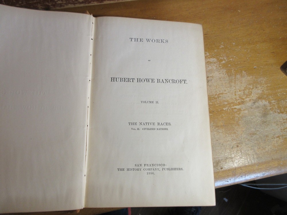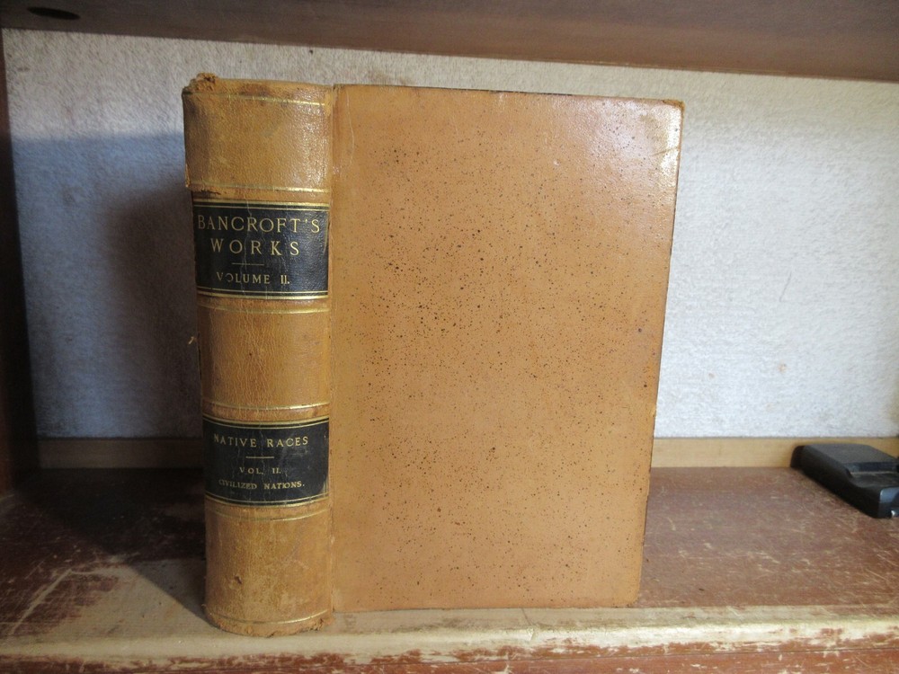 Here is a very interesting and hard to find copy of “The Native Races. Vol. II. Civilized Nations” by Hubert Howe Bancroft, published in 1886. This leather bound book is in fair condition, some spine wear, the cover hinges are split and the covers are almost detached, tight binding, pages are fairly clean. Check out some of the interesting contents in this book! It measures approximately 6 ½” x 9 ¼” and contains 805 pages. A great book for any collection! I will be starting more $.99 book auctions every night. There are many books on medicine, agriculture, manufacturing, illustrated books, maps, American history, ancient history, religion, philosophy, animals, science, etc. I'm happy to combine shipping. Be sure to check out my other items!!