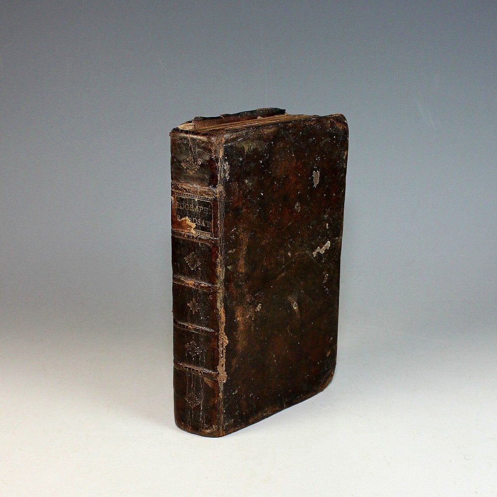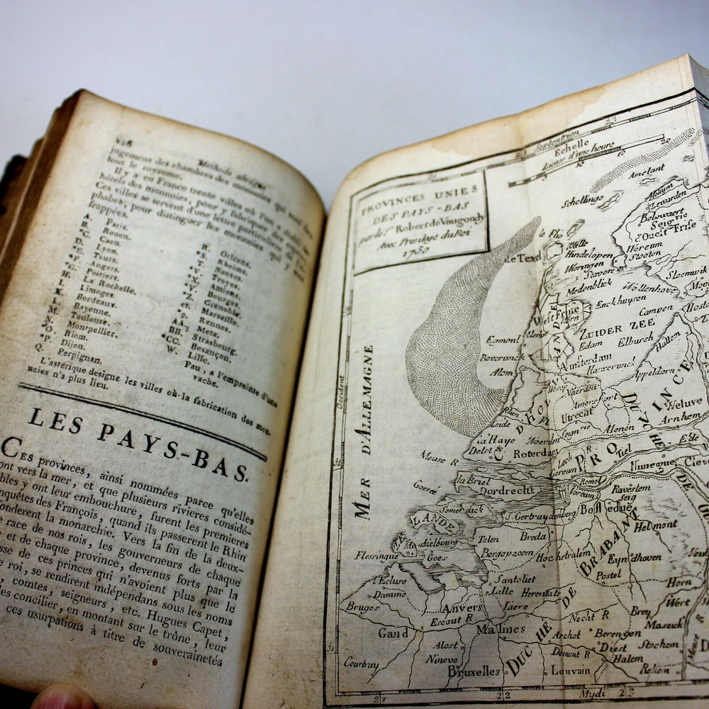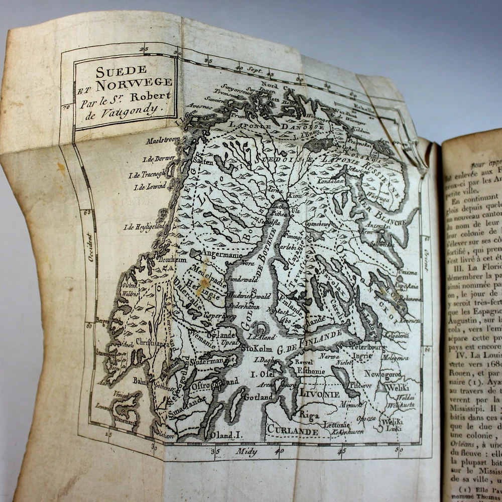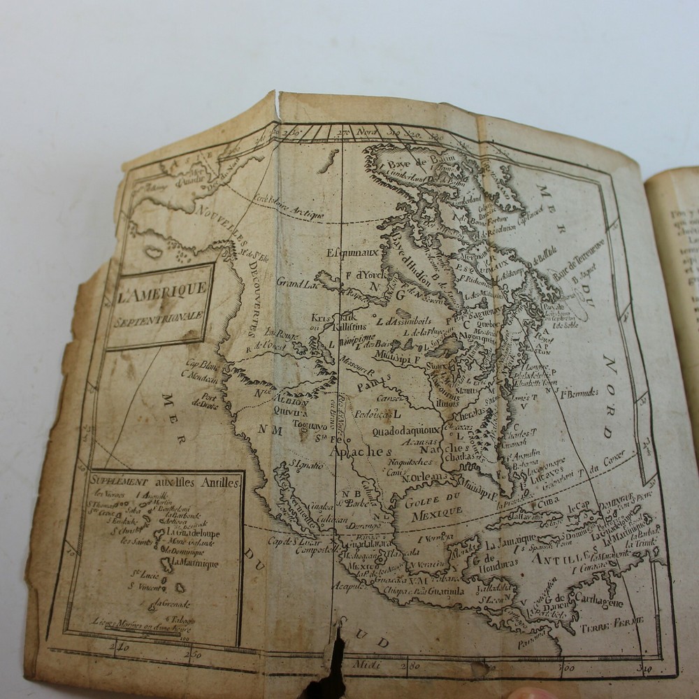 This book was found in France in a large box of religious books of the same period. This Methode Abregee et Facile pour apprendre la Geography is directed in the prologue to a French lady, who apparently wanted to learn the Geography of the world. The book is well put together, both physically and in method. It lists the various countries and continents with 12 folded maps at the beginning of each chapter. The chapters describe the country or continent and the current government at the time as well as some of the characteristics of the country/continent. The maps are as follows: Europe, France (torn), Provences Unies des Pays Bas (Netherlands)Spain/Portugal, British Isles (1/2 missing), Poland, Russia (part missing), Africa, Asia, America, Sweden/Norway and South America. In the end of the book is also a table of principal towns with their longitude and latitudes. The book is in fair condition, with binding tight and the leather cover intact. All of it shows the considerable age of this book with some toning and spotting, but mostly the pages are in good to very good condition. To my eye the maps may not be correct to the topography of today, which makes the book all the more interesting. Book is 380 pages with front fly page possibly missing.
