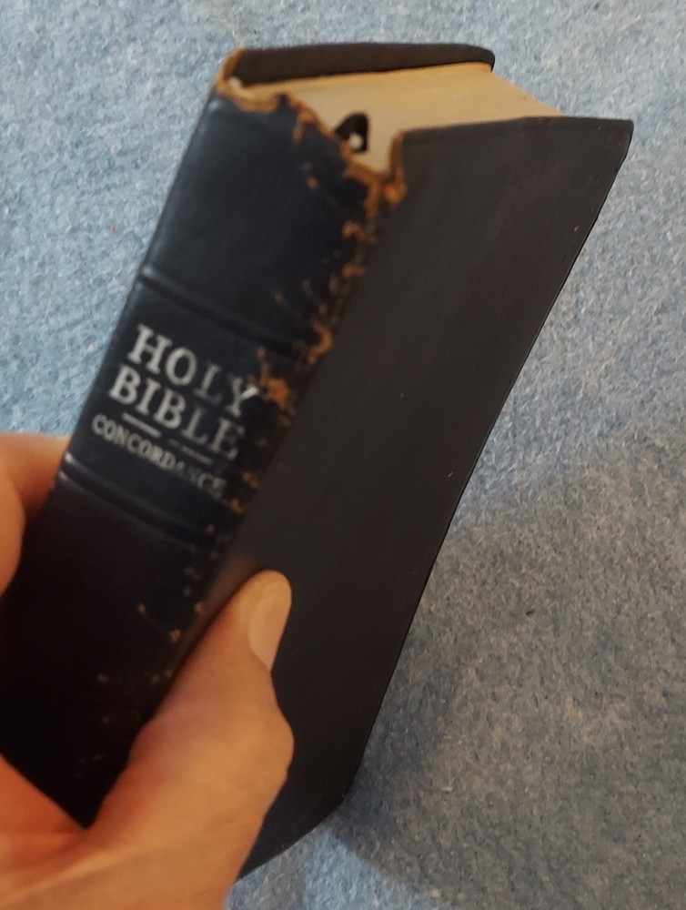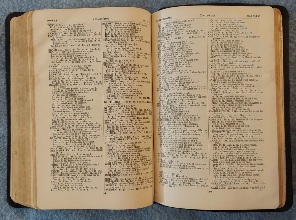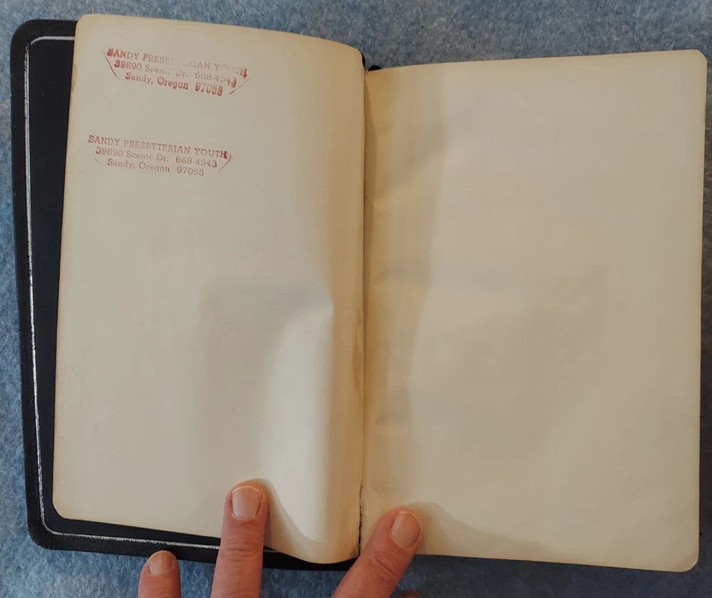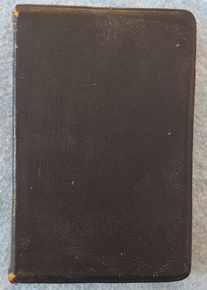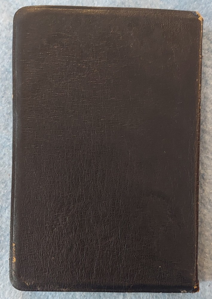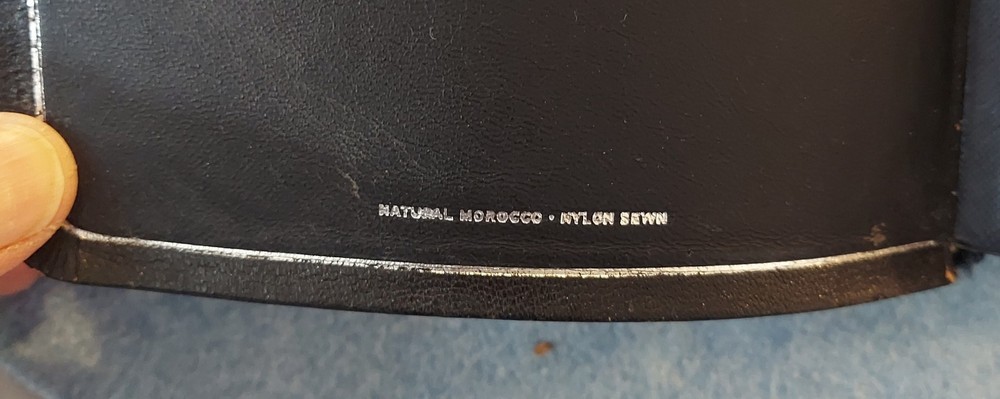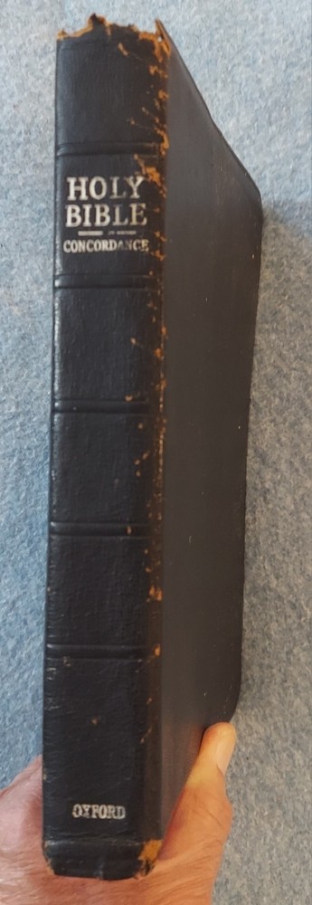 Oxford Morocco Leather King James Holy Bible KJV References Concordance Maps THE OXFORD SELF-PRONOUNCING BIBLE THE HOLY BIBLE CONTAINING THE OLD AND NEW TESTAMENTS TRANSLATED OUT OF THE ORIGINAL TONGUES AND WITH THE FORMER TRANSLATIONS DILIGENTLY COMPARED AND REVISED BY HIS MAJESTY’S SPECIAL COMMAND Appointed to be read in Churches AUTHORIZED KING JAMES VERSION With Chain References CUM PRIVILEGIO OXFORD: PRINTED AT THE UNIVERSITY PRESS Long Primer 8vo Refs. India Paper Printed in Great Britain at the University Press, Oxford Oxford model code on a back page: 271M No. 02500x Cover: NATURAL MOROCCO - NYLON SEWN, black OXFORD FLEXIBLE BINDING Size: 6 x 9 x 1 ¼ inches Pages: Old & New Testaments, 1264; Dictionary of Scripture Proper Names, Subject-Index, Concordance, 246; Index to Maps, 5; The New Oxford Bible Maps, 16 See the photo with the coin to judge the size of the print. Features Center-column references and Footnotes (cross-references, translation notes) Topical page headings Study Helps Dictionary of Scripture Proper Names Subject-Index Concordance Index to Bible Maps The New Oxford Bible Maps Gold finish on the page edges This Bible is in good condition. There are two church stamps inside the first page. The presentation page is filled out with names and date (1972), also the family information pages. The title page is a bit torn. Marks are observed on 24 pages (mainly neat underlining) and some notes on a couple otherwise blank pages near the back of the Bible. There is a light stain at the edge of a number of pages near the back of the Bible. Please see the photos. There are a number of bumped/bent page corners. There are several pages with a crease at the corners. The cover has a bit of general shelf/edge wear with more noticeable wear on the spine, especially at the top where there are some gaps/voids. Again, please see the photos. The gold finish on the page edges is a bit worn and scuffed.