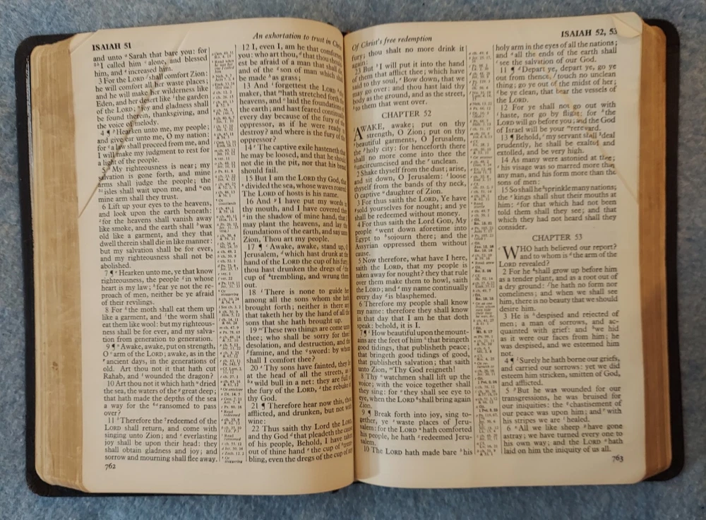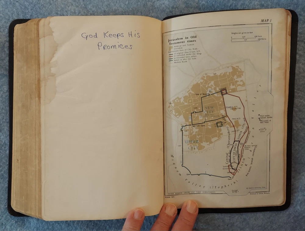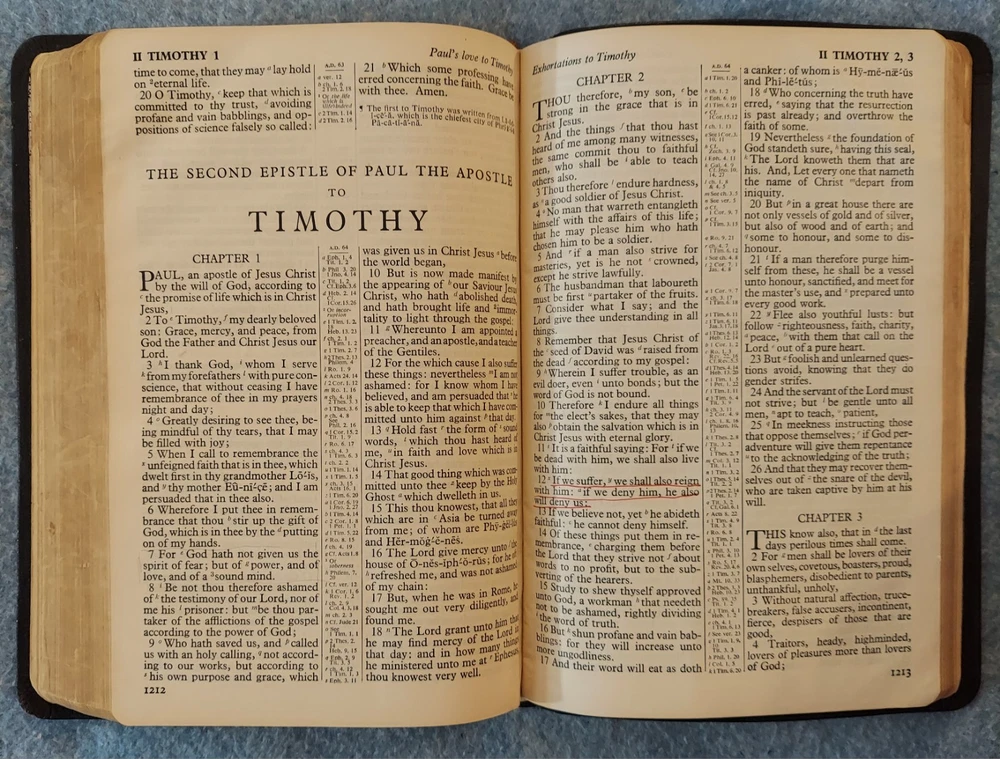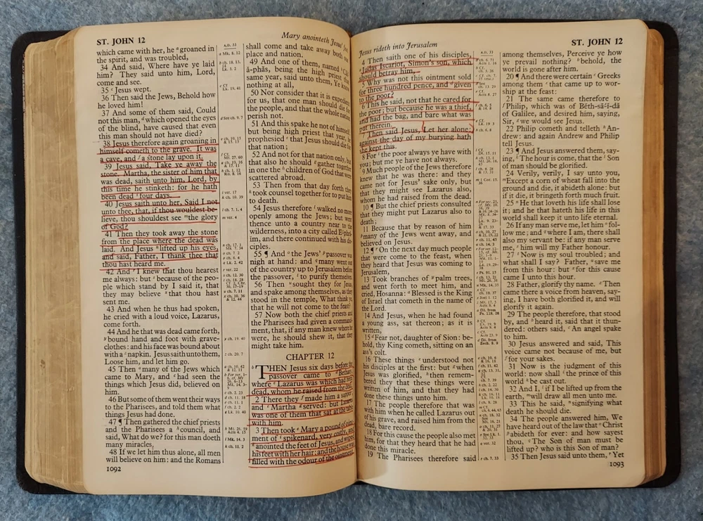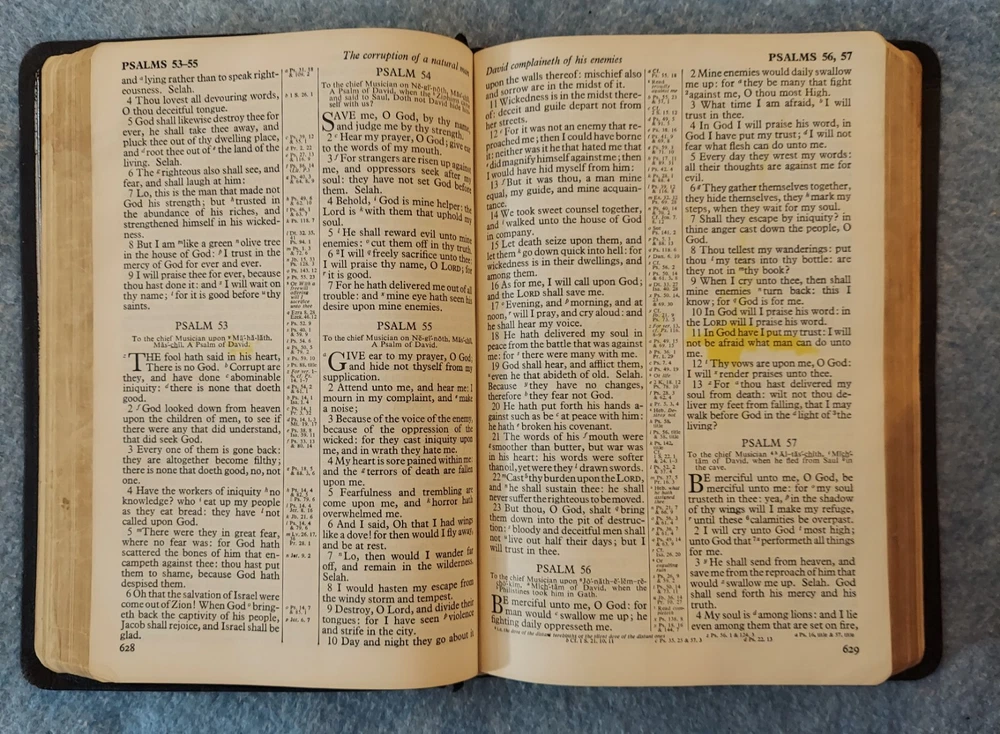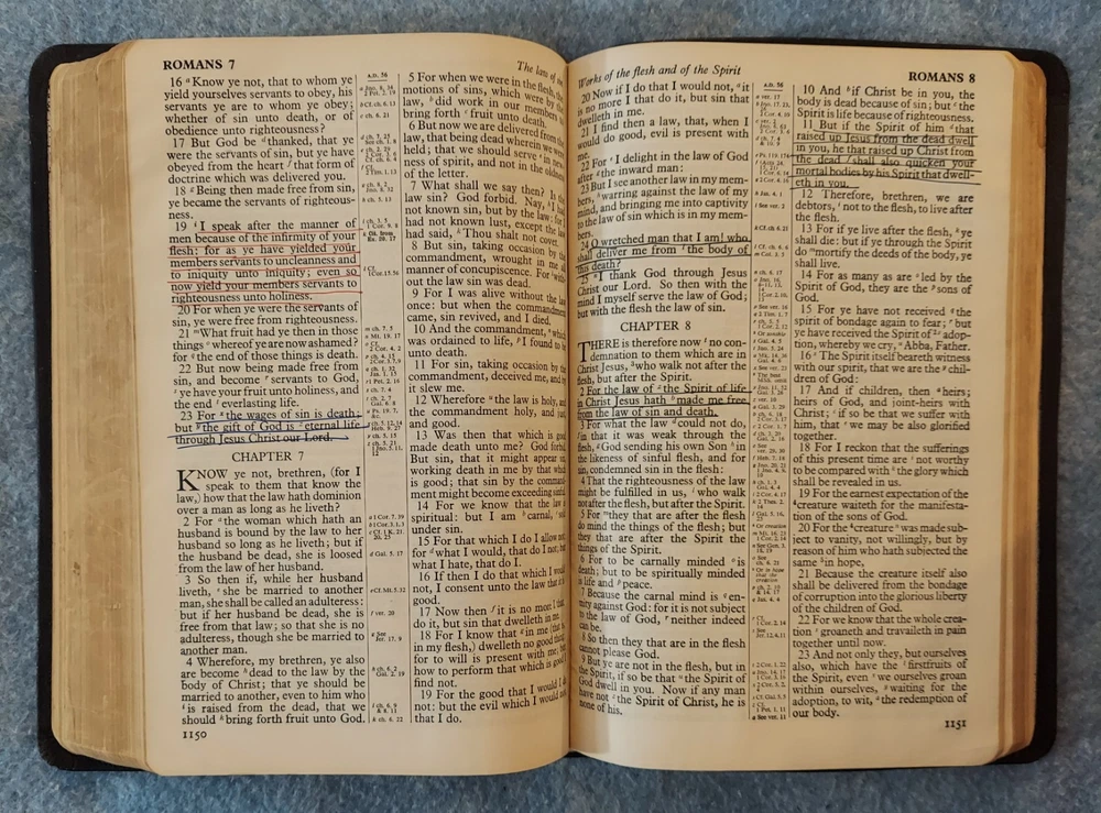 Oxford Morocco Leather King James Holy Bible KJV References Concordance Maps THE OXFORD SELF-PRONOUNCING BIBLE THE HOLY BIBLE CONTAINING THE OLD AND NEW TESTAMENTS TRANSLATED OUT OF THE ORIGINAL TONGUES AND WITH THE FORMER TRANSLATIONS DILIGENTLY COMPARED AND REVISED BY HIS MAJESTY’S SPECIAL COMMAND Appointed to be read in Churches AUTHORIZED KING JAMES VERSION With Chain References CUM PRIVILEGIO OXFORD: PRINTED AT THE UNIVERSITY PRESS Long Primer 8vo Refs. India Paper Printed in Great Britain at the University Press, Oxford Oxford model code on a back page: 271M No. 02500x Cover: NATURAL MOROCCO - NYLON SEWN, black OXFORD FLEXIBLE BINDING Size: 6 x 9 x 1 ¼ inches Pages: Old & New Testaments, 1264; Dictionary of Scripture Proper Names, Subject-Index, Concordance, 246; Index to Maps, 5; The New Oxford Bible Maps, 16 See the photo with the coin to judge the size of the print. Features Center-column references and Footnotes (cross-references, translation notes) Topical page headings Study Helps Dictionary of Scripture Proper Names Subject-Index Concordance Index to Bible Maps The New Oxford Bible Maps Gold finish on the page edges This Bible is in good condition. There are two church stamps inside the first page. The presentation page is filled out with names and date (1972), also the family information pages. The title page is a bit torn. Marks are observed on 24 pages (mainly neat underlining) and some notes on a couple otherwise blank pages near the back of the Bible. There is a light stain at the edge of a number of pages near the back of the Bible. Please see the photos. There are a number of bumped/bent page corners. There are several pages with a crease at the corners. The cover has a bit of general shelf/edge wear with more noticeable wear on the spine, especially at the top where there are some gaps/voids. Again, please see the photos. The gold finish on the page edges is a bit worn and scuffed.