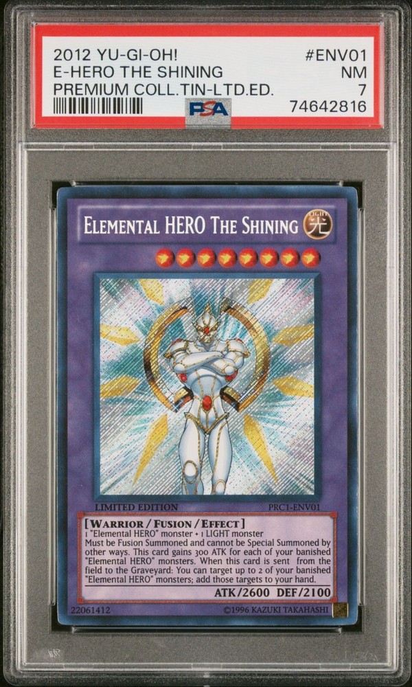 You are purchasing ONE PSA 7 Graded Secret Rare Elemental HERO The Shining Official TCG Yugioh! card. Condition: PSA 7 Shipments: Shipments are made within 2 business days of payment being received. --------------- Delivery delays: Deliveries may not always fall within the estimated delivery dates when shipping outside of Canada. Many factors may contribute to delays in delivering the package such as weather and customs. Please note that delivery to the United States may take up to 3 - 4 weeks to arrive. We always ship out orders within 2 business days and after dropping off with the post office, delivery times are out of our control. Feedback: We will always leave positive feedback for you and we ask if you can do the same for us. If there is any reason why the transaction was not up to your expectations, please message us before leaving feedback so we can address the issue.